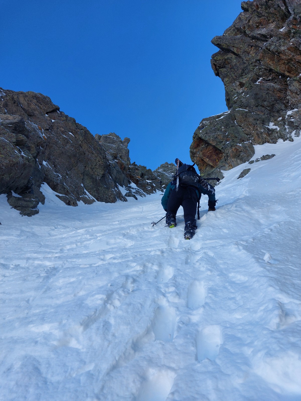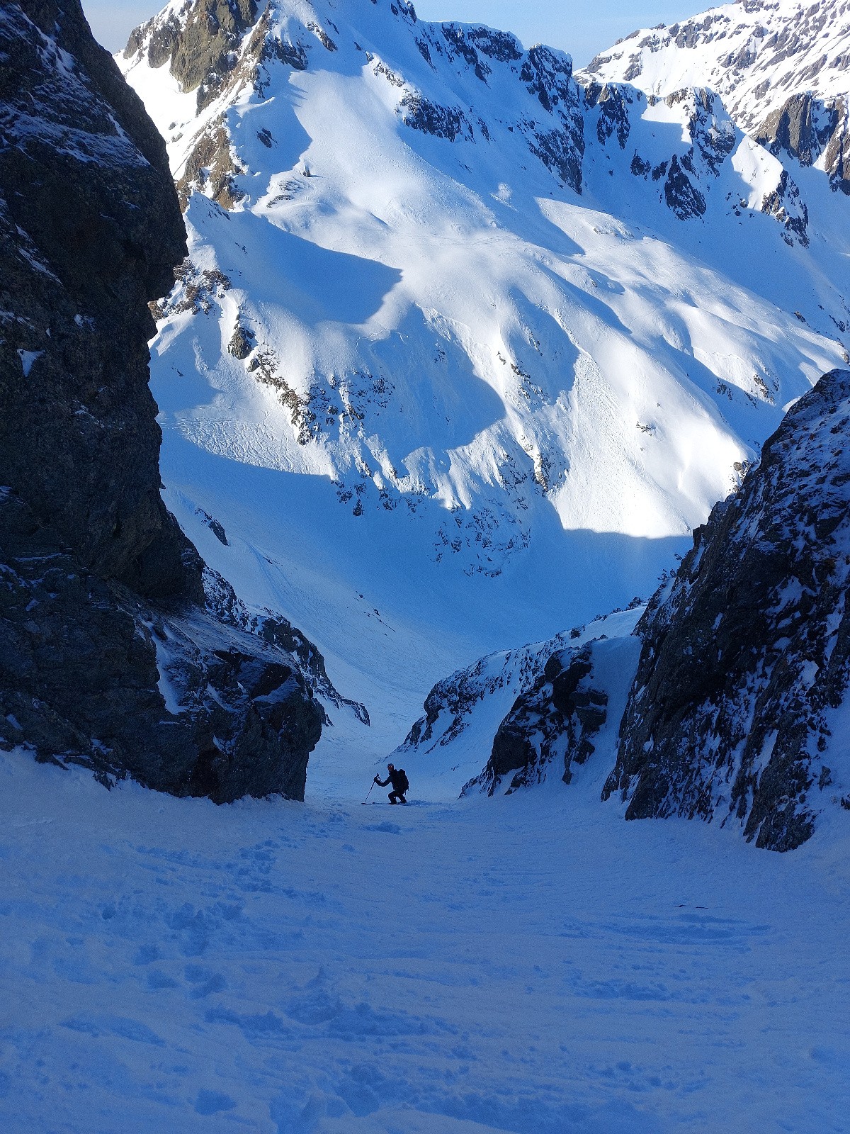 On arrive au pied du couloir. C'est classe, tout droit, et moins impressionnant que dans mes pensées. Une petite étroiture est à négocier, mais ça n'a pas l'air extrême. Bon, eh bien go ! Étienne se lance pour faire la trace, puis on alterne. Je ne suis pas le plus à l'aise là-dedans : il y a quelques passages où l'on brasse dans une neige sans trop de cohésion. Au final, on s'arrête 100 m avant le sommet, sur une sorte d'épaule. La suite de la pente doit être à 40°, mais la configuration ne nous inspirait pas, et la fatigue a aussi joué un peu. On n'a pas tenté le diable, on chausse ici (après avoir remonté plus des 3/4 du couloir).