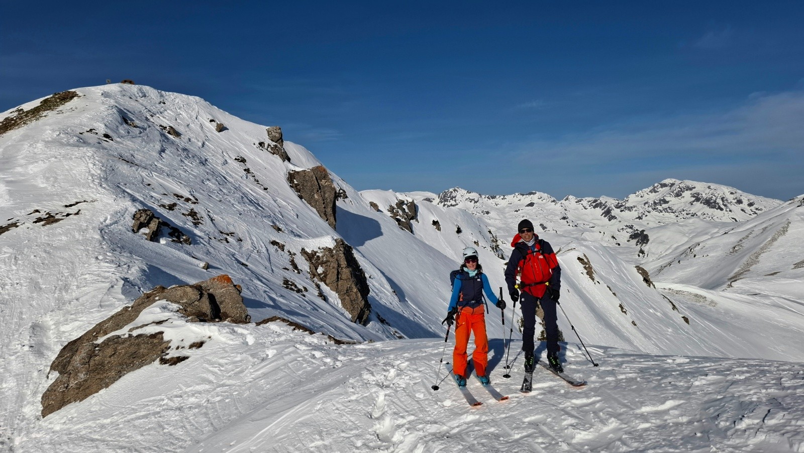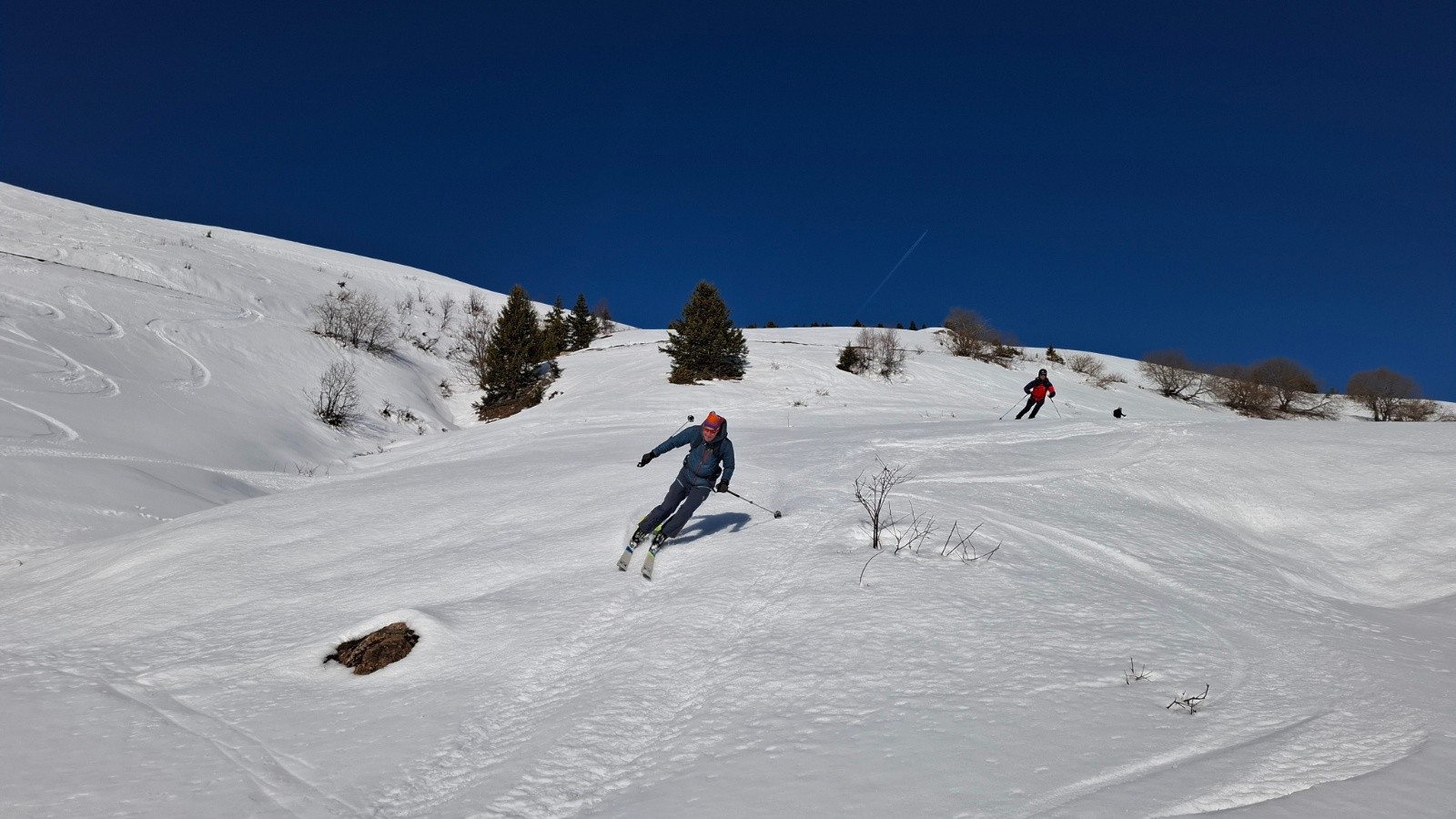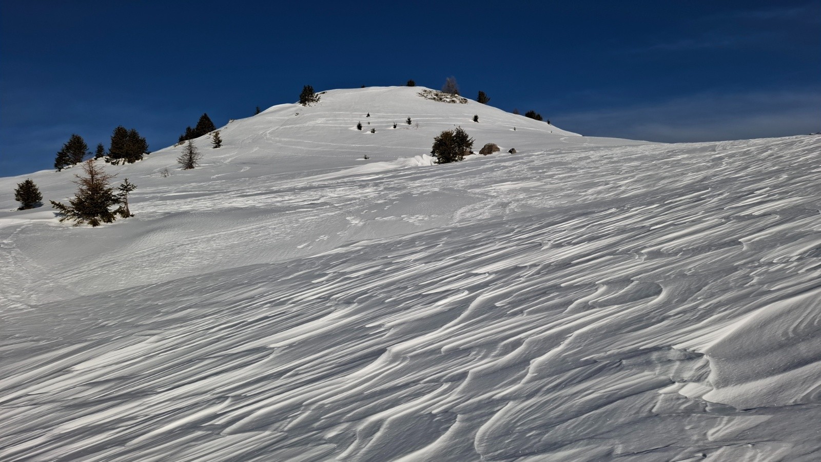 Conditions nivo et activitĂ© avalancheuse : encore poudreux Ă lâabri du vent de SE en forĂȘt, crĂȘtes pelĂ©es, pas de dĂ©gel en S sauf sous 1800m env. Pas d'activitĂ© ce jour sur notre itinĂ©raire