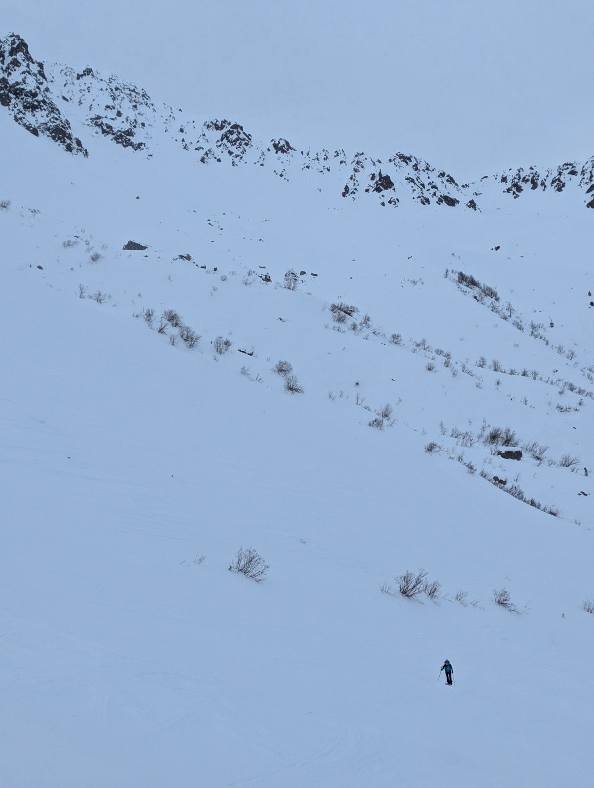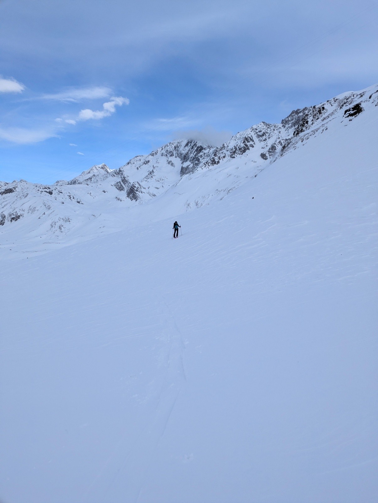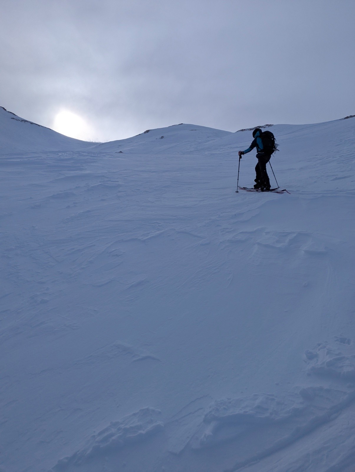 Conditions pour le ski : neige croutée qui a pris le vent, plaque à vent en cours de formation vers le bonhomme