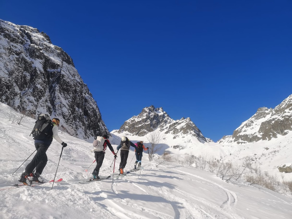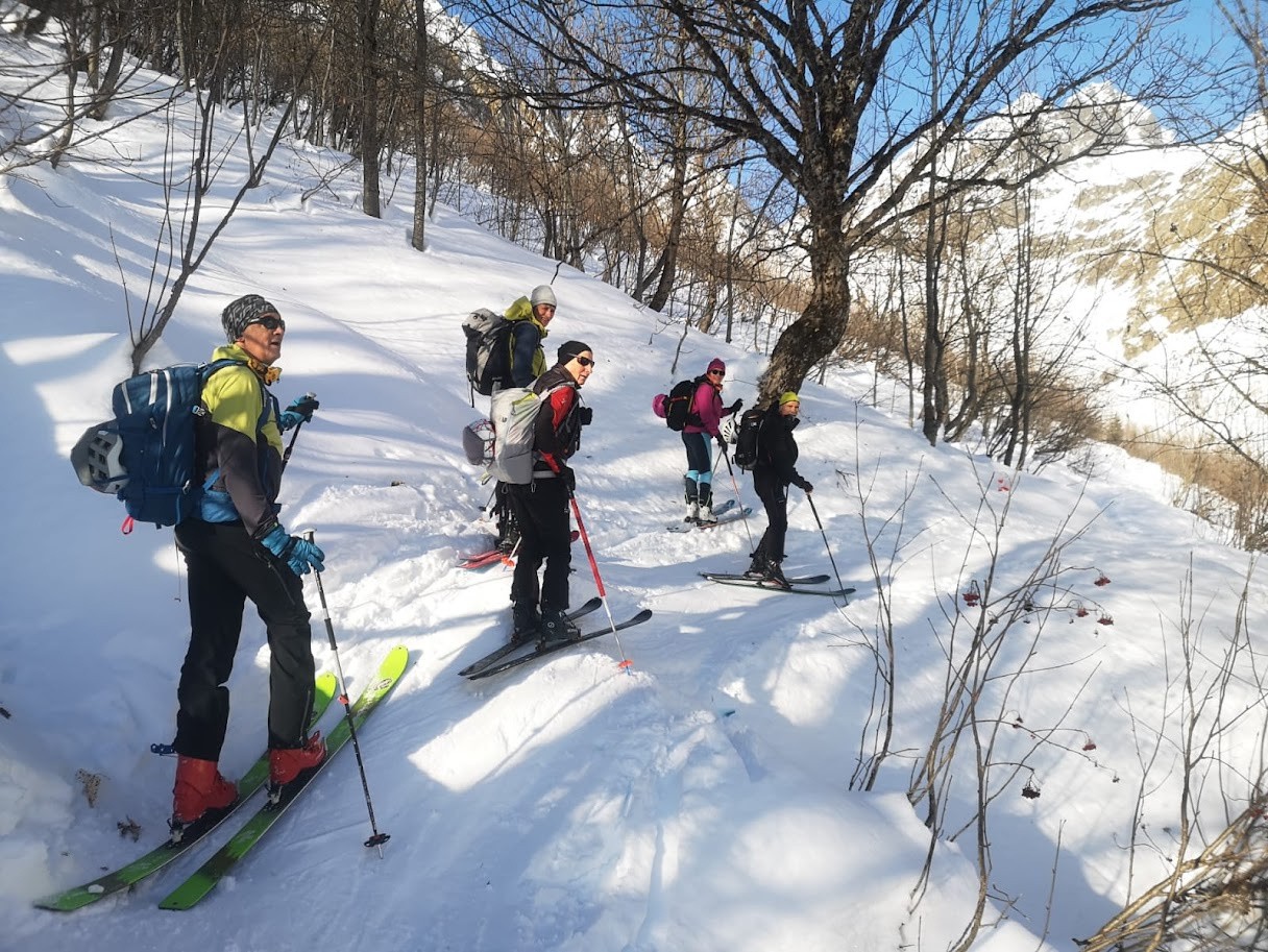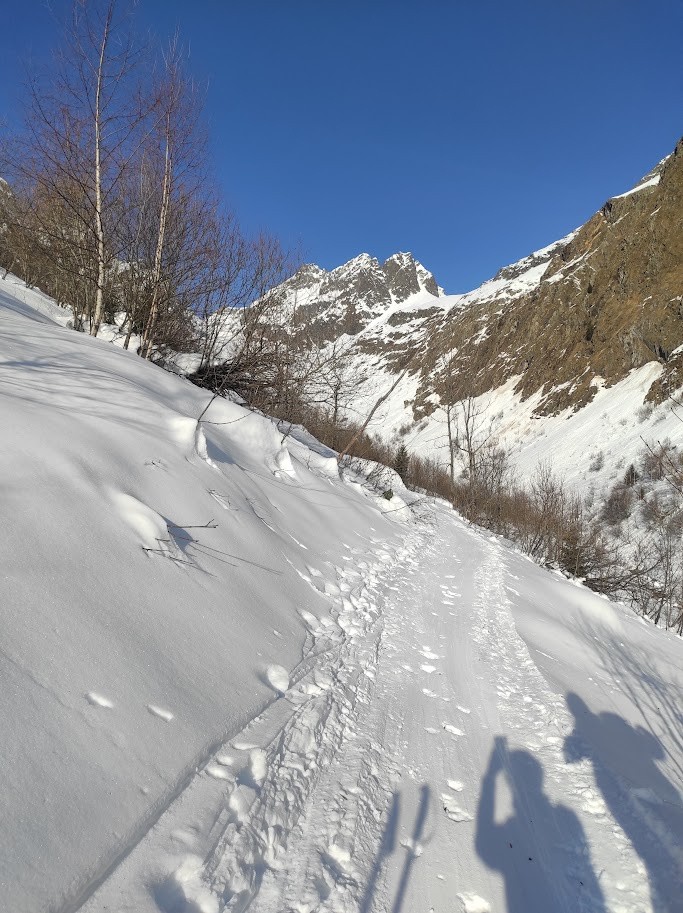 Itinéraire suivi : du Pont des Roches, montée rive droite, glacé au démarrage puis les conditions s'améliorent à partir de 1300m. Avec l'équipe mixte Isère/Savoie, nous serpentons dans la combe des Roches, entre les arbres, les arcosses, joli parcours qui s'ouvre sur les sommets et les différents itinéraires possibles dans ce secteur. On bifurque pour s'engager en direction du vallon du col des Fontaines. Le soleil chauffe le versant, la moquette nous attend. Et ça discute et ça compare les territoires montagnards Isère/Savoie, les itinéraires. Chacun se cale sur le rythme de l'autre, tous ensemble, savoir apprécier ces moments d'amitié qui portent tout au long du voyage, des liens sincères qui comptent dans cet environnement sauvage! qui permettent d'élever sa résistance. Je reste avec mon amie en dessous du col, le reste de l'équipe poursuit et redescend en boucle le vallon du Rocher Verdane. Nous descendons ce versant Sud en très bonne moquette! Ensuite alternance de neige croutée et de neige meilleure.