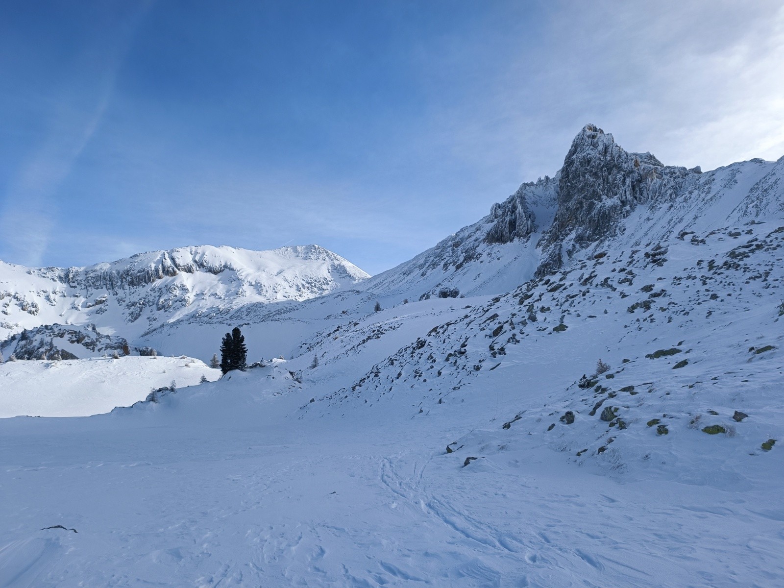 le bas du vallon est faiblement enneigé (au dessous de 2100), les requins guettent.