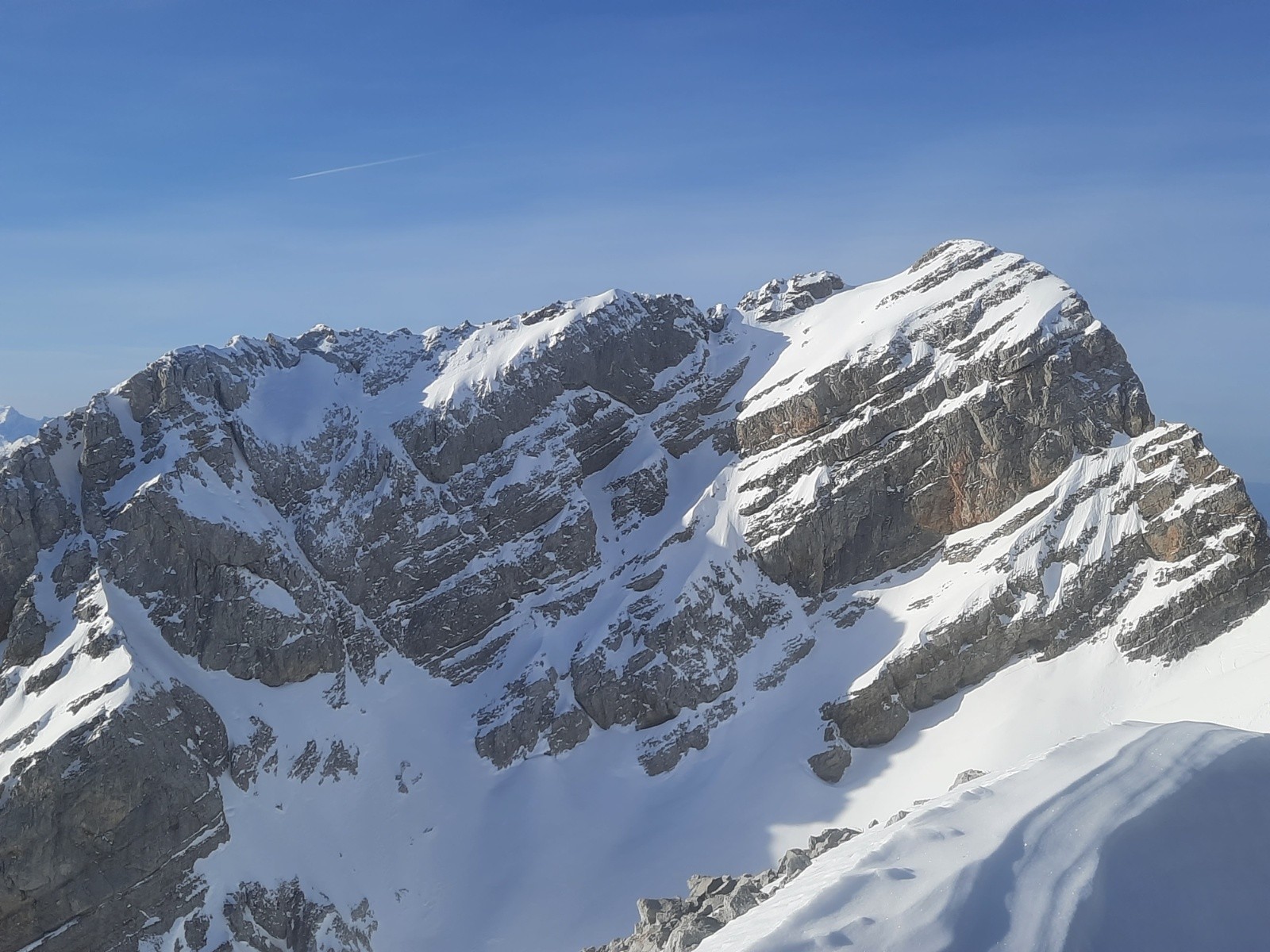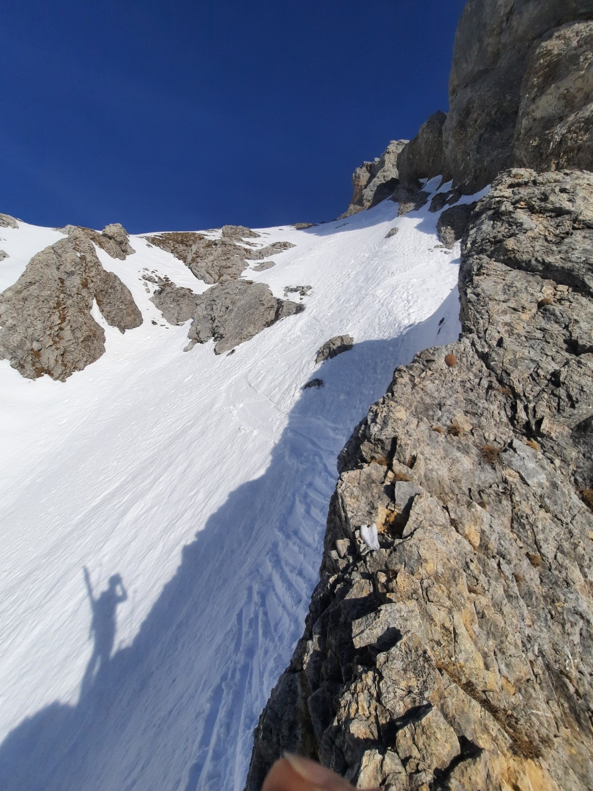Conditions nivo et activité avalancheuse : bon regel pour la montée, dans le petit goulet a l'ombre elle est restee froide et dense sur la partie haute on alterne avec neige dense et legere croite cassznte mais au soleil le decaillage devient agreable. Descente vers 11h45 le bas ramollissait deja fortement, restant tres bon a skier. Sous pointe blanche restes d'escargots coulant de sous les falaises.