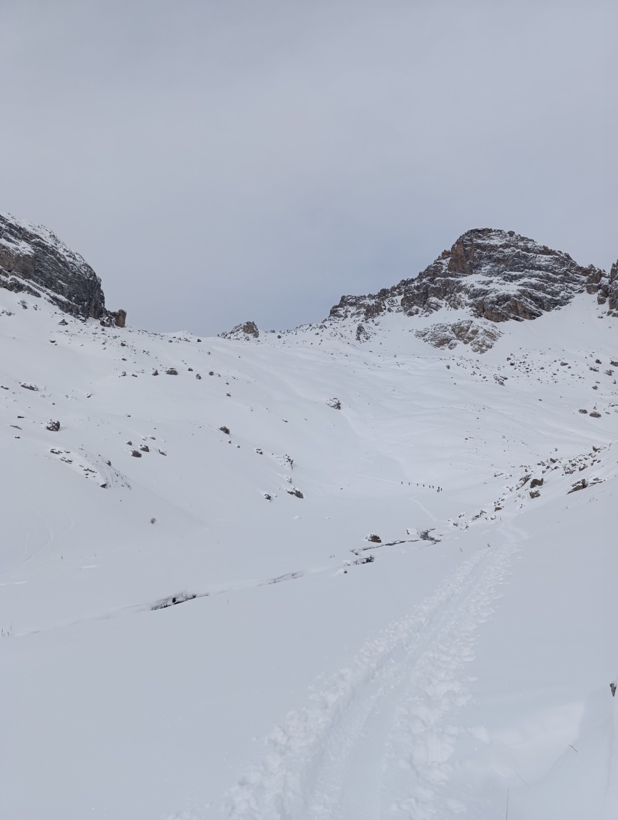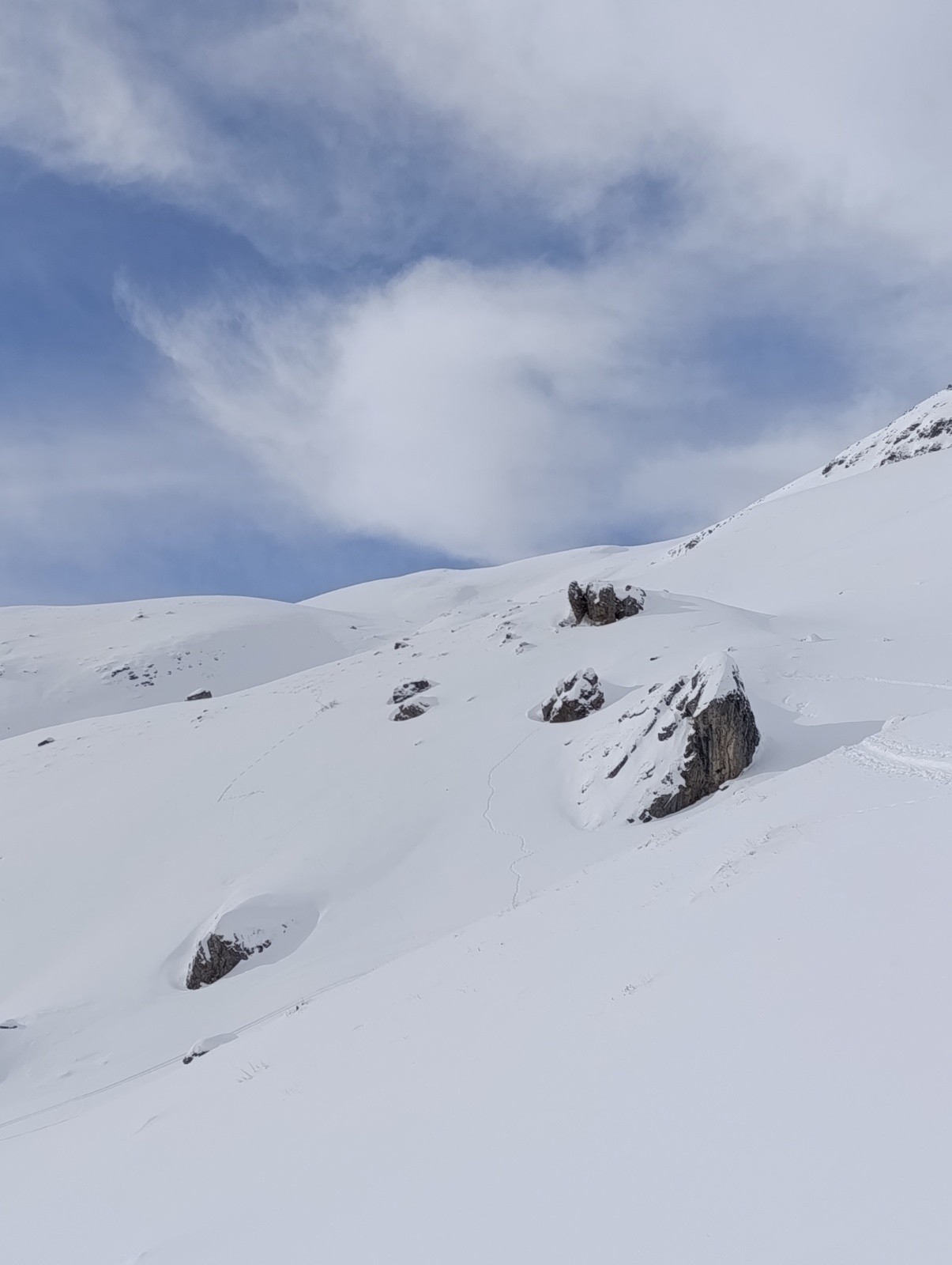 Conditions nivo et activité avalancheuse : rien vu, transport de neige au dessus de 2 000 m. Resté sur des pente < 30°