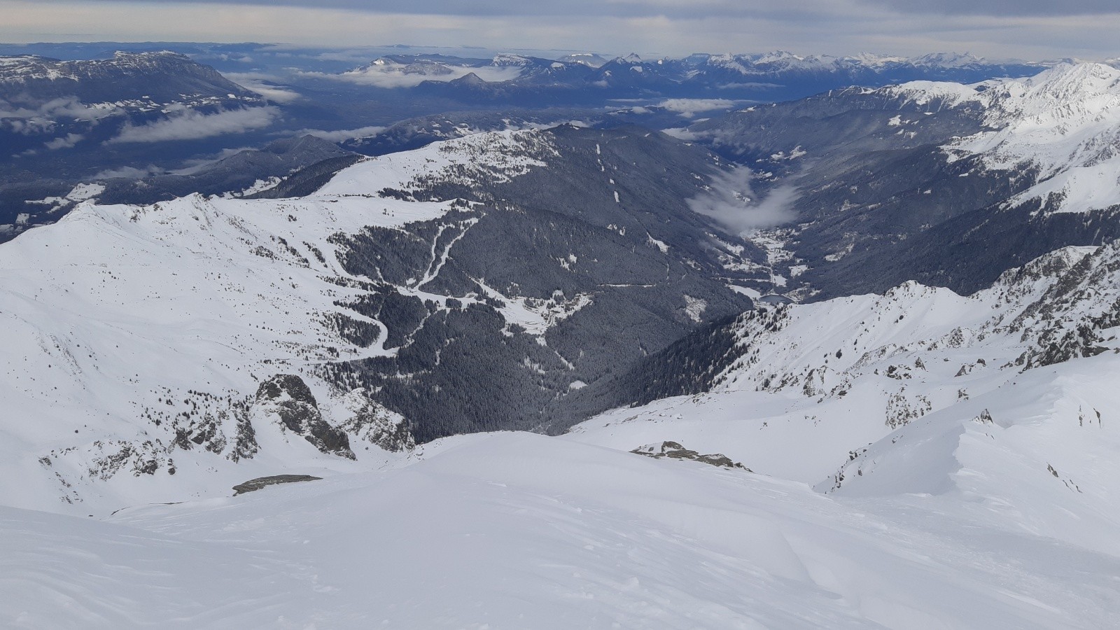 Belle poudre de la nuit, pas de travail par le vent, on sent le gond dur, gênant sous la face est vers le rivier car moins de poudre