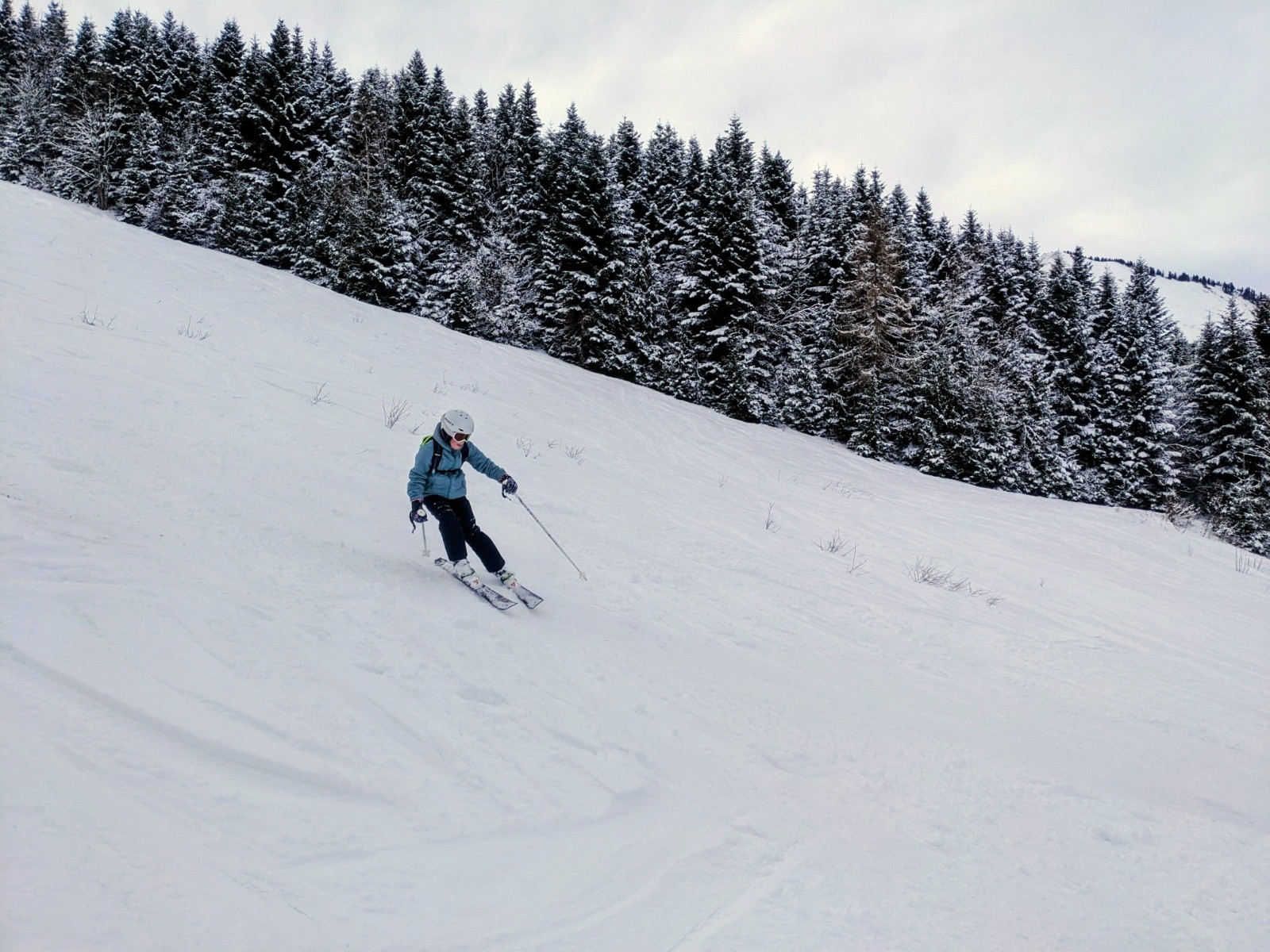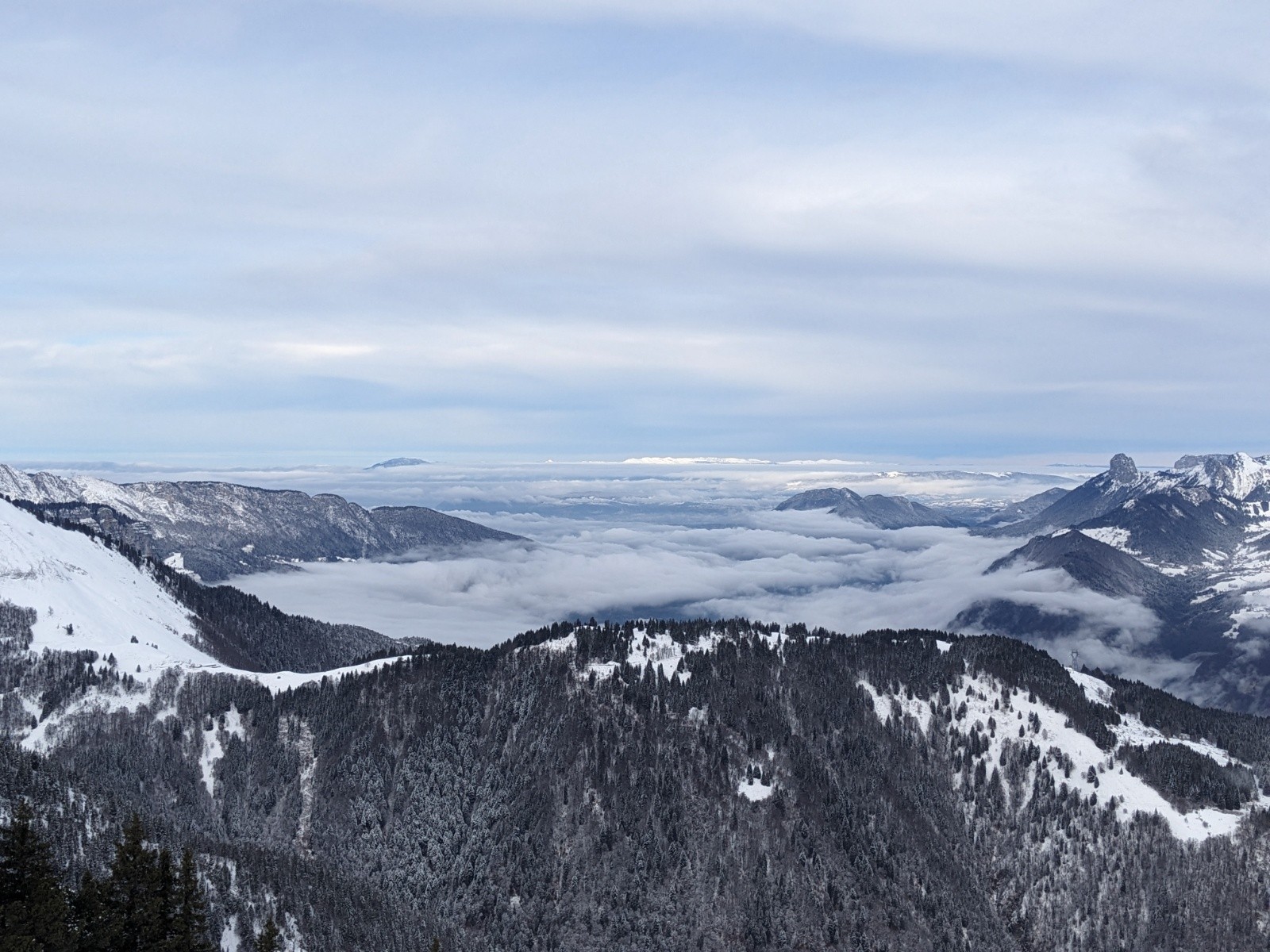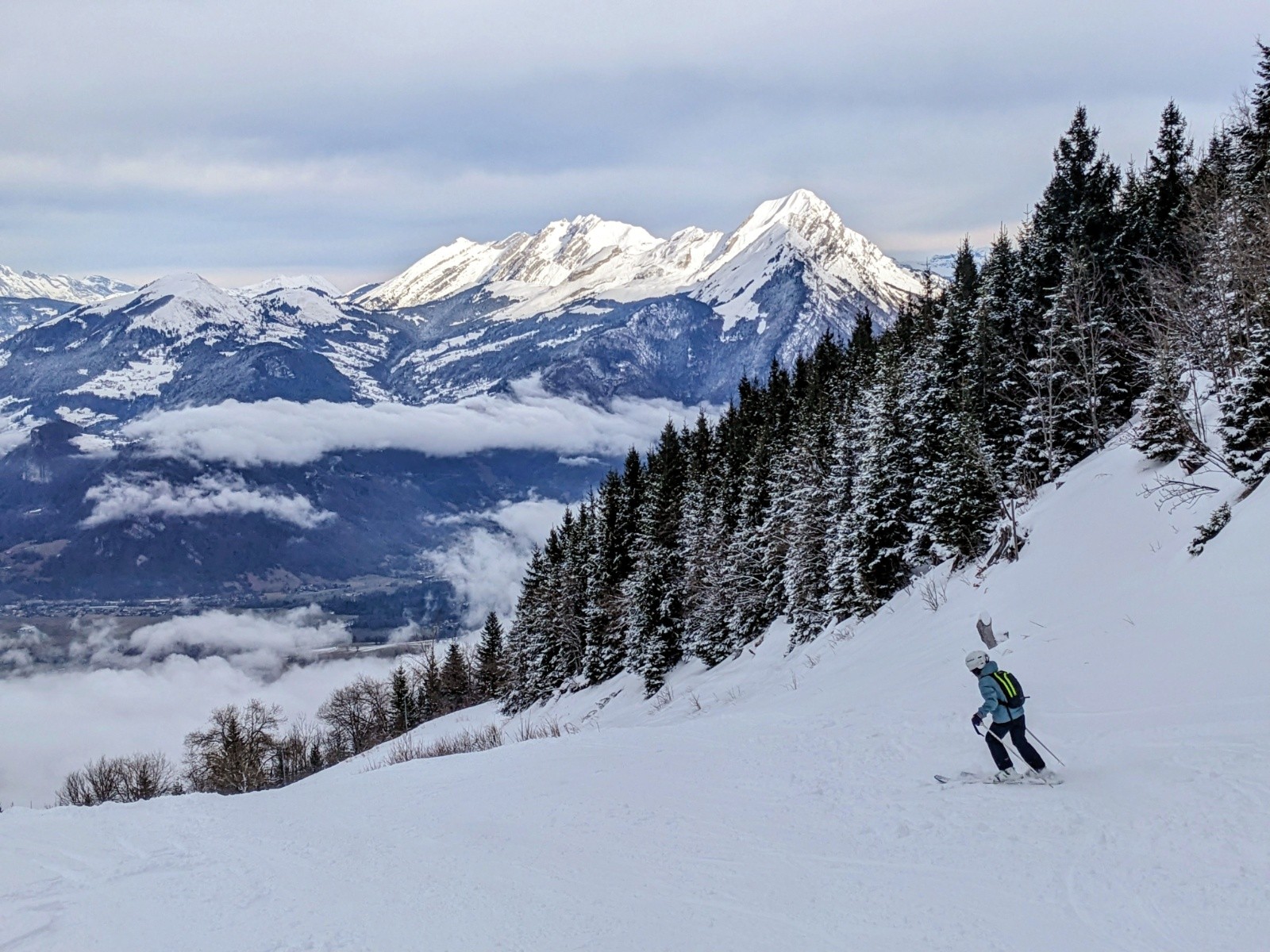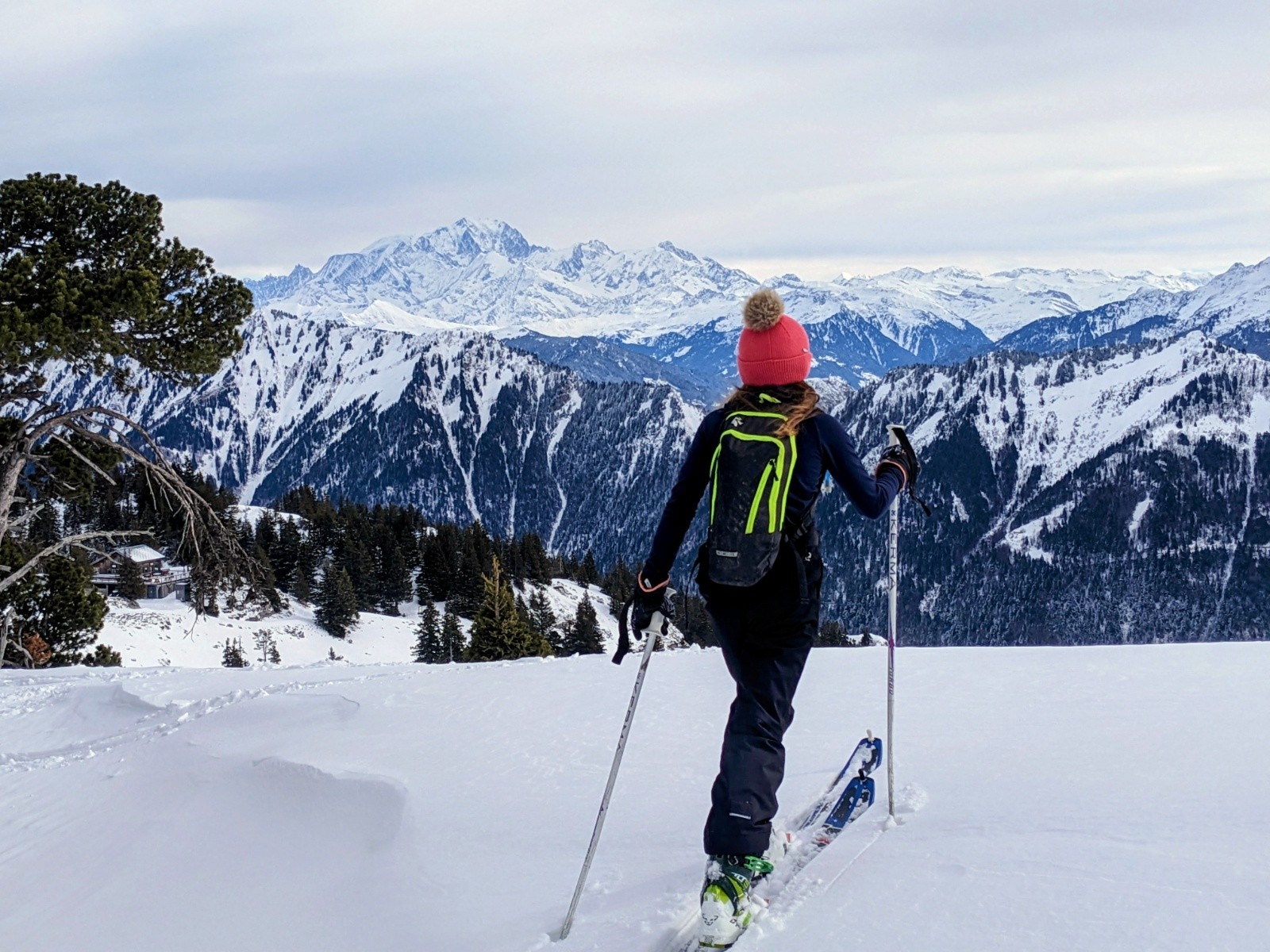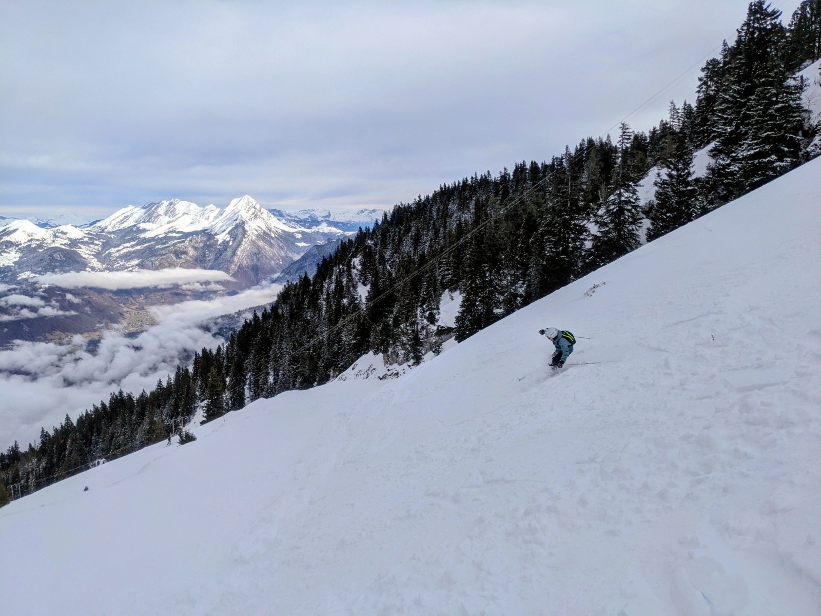 Depeautage avec vue Mont Blanc, et quelques virages dans une pente sans traces avant de rejoindre le haut de la station pour le sandwich. Au top !