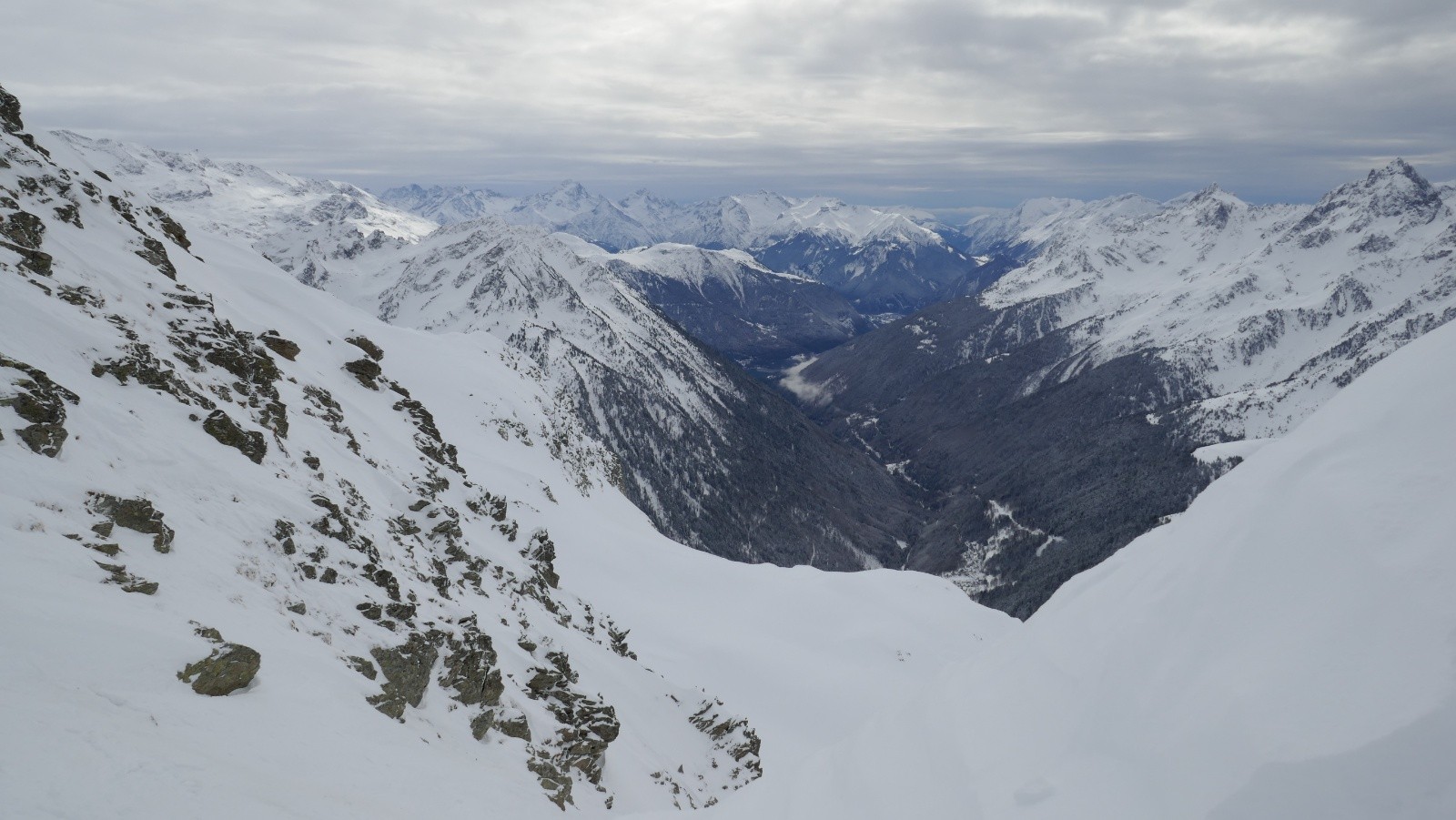 Dans le couloir, on zippe assez vite. Du coup les deux tiers se font a pieds. Les gens qui descendent nous disent que c'est ignoble. En effet c'est béton et pas du grand ski. Dessous on retrouve la poudre sur un fond dur beaucoup trop présent. Heureusement qu'il a neigé car ça devait vraiment être de mauvaises conditions avant !
