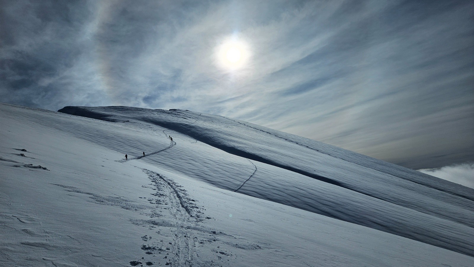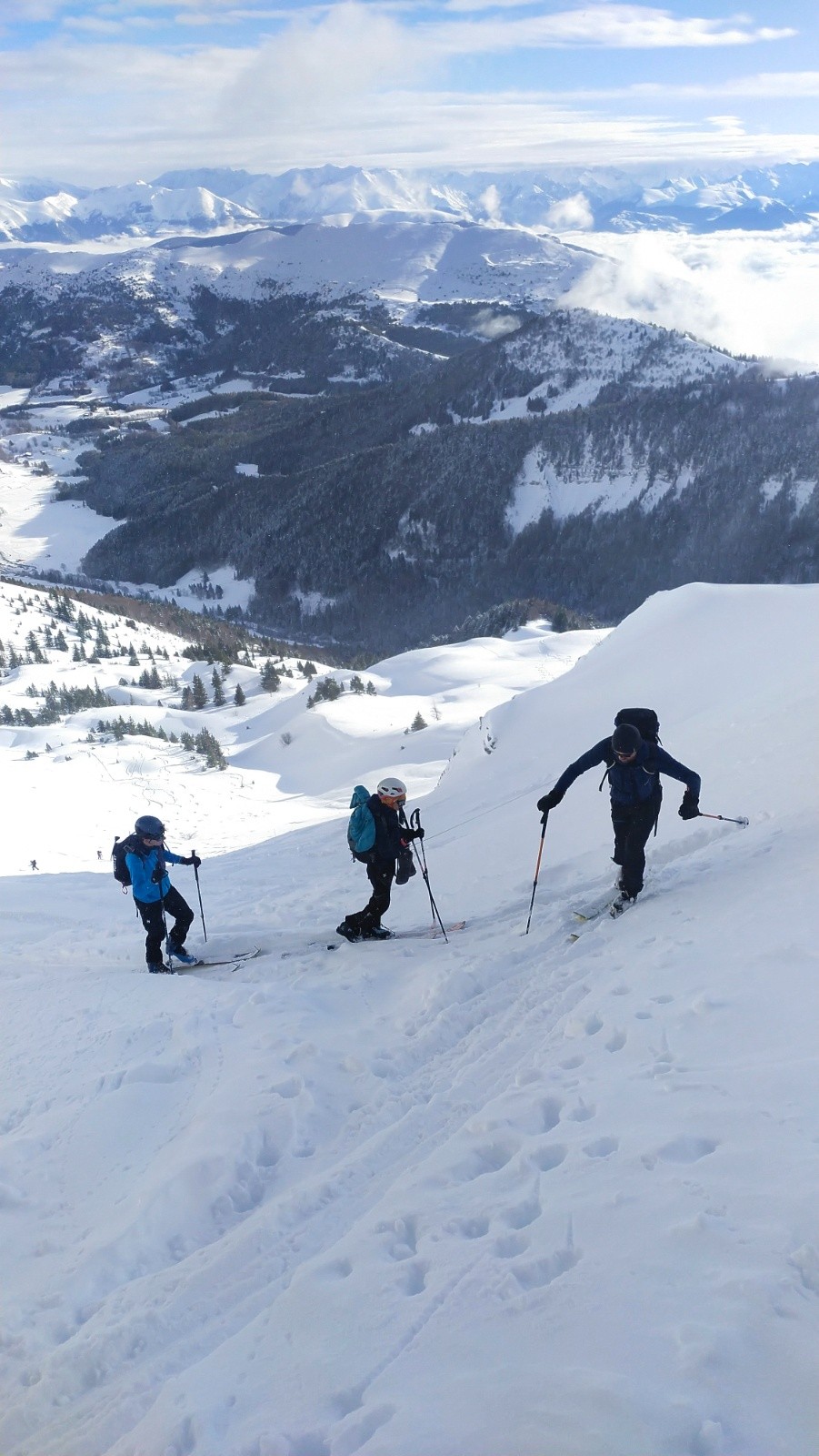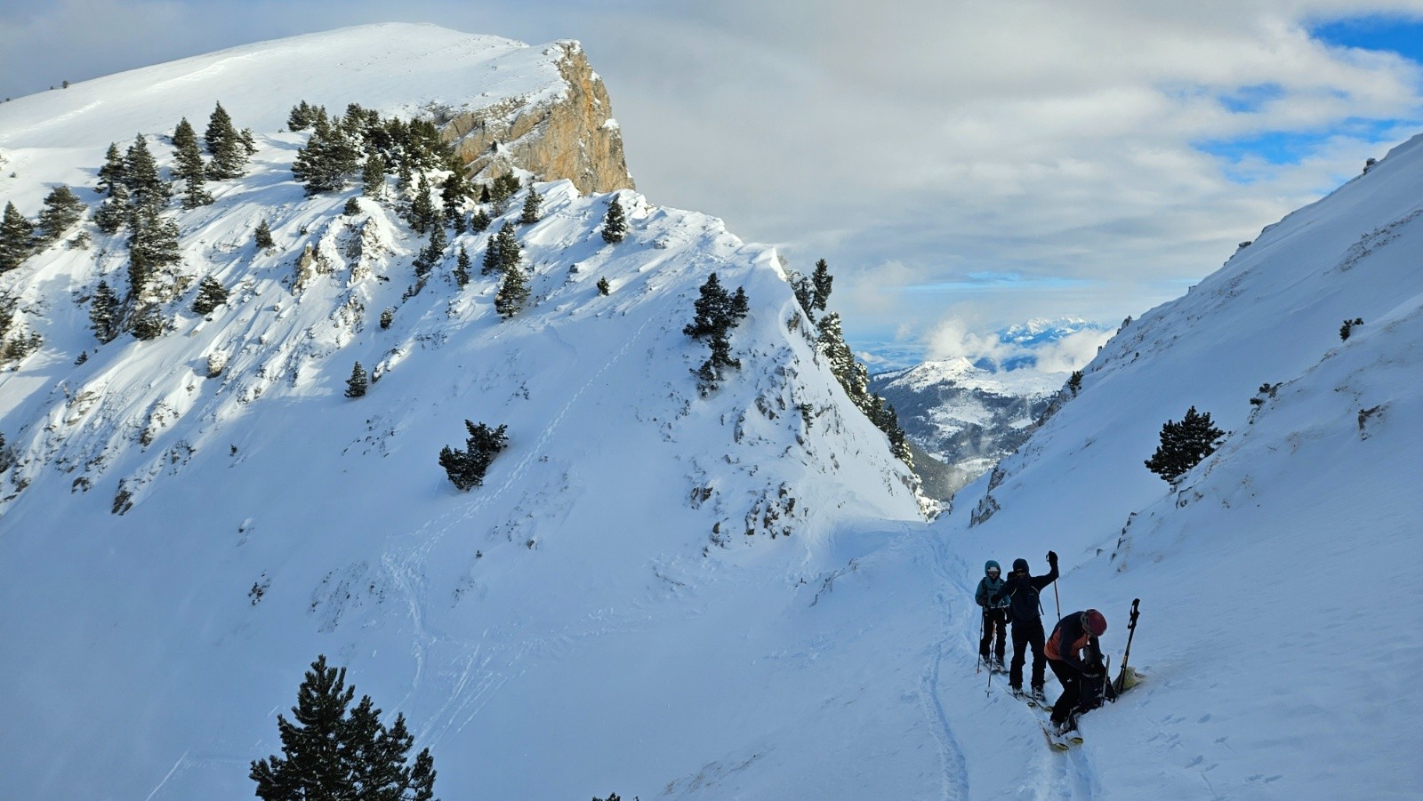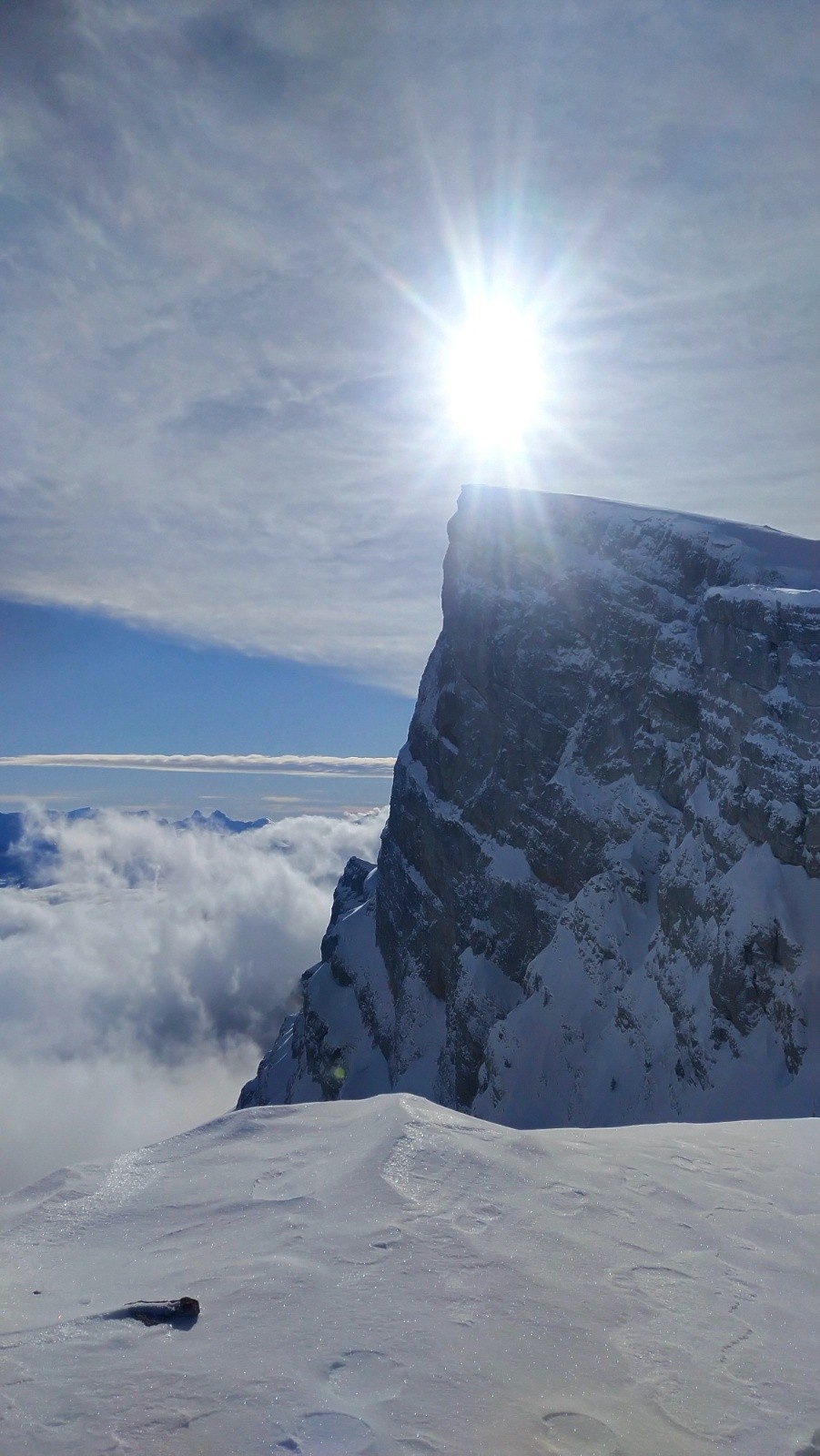 Le Pas de la Ville passe sans problème, ensuite on tire à gauche en montant en conversion pour rejoindre la crête. De là, certains continuent à ski au plus possible et d'autres à pied sans brasser comme ça a été soufflé. Dans tous les cas il y a un court et facile passage à pied obligatoire quand on prend cet itinéraire. Il y avait étonnamment du monde, un groupe s'est arrêté au milieu de l'arête pour descendre un couloir NE, notre groupe et je pense un père et sa fille ont continué avec nous direction Grand Veymont. Après le rechaussage j'ai mis les gaz jusqu'au sommet pour profiter de ce qu'il restait du beau temps (enfin j'ai fait comme j'ai pu avec les jambes usées du jour😅). Au sommet la descente s'annonçait belle mais la vue sur le Mont Aiguille très très juste (je distinguais juste sa silhouette dans le nuage). Dépeautage express et c'est parti pour la descente ! Ah en fait non, un nuage qui passait pile au mauvais moment a créé le jour blanc. Du coup comme les autres ne m'auraient pas vu faire mon petit bonus d'avant-goût de descente je les ai attendus en haut. Ludo n'a pas tardé à apparaître dans le brouillard suivi ensuite des deux personnes puis pour finir Lucie, Aymeric et maman sont arrivés. On a pris le temps en haut, rejoint par encore deux autres personnes mais le nuage restera là. Pour maman et moi on attaque la descente droit devant dans le jour blanc avec une impression de déjà vu (ou de pas vu du coup 😂). Par chance on est rapidement passé sous le nuage pour profiter pleinement d'une bonne poudreuse qui s'est un peu densifiée au-dessus de la forêt tout en restant très bonne. Et ensuite une fois les premiers sapins passés et l'arrivée en forêt on est tombé sur le jackpot, on a pu se régaler dans une poudreuse vierge hyper légère et zigzaguant entre les sapins sans peur de toucher. Un bonheur🤩 ! Une des meilleures descentes de cette saison difficile même🥰.