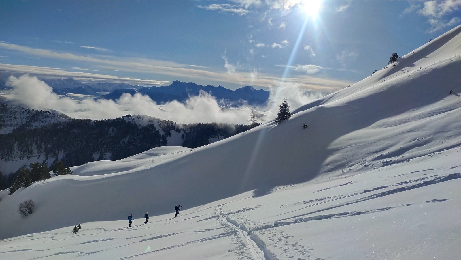 Conditions pour le ski : tout poudre ! La crête au dessus du pas de la ville et le haut de l'antécime de Pierre Blanche sont un peu décapées. Descente du grand Veymont en poudre qui s'est un peu densifié vers 2000m avant de redevenir ultra légère en foret. En foret il y a la dose et elle s'est bien conservée partout. Sur le border attention aux cailloux qui vont pas tarder à apparaitre...
