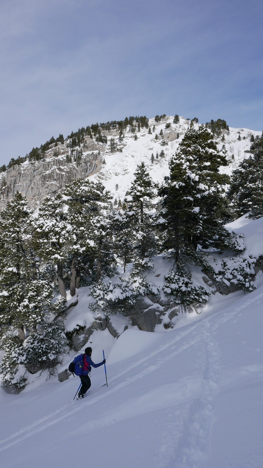 Itinéraire suivi : Itinéraire montée du topo sauf la fin ou on a rejoint les pistes et non le sommet de roche du coin, descente par un hors piste pile en face de là ou on débouche, parallèle au télésiège, bien visible de la webcam et de la vallée (car tranchée blanche dans la barre)