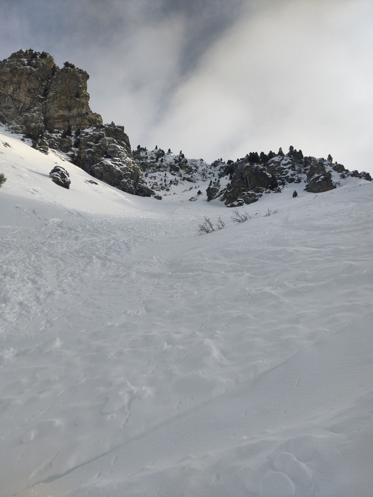 Itinéraire suivi : montée par l'épaule Sud-Ouest, bonne skiabilité sauf sur la partie de la croupe rocheuse vers 2200. On a déchaussé sur cette partie là, trop peu de neige et trop carrelage pour faire des conversions, mais là montée jusqu'au plateau sommital pour rechausser se fait facilement par les cailloux (~30D+)
