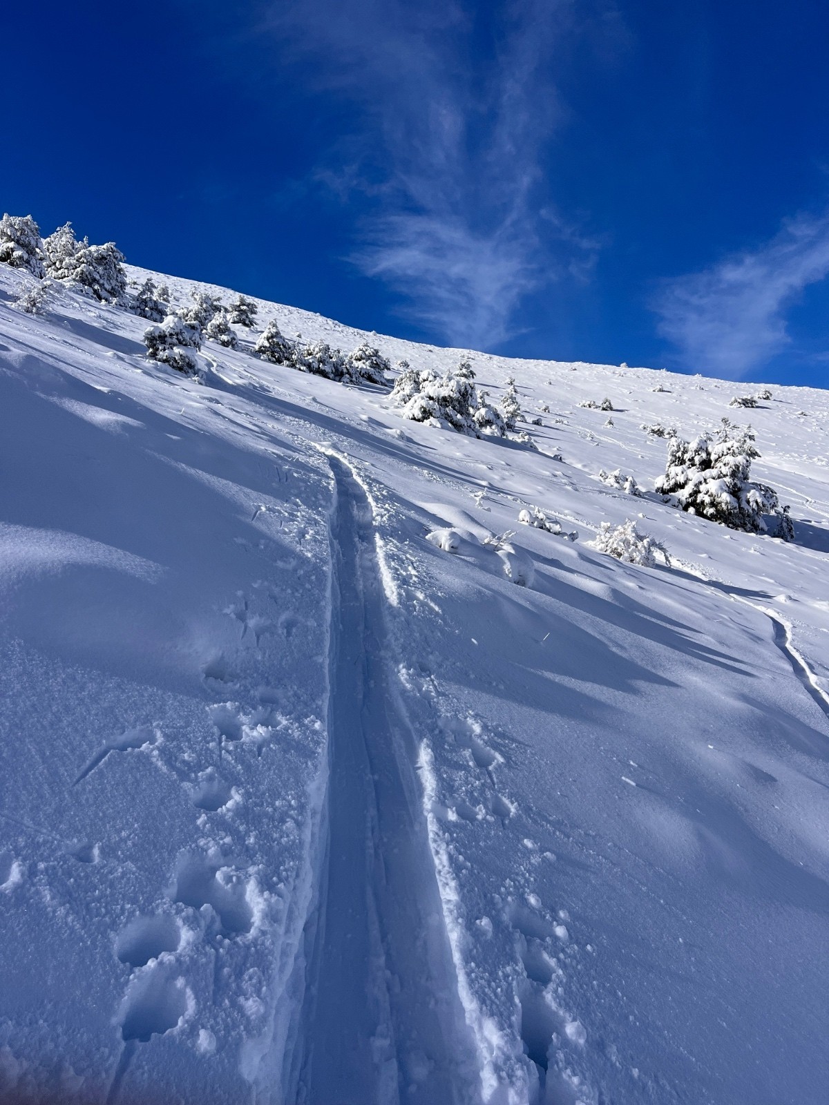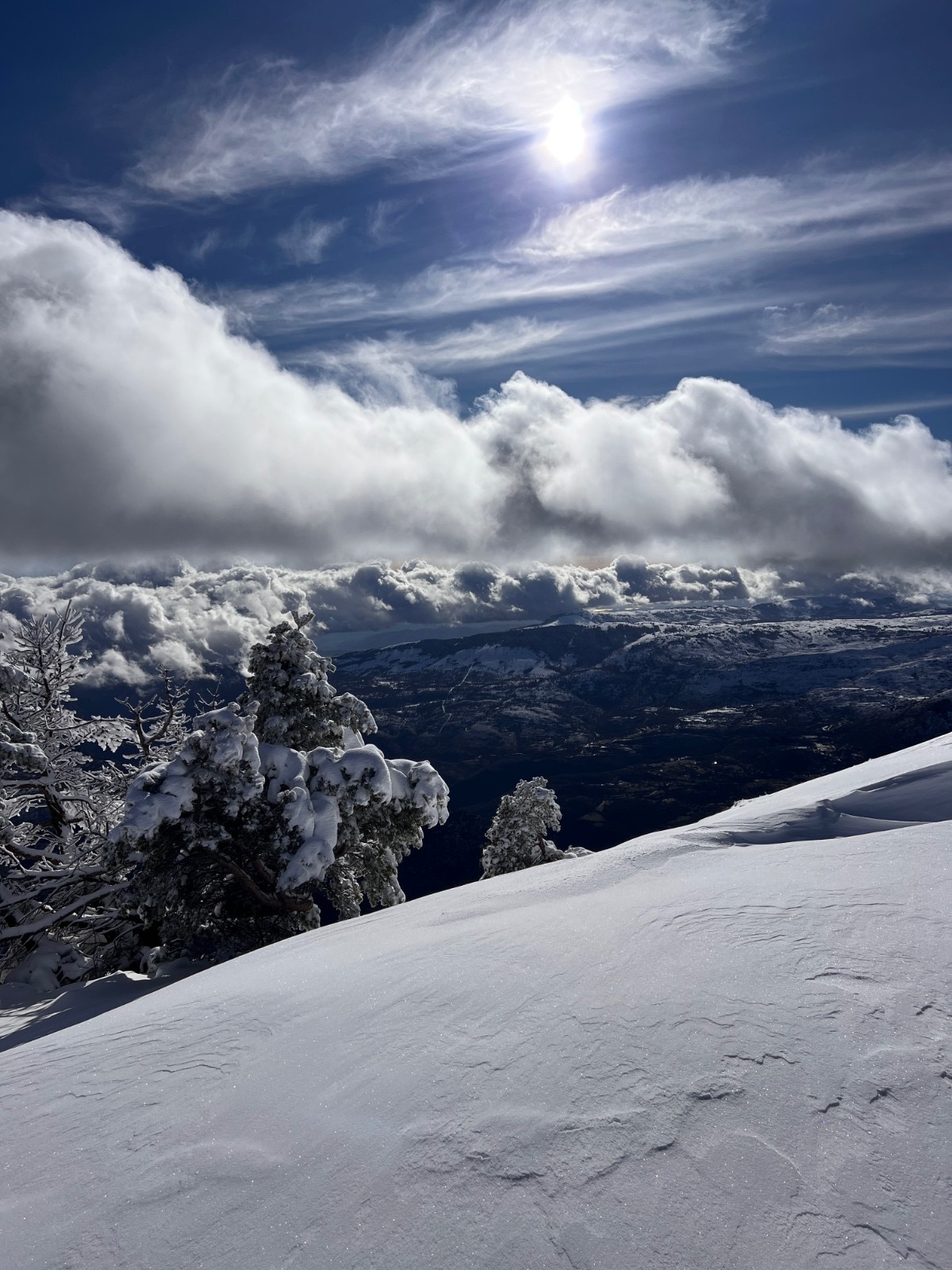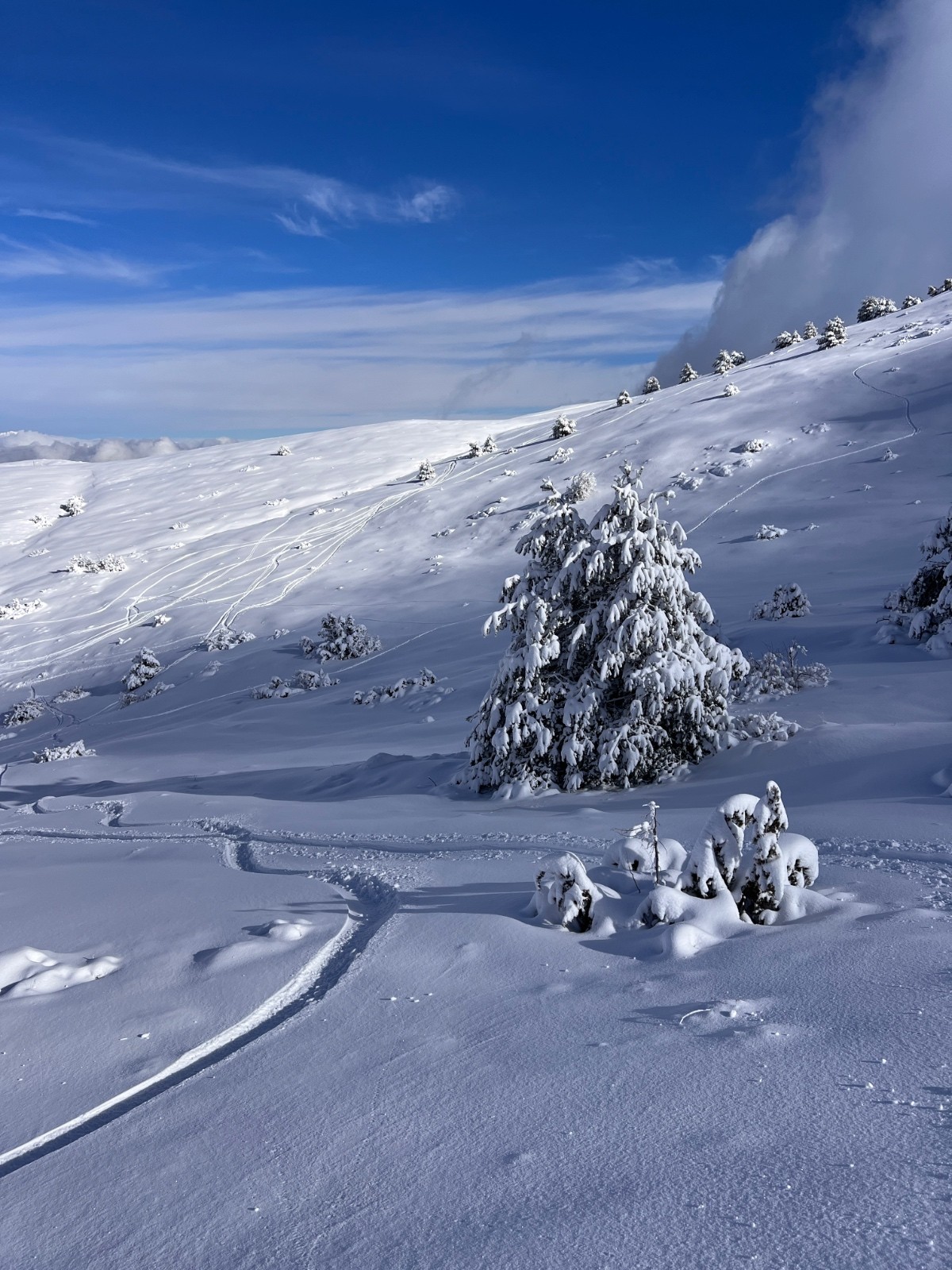 Itinéraire suivi : arrivée vers 9h30 et voyant cette qualité de neige et les remontées mécaniques ouvertes (faut soutenir la station) j’ai eu la bonne idée de prendre un forfait pour la matinée permettant de tracer les premières traces rapidement le long du télésiège des huskies, ensuite on a mis les peaux pour aller en haut du téléski du Chéron fermé, pour tracer la noire attention on touche pas mal sur le haut au départ (c’est souvent comme ça)puis une fois descendu d’une 50 de mettre sa touche plus jusqu’en bas, neige au top !!! Reprise des remontées mécaniques puis les crêtes, le jas, conditions parfaites juste attention sur les départ ensuite sa ne touche pas du tout… puis on met les peaux pour Jérusalem descente top côté est (tjs quelques touchettes sur les départ) jusqu’en bas du vallon neige restée froide ! Remonté croix de verse le long de la crête avec des images sur mer de nuage et mer à couper le souffle! On voulait aller chercher le vallon qui descend à la combe d’Henry mais un gros nuage arrive à ce moment plus aucune visibilité et moins de neige sur le haut sa touche pas mal, je décide de faire demi tour… descente au point 1568 remontée à Jérusalem et retour versant nord au milieu des sapins chargés! Quelle journée !!! Greolieres c’est pas du ski extrême c’est certain, mais c’est du ski plaisir à 1000% !!!!