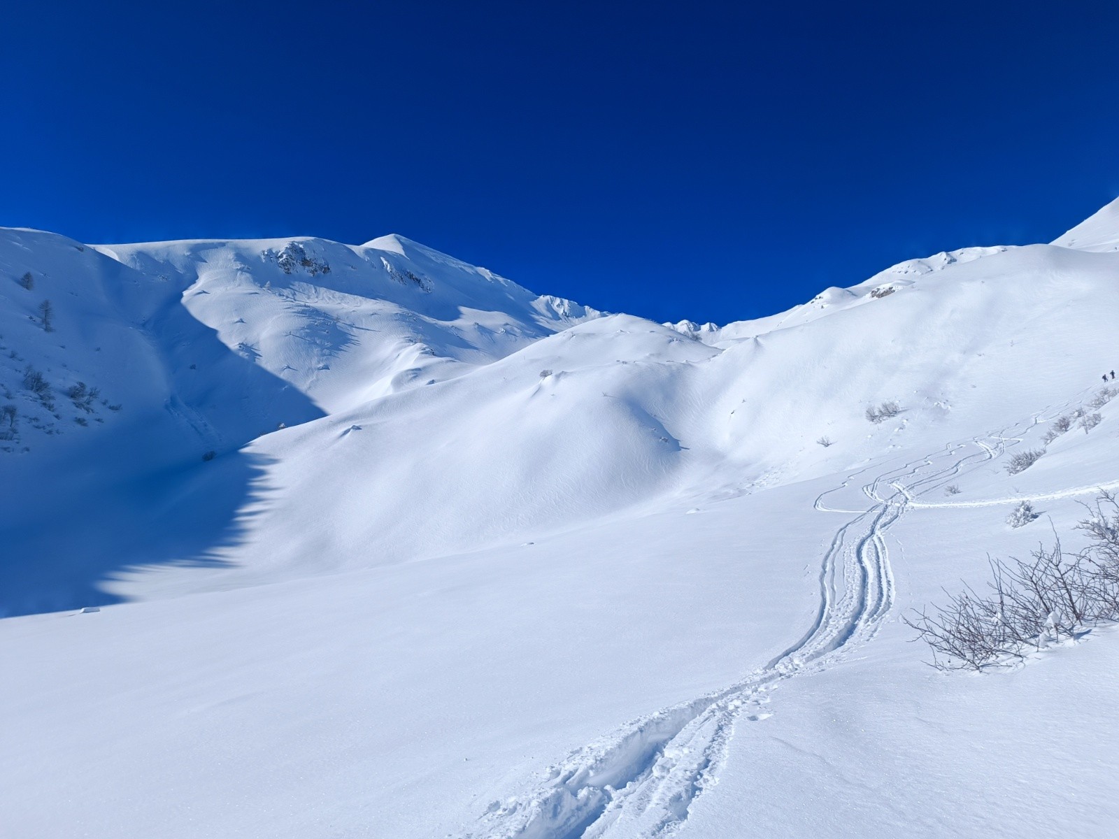 L'itinéraire permet de monter en mode 'detendu' jusque sous le col, en observant a la fois les itinéraires possible et le manteau neigeux déposé la veille sans vent, composée de neige fraîche et particules reconnaissables.
