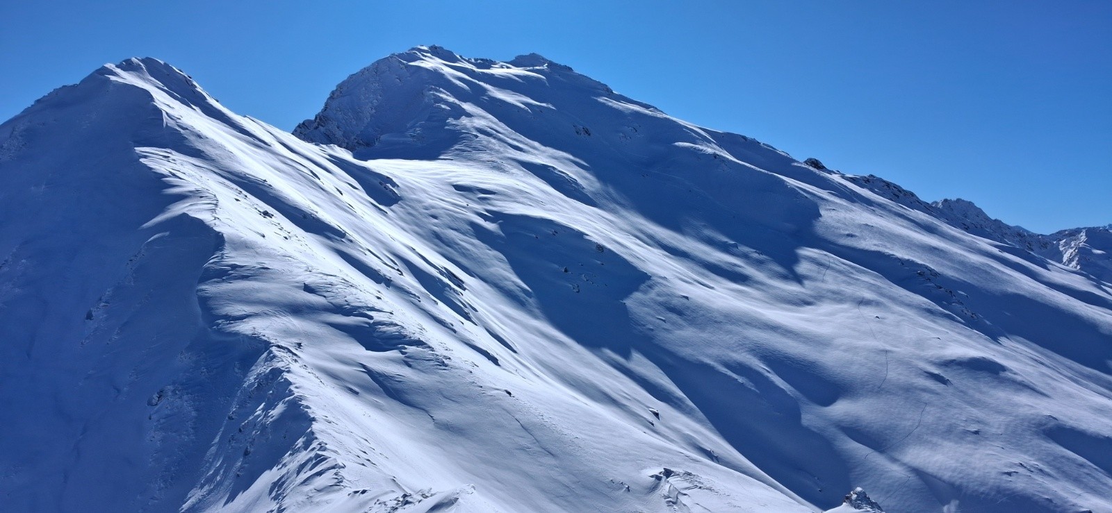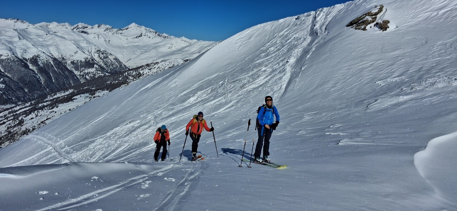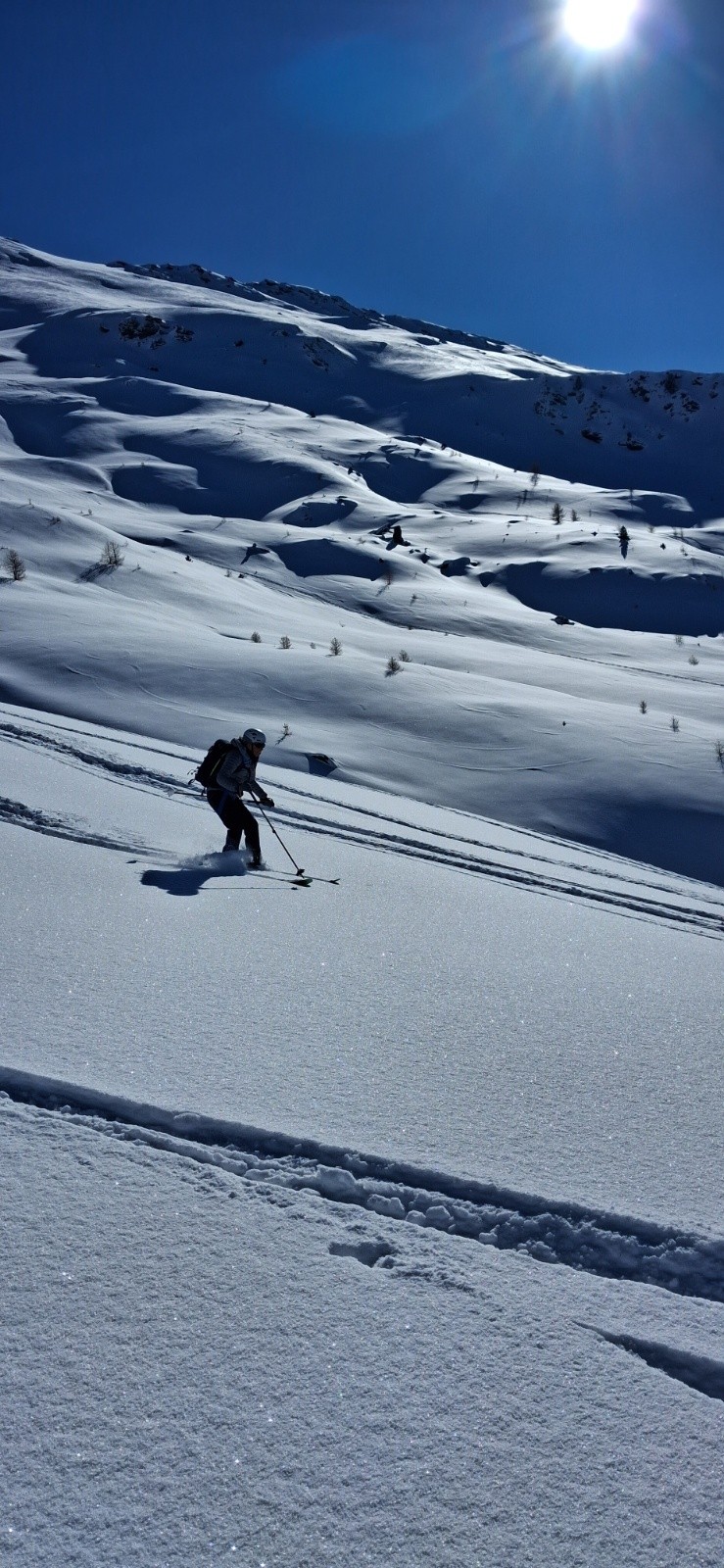 La descente du Pic en face Sud Est s'est faite dans une excellente neige pas suffisamment épaisse pour protéger les skis des cailloux.