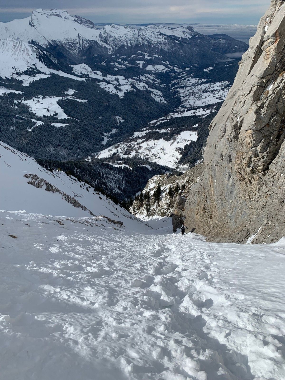 Conditions pour le ski : Neige étonnamment correcte grace à ce qu'il est tombé la nuit. Départ du parking qui était plein... Un samedi dans les Aravis... On s'est retrouvé à plus de 15 en même temps à monter dans le coillu mais heuresement tous seul en haut du chauchefoin. Couloir bien enneigé, sauf la partie basse la plus étroite ou les cailloux sont pas loins.