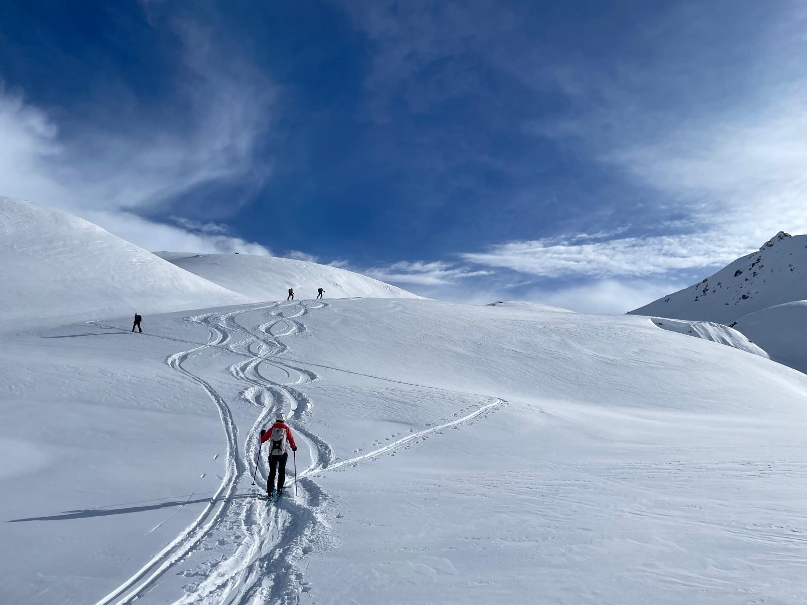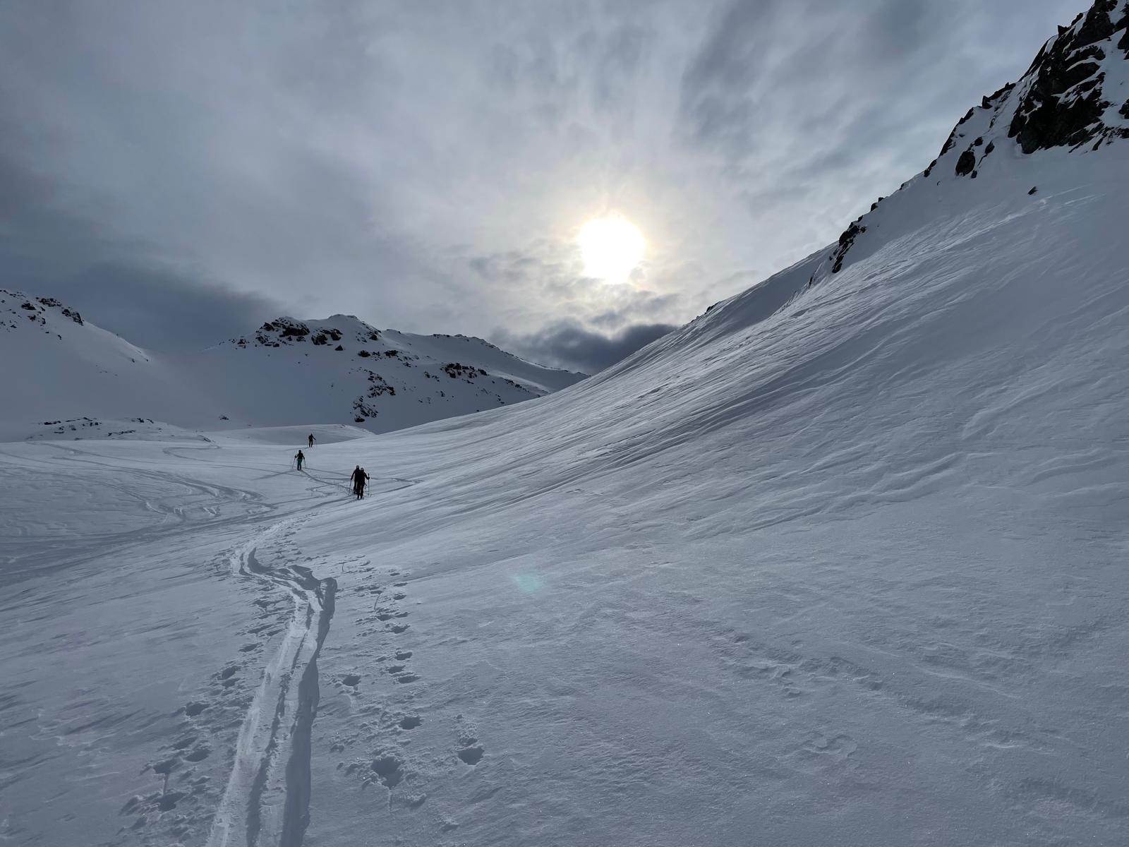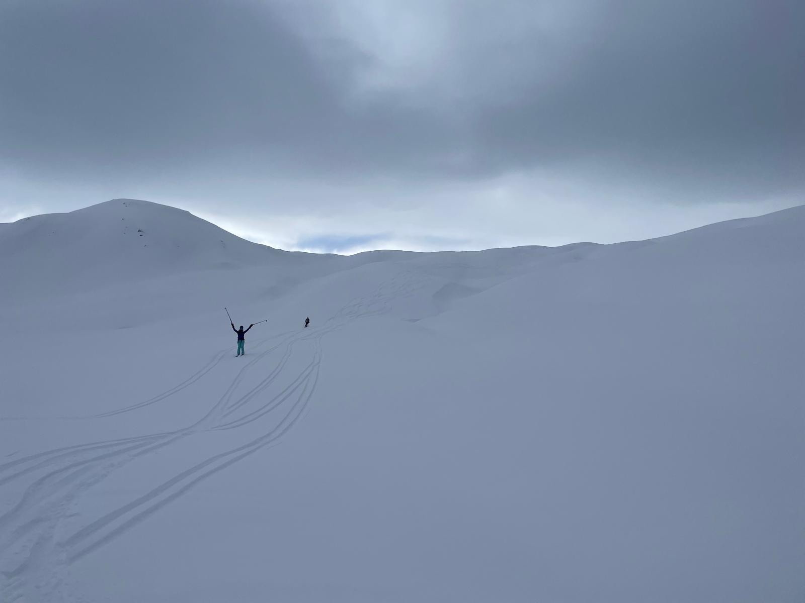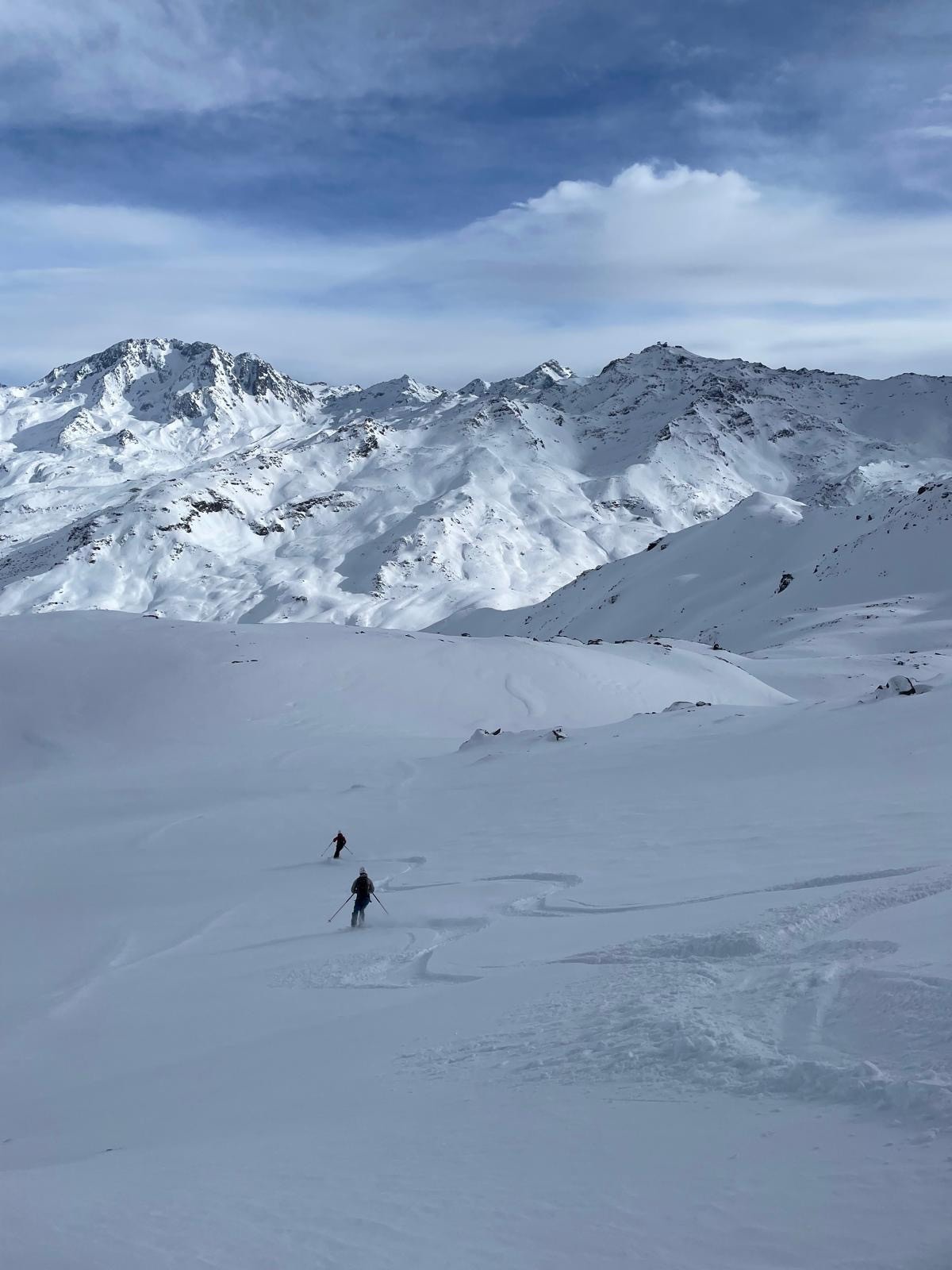 La descente de ce col est superbe ! dans les combes abritées du vent la neige est légère, en belle quantité et vierge ! Le bonheur !! 🥳