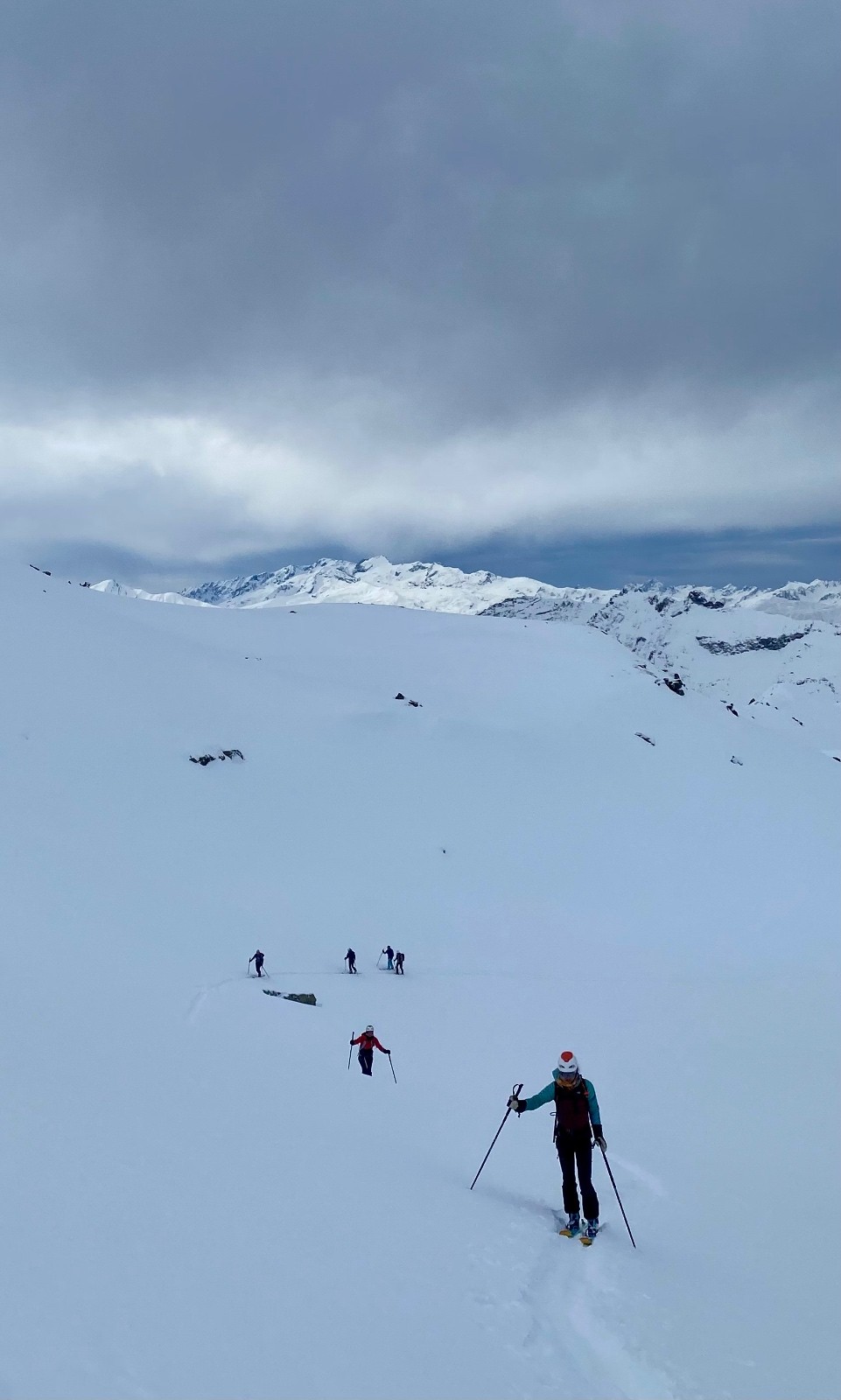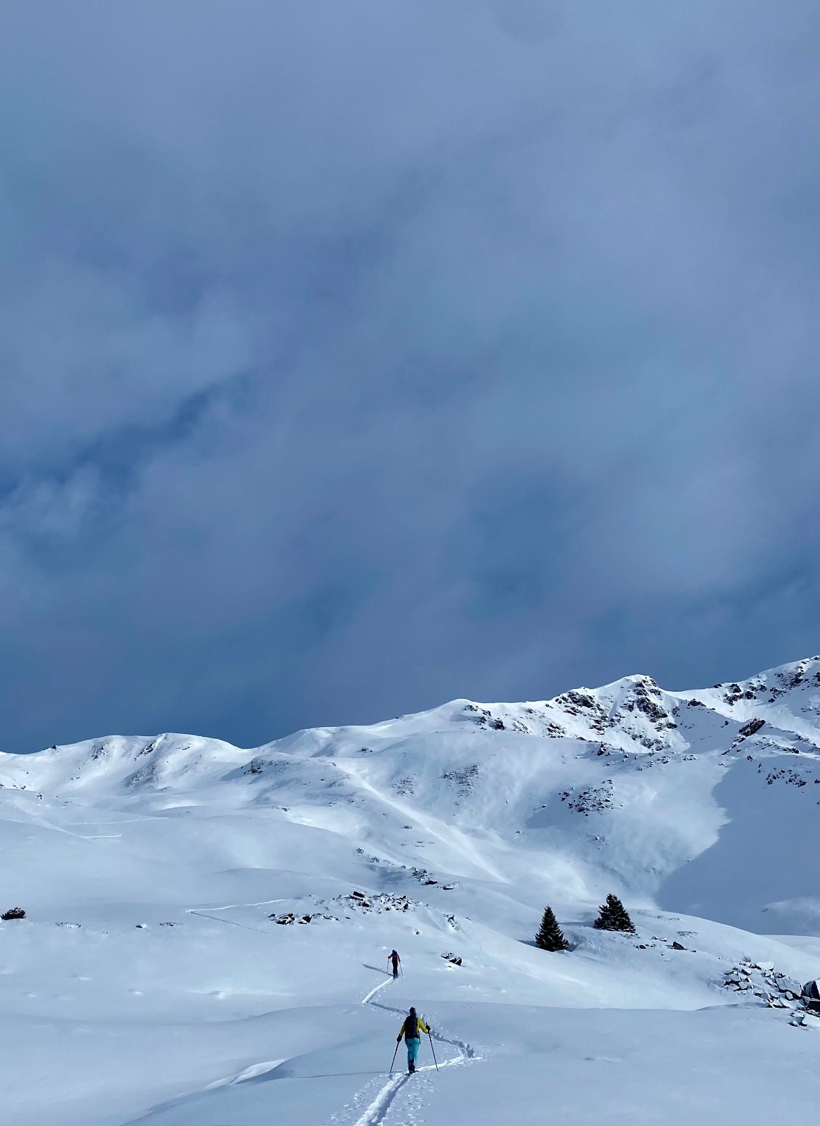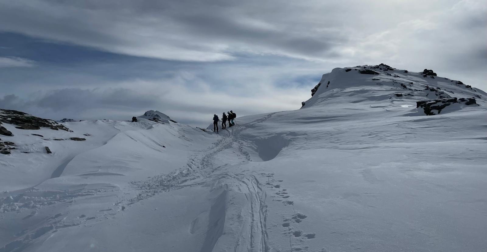 La descente de ce col est superbe ! dans les combes abritées du vent la neige est légère, en belle quantité et vierge ! Le bonheur !! 🥳