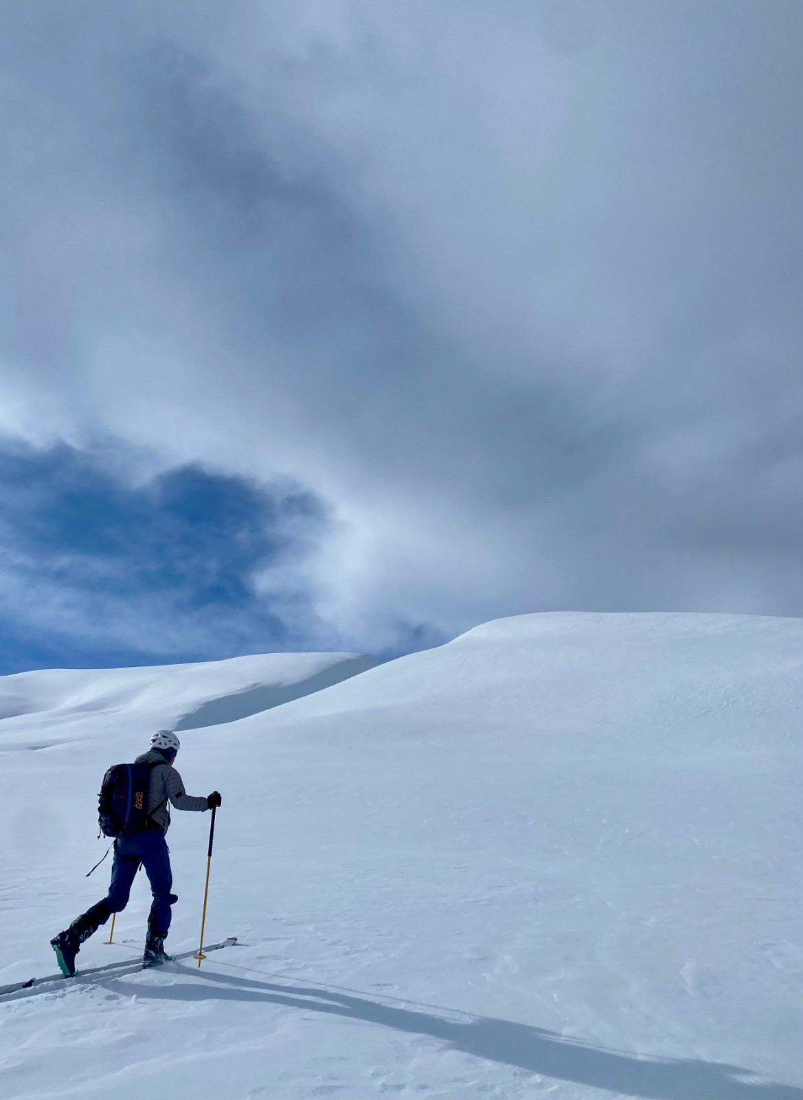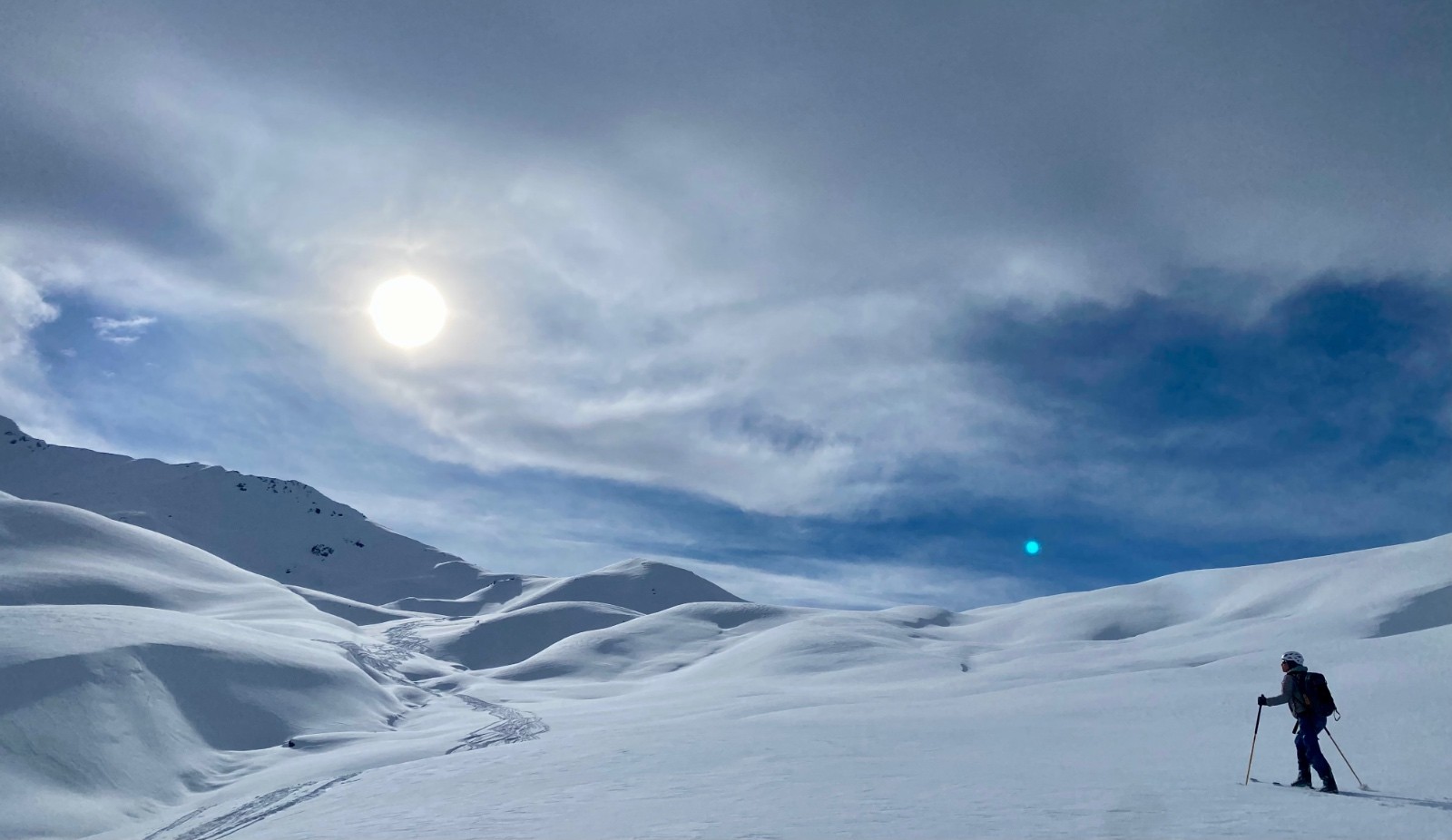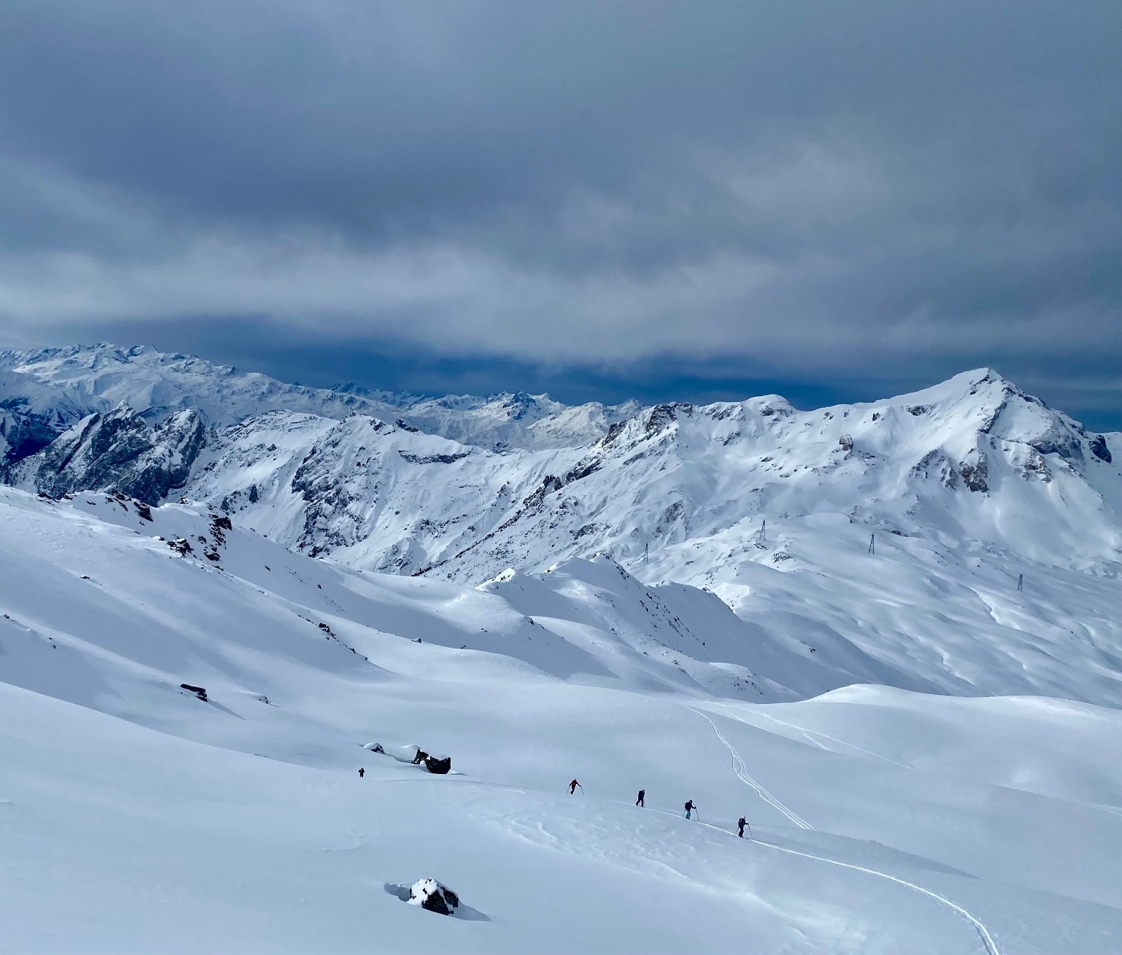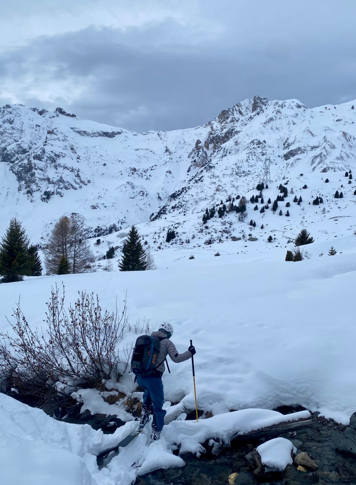 La descente de ce col est superbe ! dans les combes abritées du vent la neige est légère, en belle quantité et vierge ! Le bonheur !! 🥳