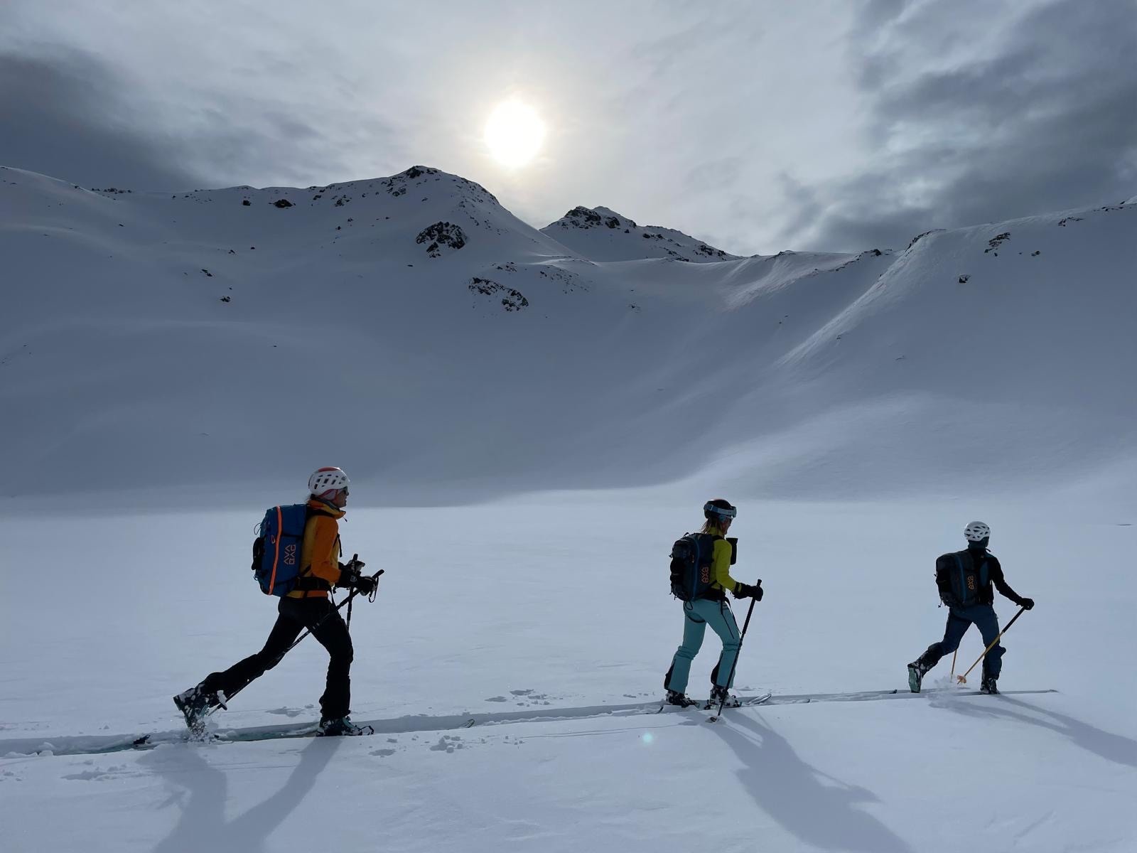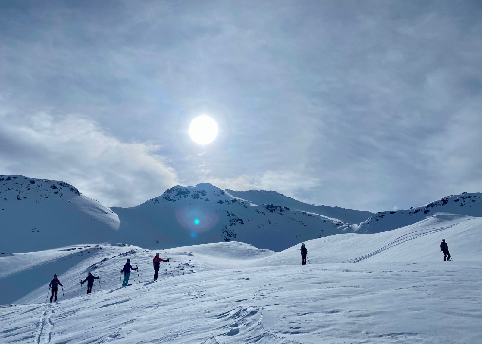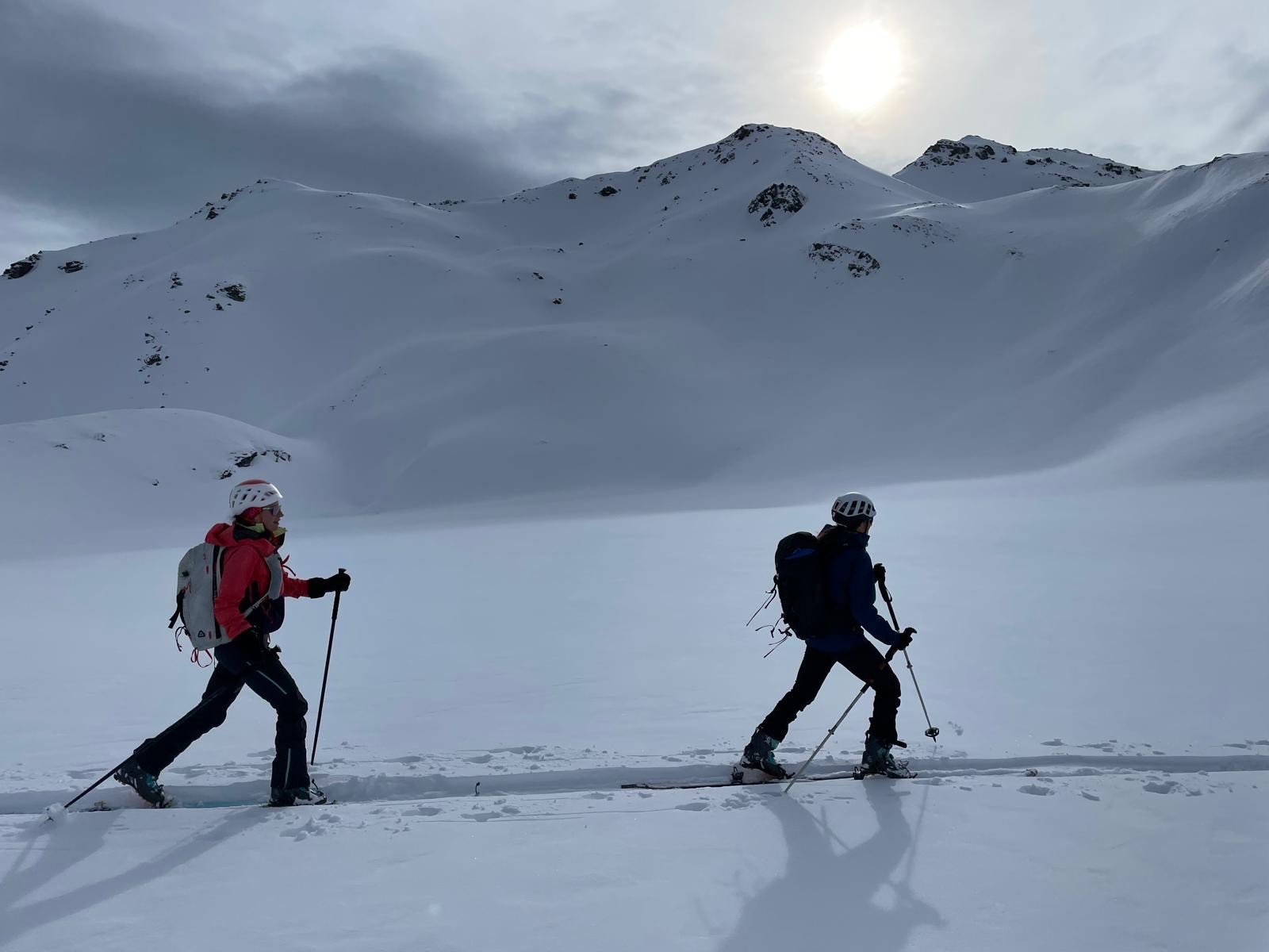 On monte au Col des Encombres au soleil. Descente de l'autre côté dans le jour blanc 😱 on y va tranquille car on ne distingue pas les reliefs, Astrid entend un woof mais heureusement rien ne part.