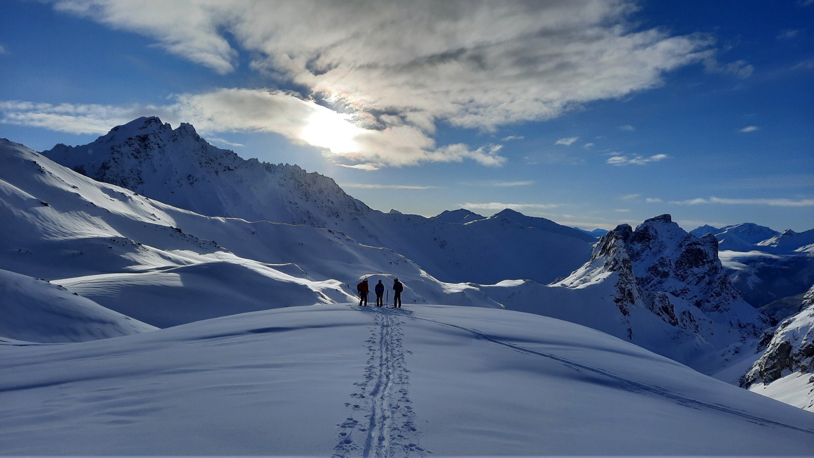 Conditions nivo et activité avalancheuse : BRA3. La poudre que nous skions est tombée du ciel ou apportée par le vent. C'est plaqué dans presque toutes les orientations par des chutes successives et les orientations changeantes du vent des derniers jours. Un woof au point 2577 du Lac de la Ponsonnière avec deux fissures qui se dessinent l'une après l'autre.