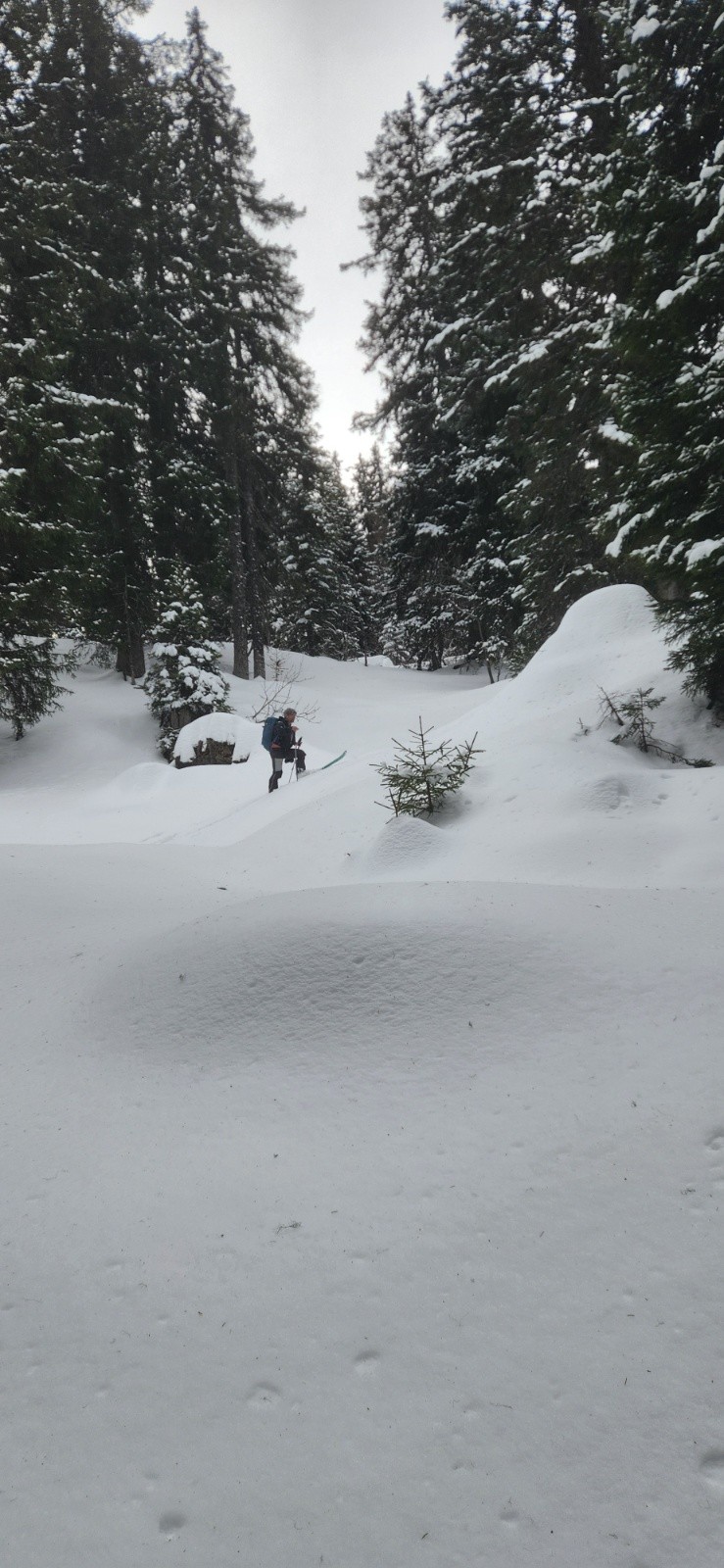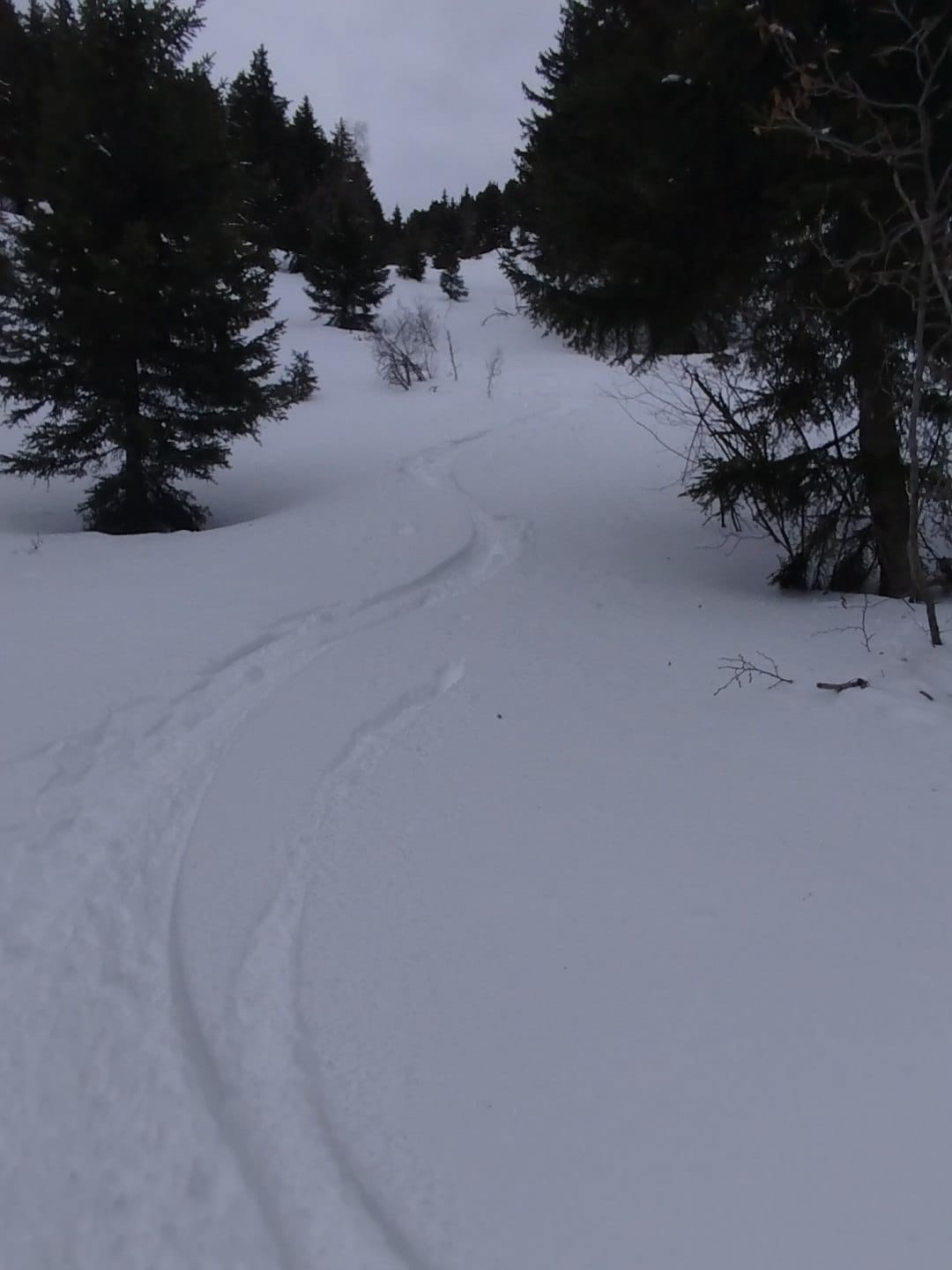 Conditions pour le ski : Bon enneigement dans ce secteur. Skiable sur route forestière des 850/900m . Skiable dès 1100m dans les clairières et sous bois pas trop dense. 20/30 cm de poudre récente sur fond dur dès 1400/1500m. La neige encore bien poudreuse ce matin s'est alourdie sous 1600m en journée tout en restant agréable à skier. Elle est restée bien légère au dessus au moins jusqu'à la limite haute des arbres . Au dessus la pente Est nord Est sous le Bellacha est de plus en plus travaillée par le vent . Au dessus de 2100m c'est très irrégulier lourd et désagréable à skier en plus d'être plaqué. On a fait notre sondage à 2200m puis demi tour pour retourner faire du bon ski poudreux plus bas. Avec les conditions avalancheuse du moment et le transport en cours la sortie au col ne nous paraissaient pas envisageable aujourd'hui de toute façon.