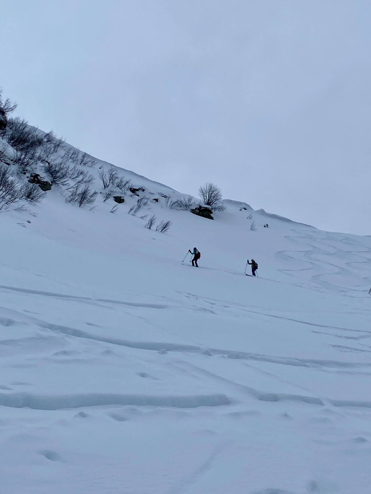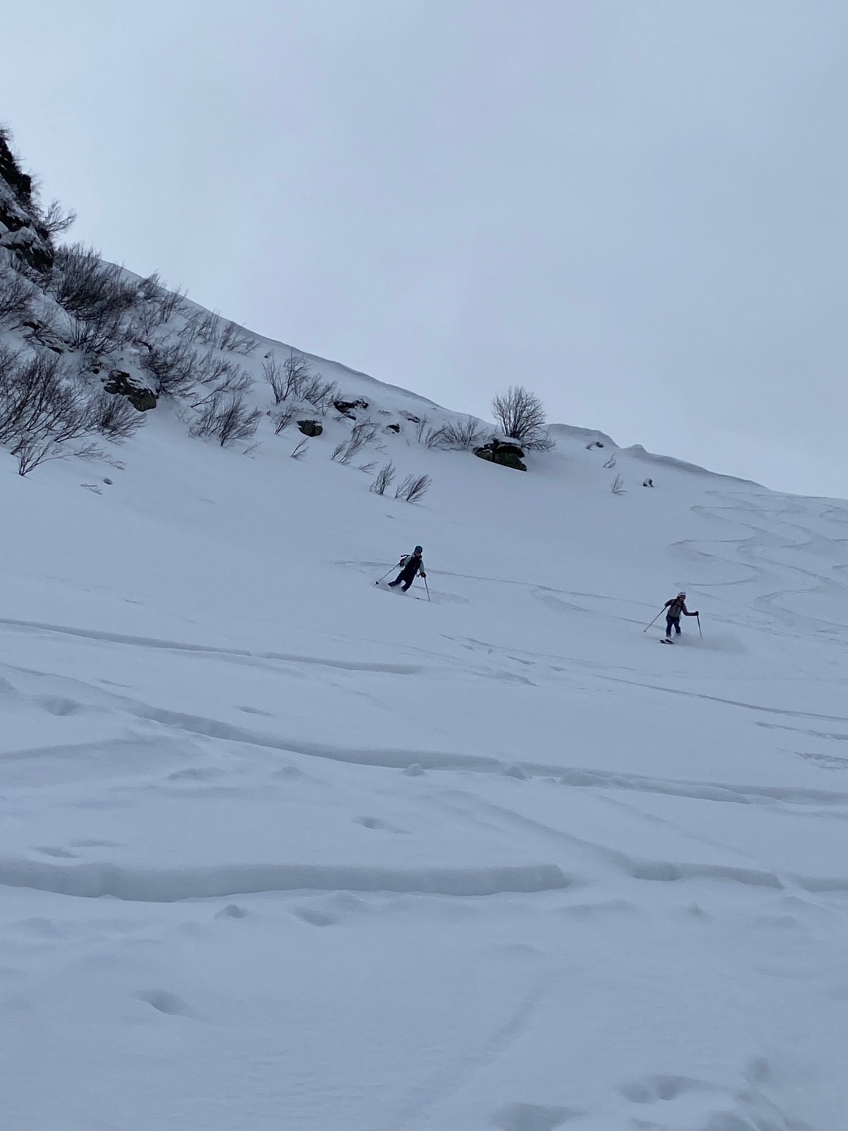 On ne traîne pas pour enlever les peaux et redescendre à l’abri du vent dans la combe