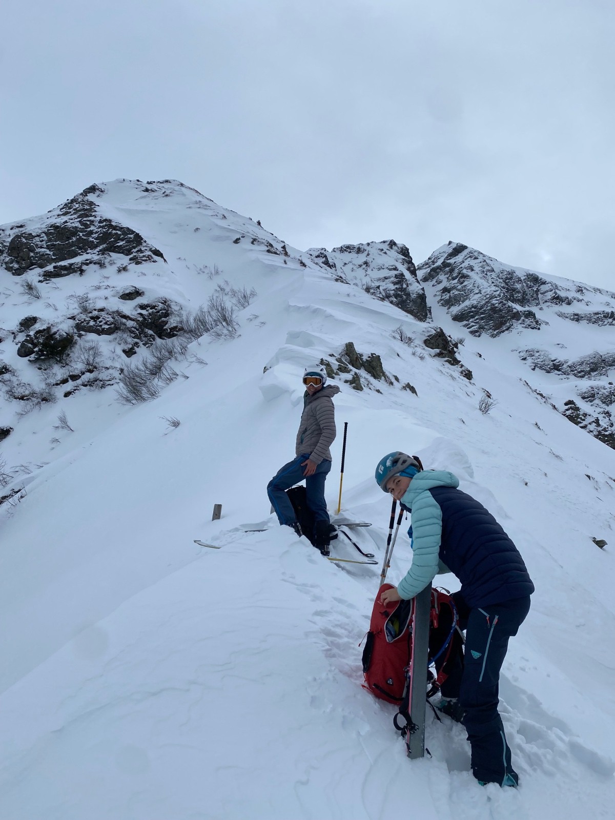 Conditions pour le ski : départ skis aux pieds, montée dans la forêt avec qqs déchaussages, première montée dans la combe tranquille juste un peu de vent au sommet, deuxième montée arrivée au sommet dans des rafales fortes et violentes.