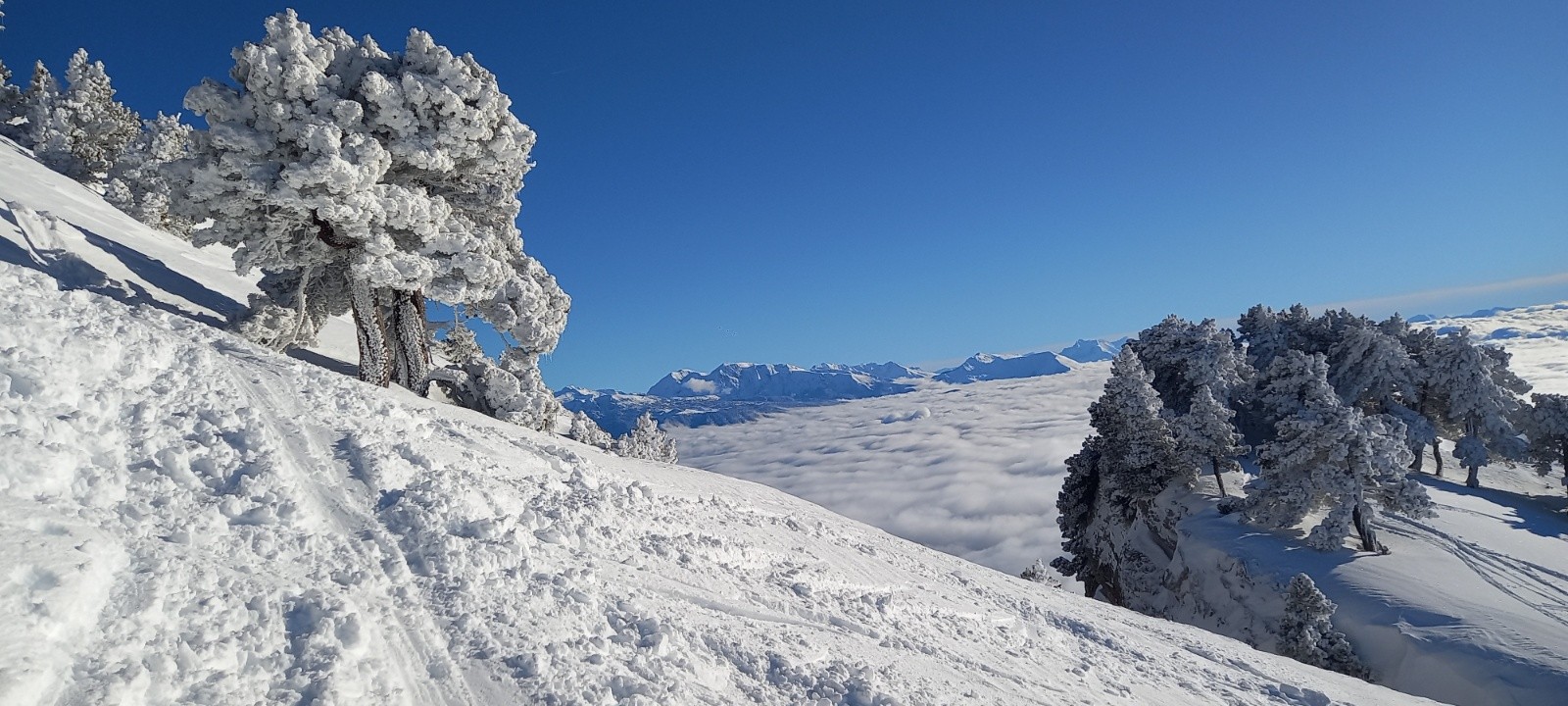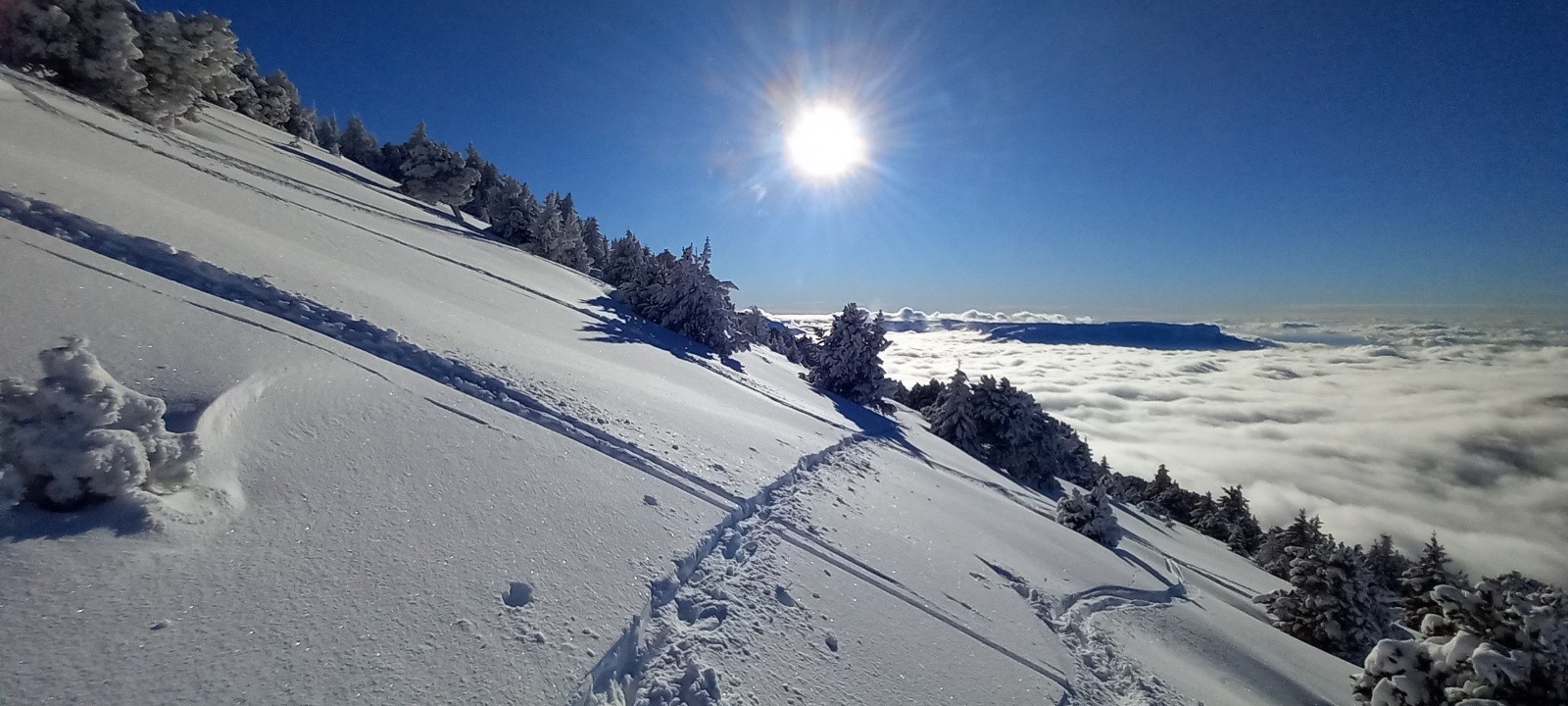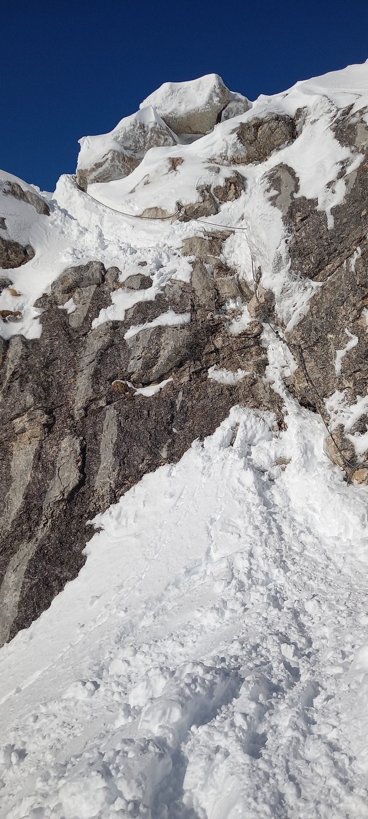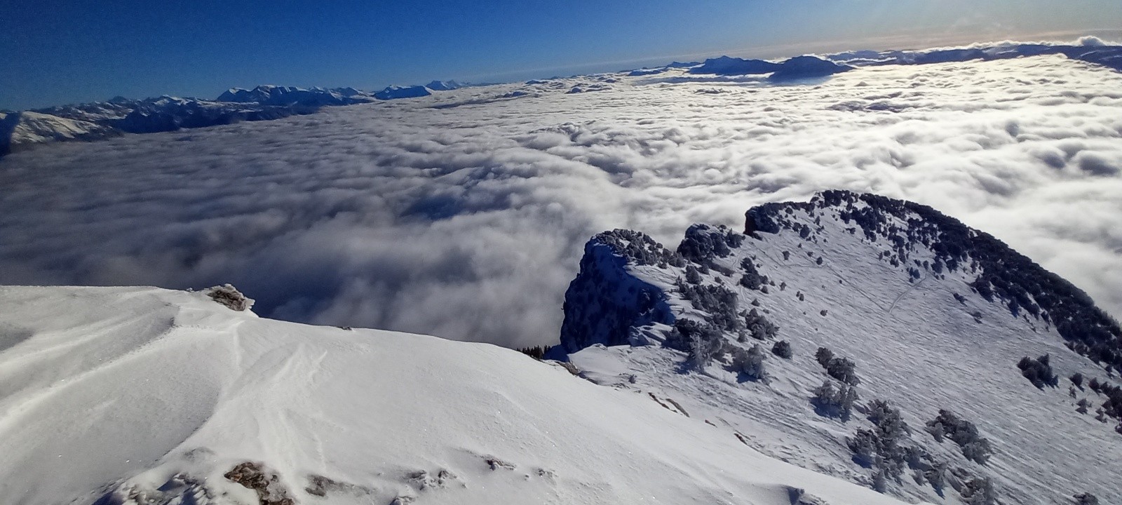 Conditions pour le ski : bonnes conditions de neige fraîche (40cm au niveau de la Folatière), s'alourdissant pour les portions au soleil... le fond dur et les cailloux sont encore présents vers le sommet / avec prudence pour ses planches, on peut néanmoins tout descendre à skis...
