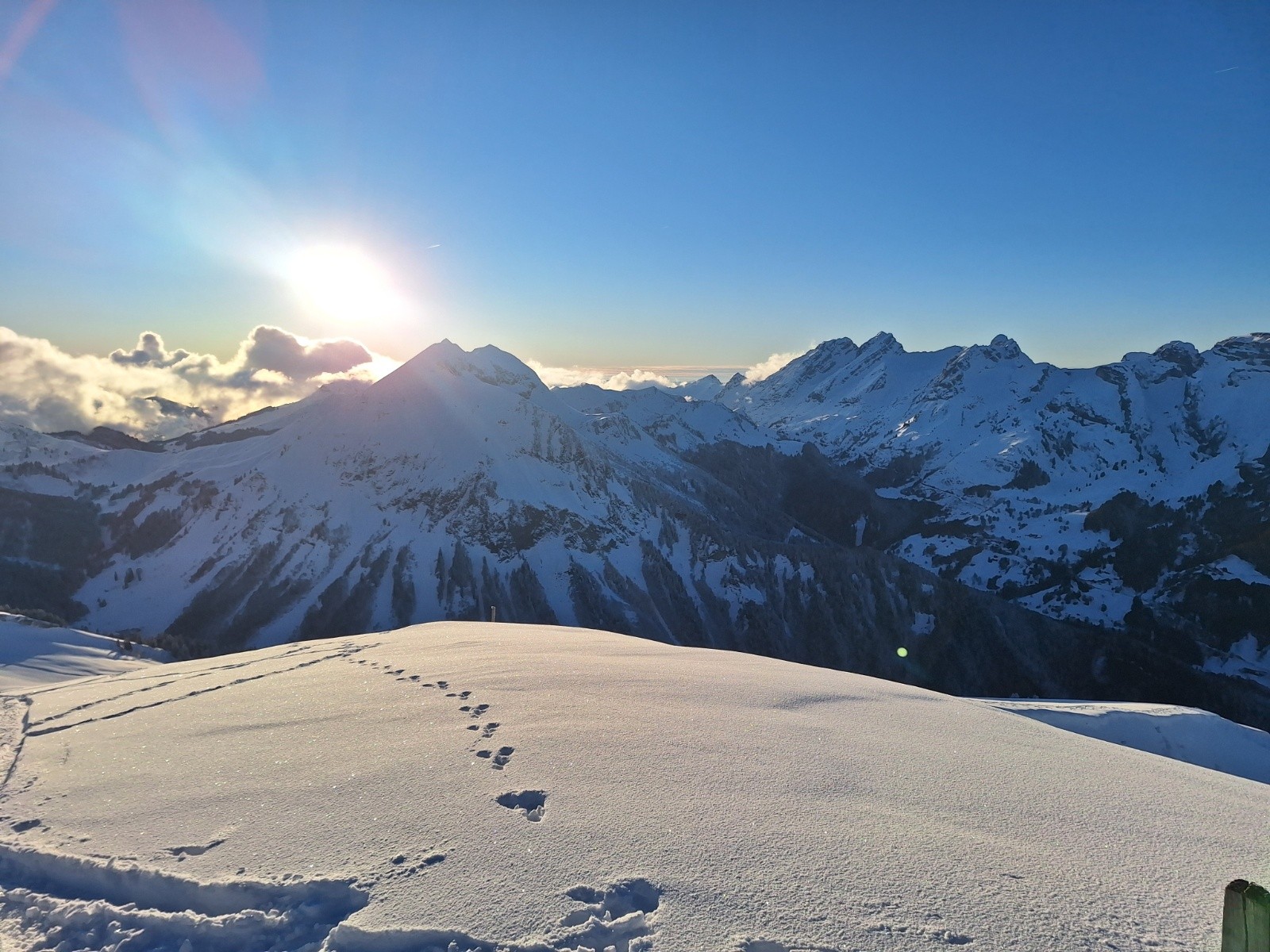 Arrivé au sommet, je prends le temps de profiter du panorama avec le soleil couchant et les sommets plâtrés! Magnifique!
