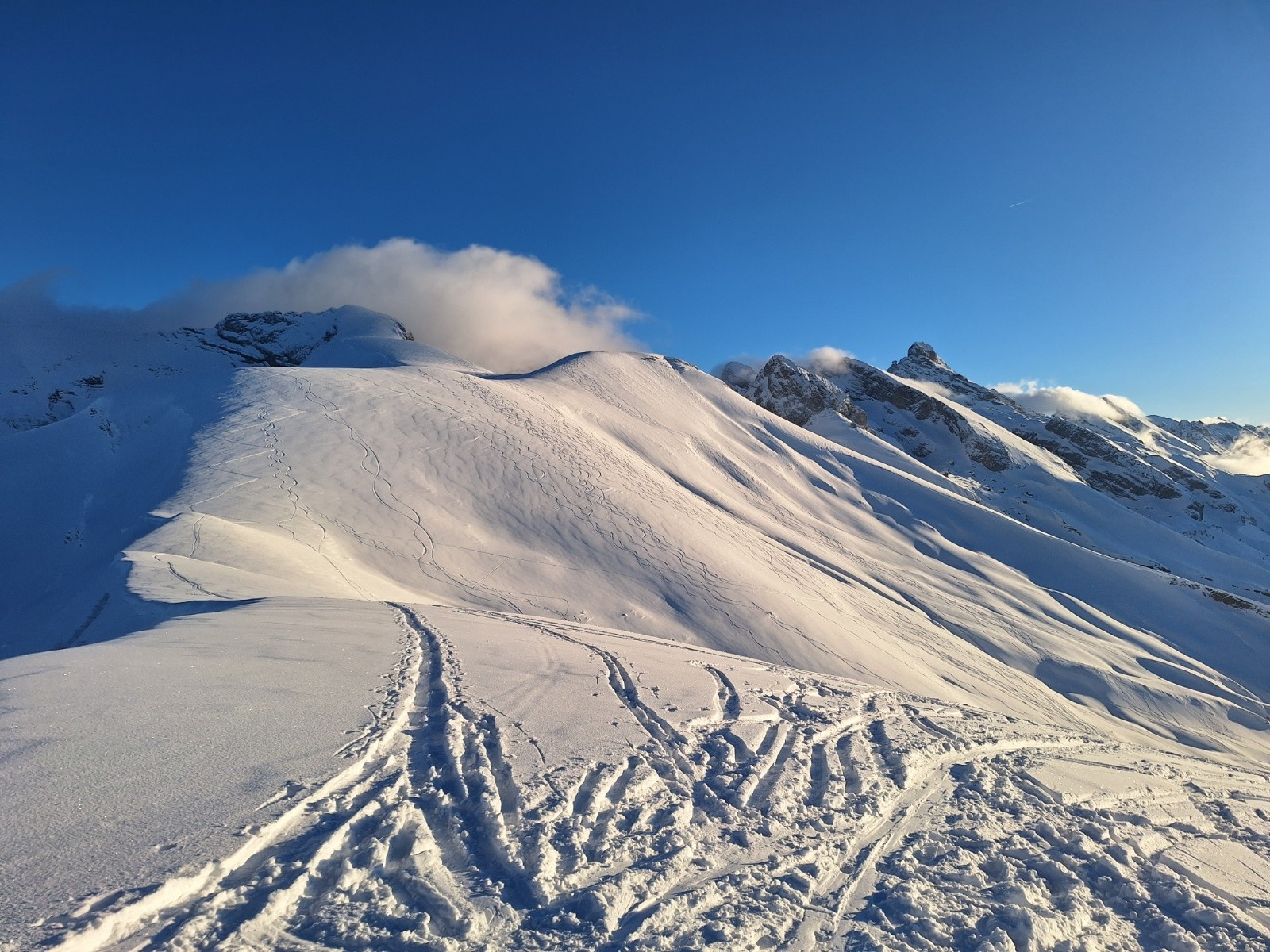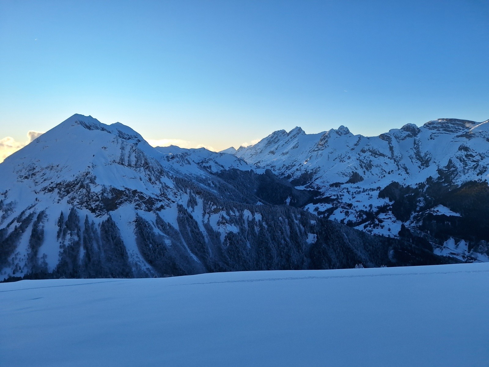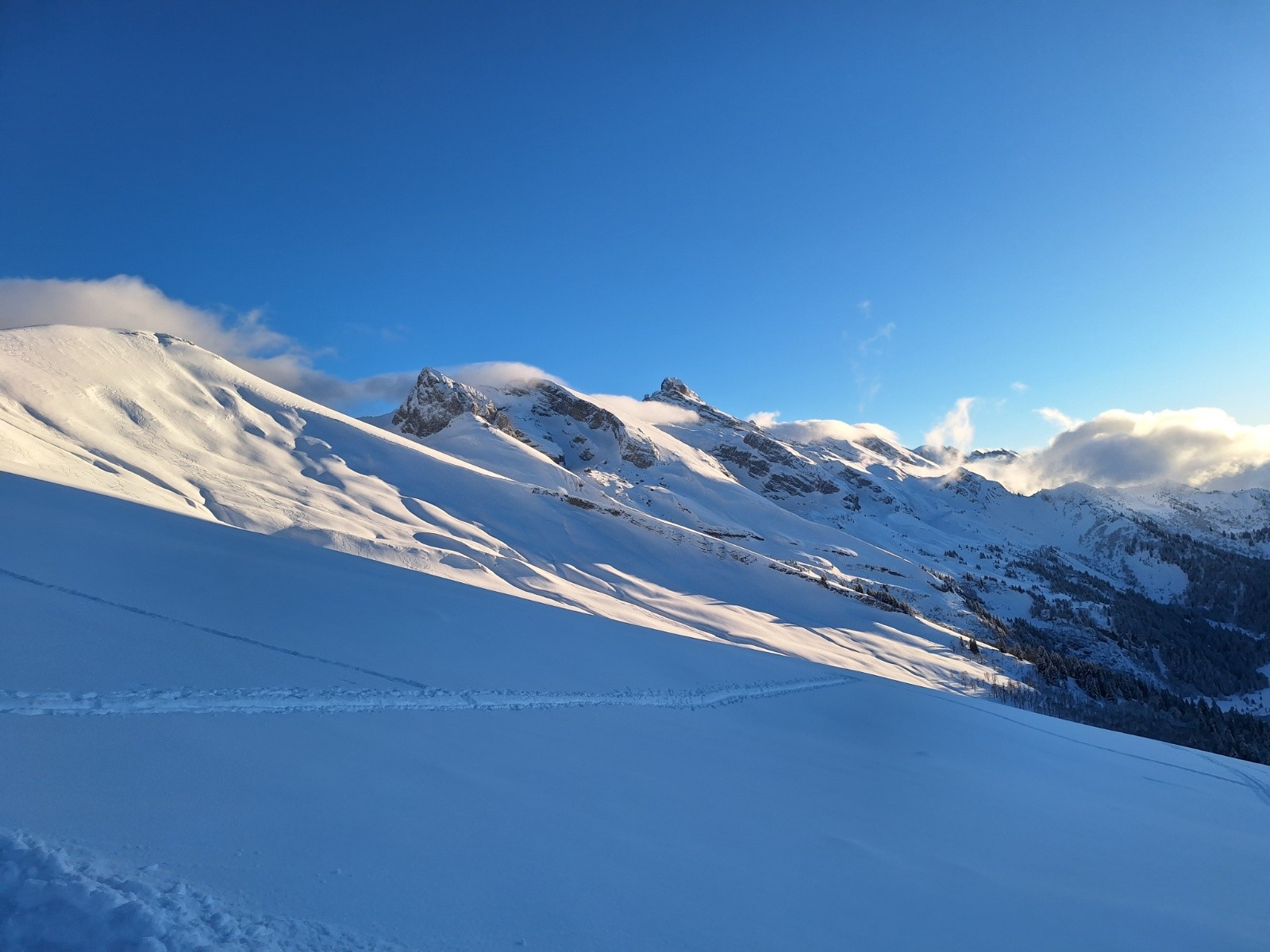 Le chemin passe à skis et mieux que samedi. Bonne montée jusqu'à la sortie de la forêt puis arrivent les champs avec, semblerait-il, pas mal de traces de descente... aïe aïe aïe est-ce que tout va être ravagé? En fait non... finalement elles sont toutes concentrées sur l'arête, laissant toute la face vierge... marrant le projet de s'être engoncé comme ça sur 4 ou 5 mètres de large 😅