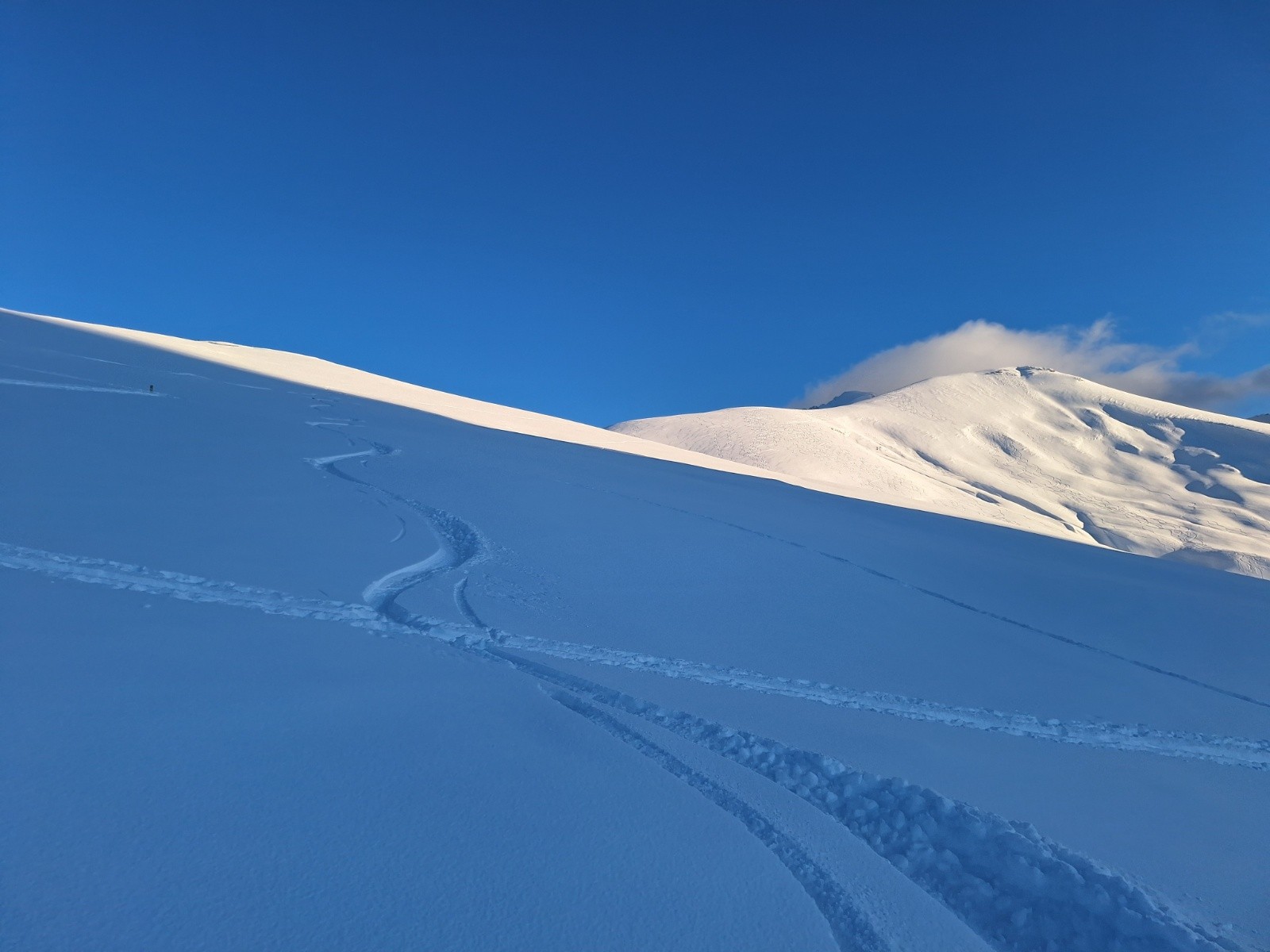 J'enchaîne sur la descente qui est excellente avec cette belle poudreuse sur fond dur!