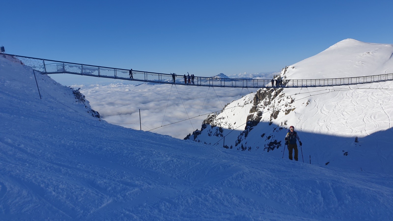 Nous, on a poussé le curseur à fond, open bar, hé hé, à 85 ans, on craint degun ! La bonne mère veille, on est super rieurs, elle (en robe) erre du nord au sud, nous on décolle et lésine un peu, mais tout cela nous botte (faut suivre… l'itinéraire). Bref (faut faire sobre, maintenant), un rien a suffi aux papys papotants mais pas impotents : des sapins enguirlandés, un soleil voluptueux, une glisse souple même pas gâchée par de trop pressés prédécesseurs. Snow, sweat and sun, on vous dit !