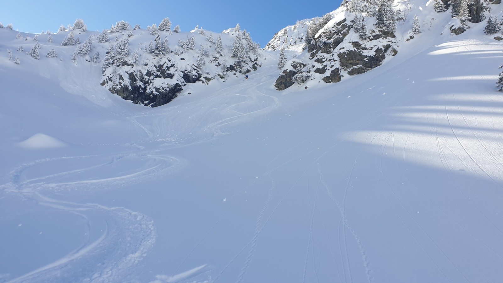 Conditions pour le ski : poudre froide légère, sauf poudre humidifiée en exposition Est.