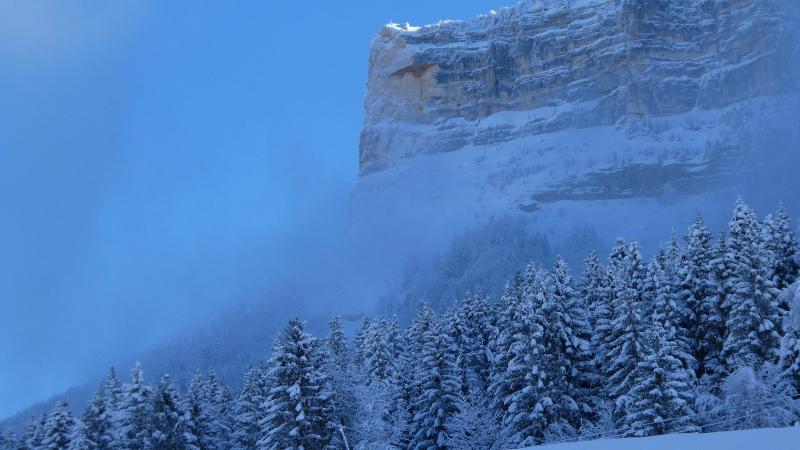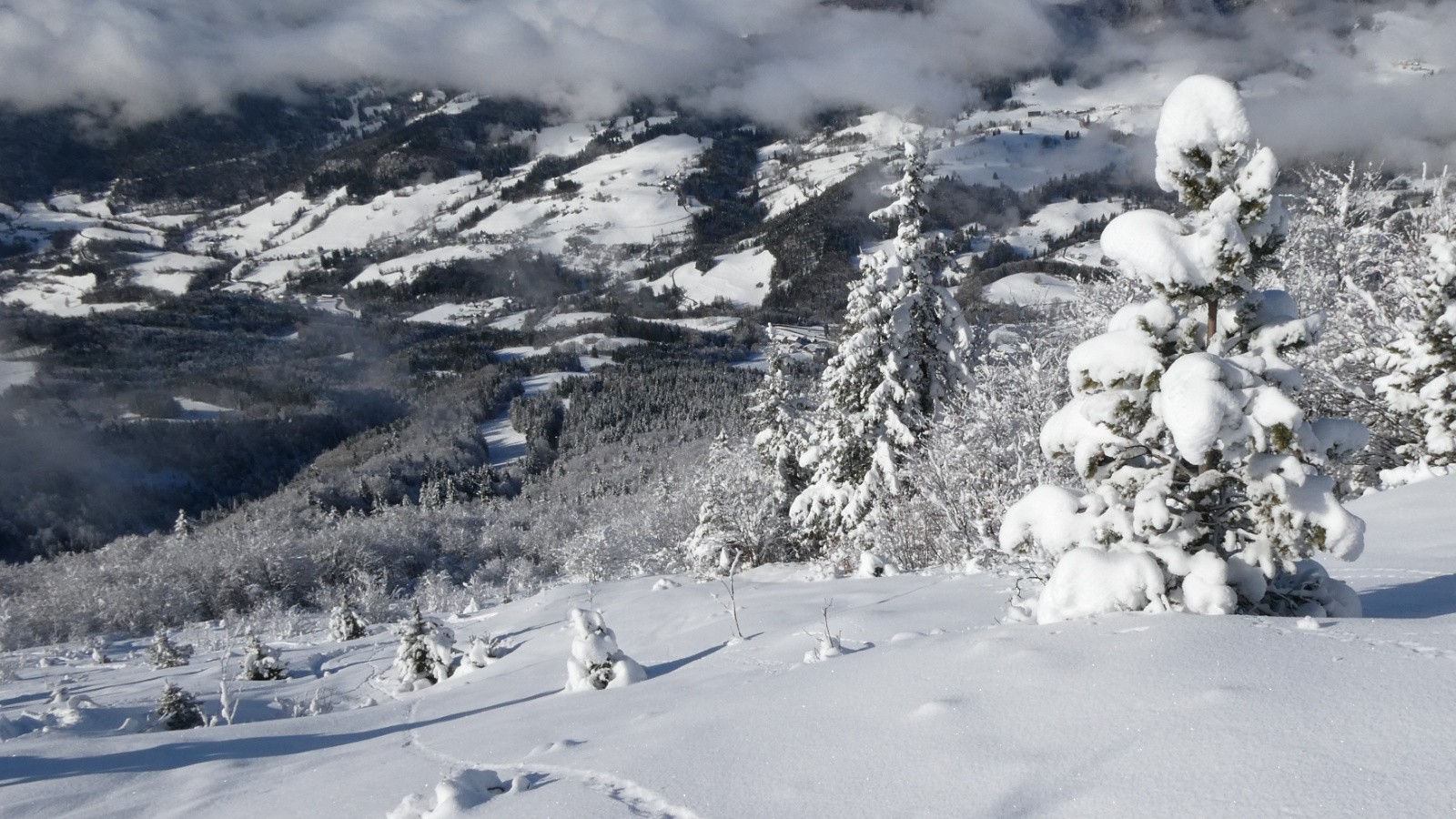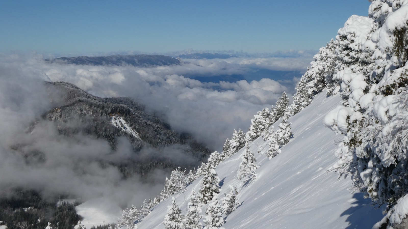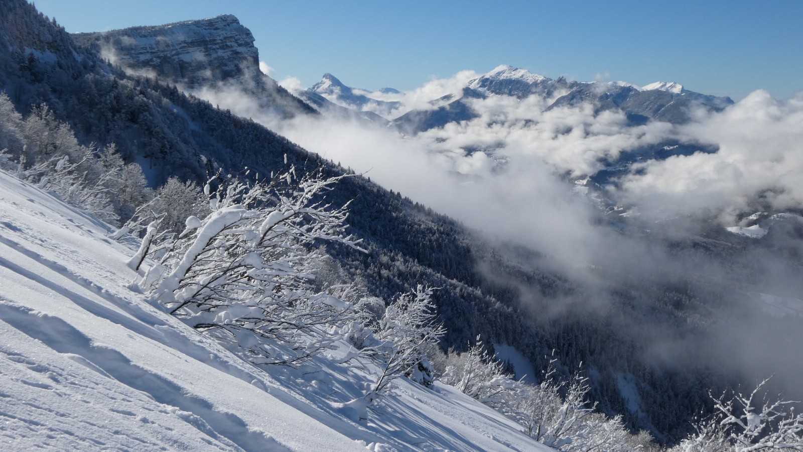 Enfin, le 3e ciel , antichambre du 7e, fut atteint. A la station du Granier, le prix du ticket d’entrée n’était pas affiché. Mais je le connaissais. Quoique, il me semble que depuis mon dernier passage en fév 2022, la végétation se soit densifiée. Quoiqu’il en soit, j’étais prête à payer le prix. Quand, devant vous, s’étend un champ de poudre dont la date de péremption n’est que pour demain, quand, à vos pieds, se prélassent toute la Vallée des Entremonts et quelques brumes résiduelles, quand les lointains N paraissent être sous la crasse alors que vous pensez à sortir la crème solaire, quand, au-dessus de vous, se dressent les falaises sommitales piquetées de petits pins fort esthétiques, quand vous sentez que vous tenez un champ bourré de neige qui ne demande qu’à voler, vous oubliez de suite ce qu’il vous a fallu d’opiniâtreté pour surmonter tous les obstacles sournoisement jonchés dans la forêt. Vous oubliez même qu’il n’y a pas d’autre chemin de retour pendant que vous bavardez tranquillement avec les pompiers secouristes des Savoies et de la Loire réunies, en exercice, et qui raquettes aux pieds svp, viennent du Granier tout sourire bien qu’ayant bien brassé.