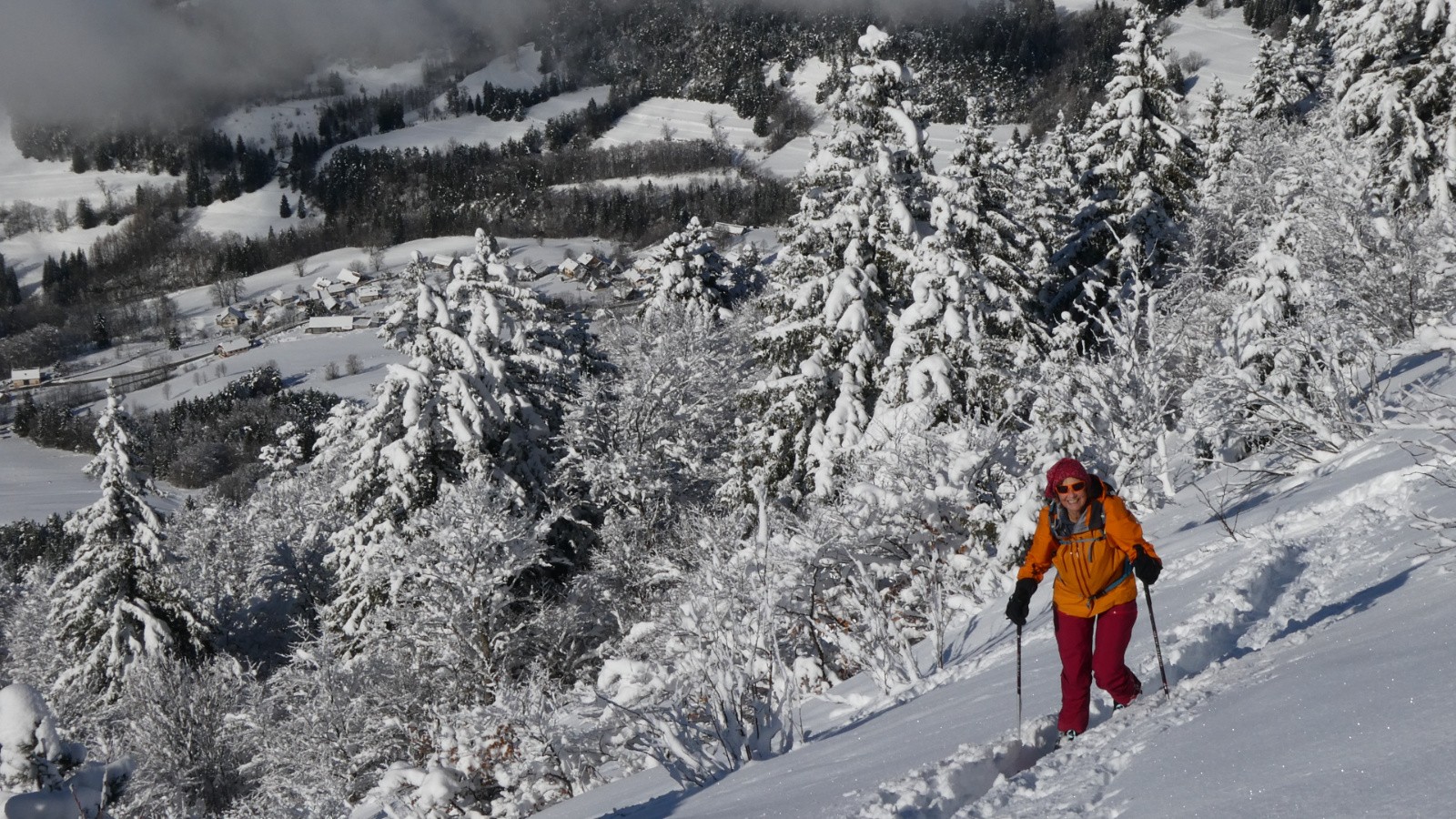 Conditions nivo et activité avalancheuse : environ 50cm de neige récente dans les prés du haut, un peu moins en forêt mais on ne touche quasiment rien ; aucun signe d'instabilitéSkiabilité : 🙂 Bonne