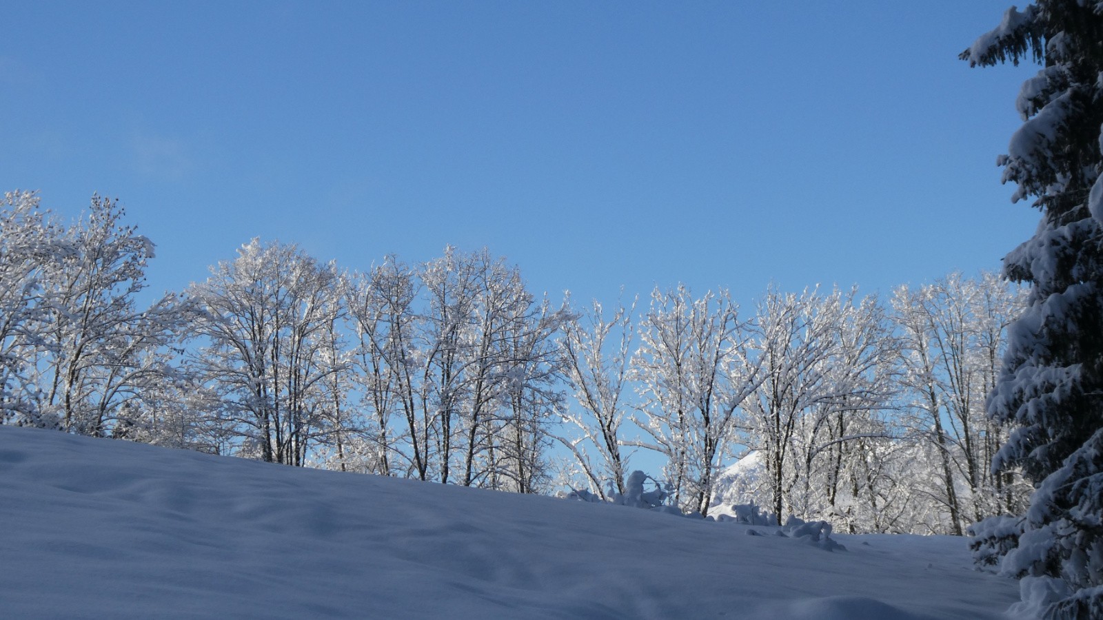 Puis vint la section forestière. Là, on ne rigole plus. Notre Slovène s’engouffra dans les bois sans en connaître l’issue et nous ne la retrouvâmes qu’à la sortie, laissant le soleil éclairer encore davantage son radieux sourire. Pour moi, ce fut laborieux. Vraisemblablement, un randonneur en raquettes a dû monter par le sentier d’été qui monte abruptement dans la forêt, des randonneurs à skis se sont calés dans cette trace horriblement raide sans se soucier de mon confort à venir. Occupée (bien occupée !) par l’évitement de toute glissade en arrière, je récitai comme un mantra « Monte au Mt Fuji, oh escargot ! Monte lentement, mais monte ! » (ça prend du temps, mais ça marche). Jacques, le patient peut en témoigner.