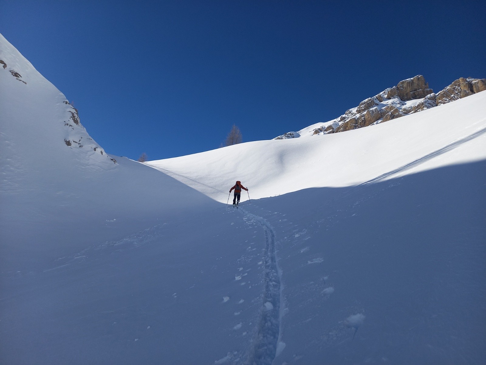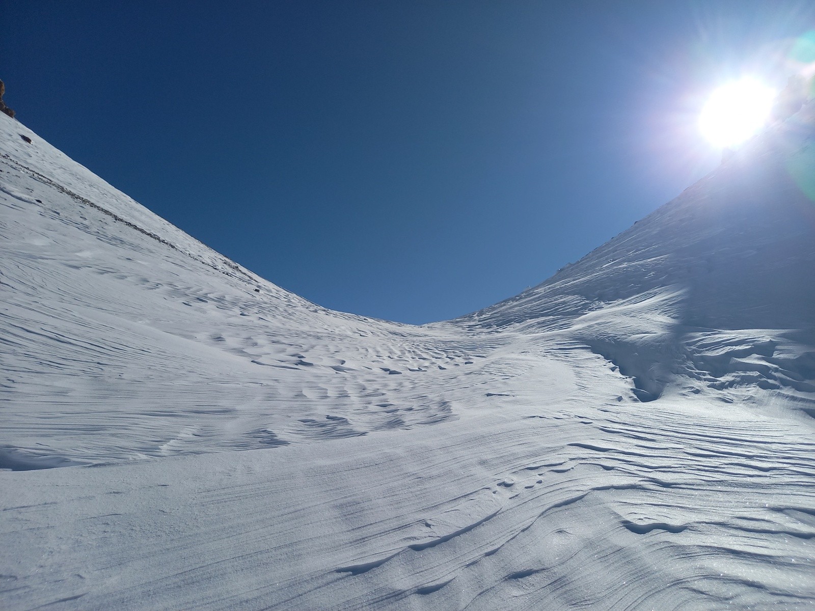 Conditions pour le ski : excellentes, un peu travaille par le vent autour du col