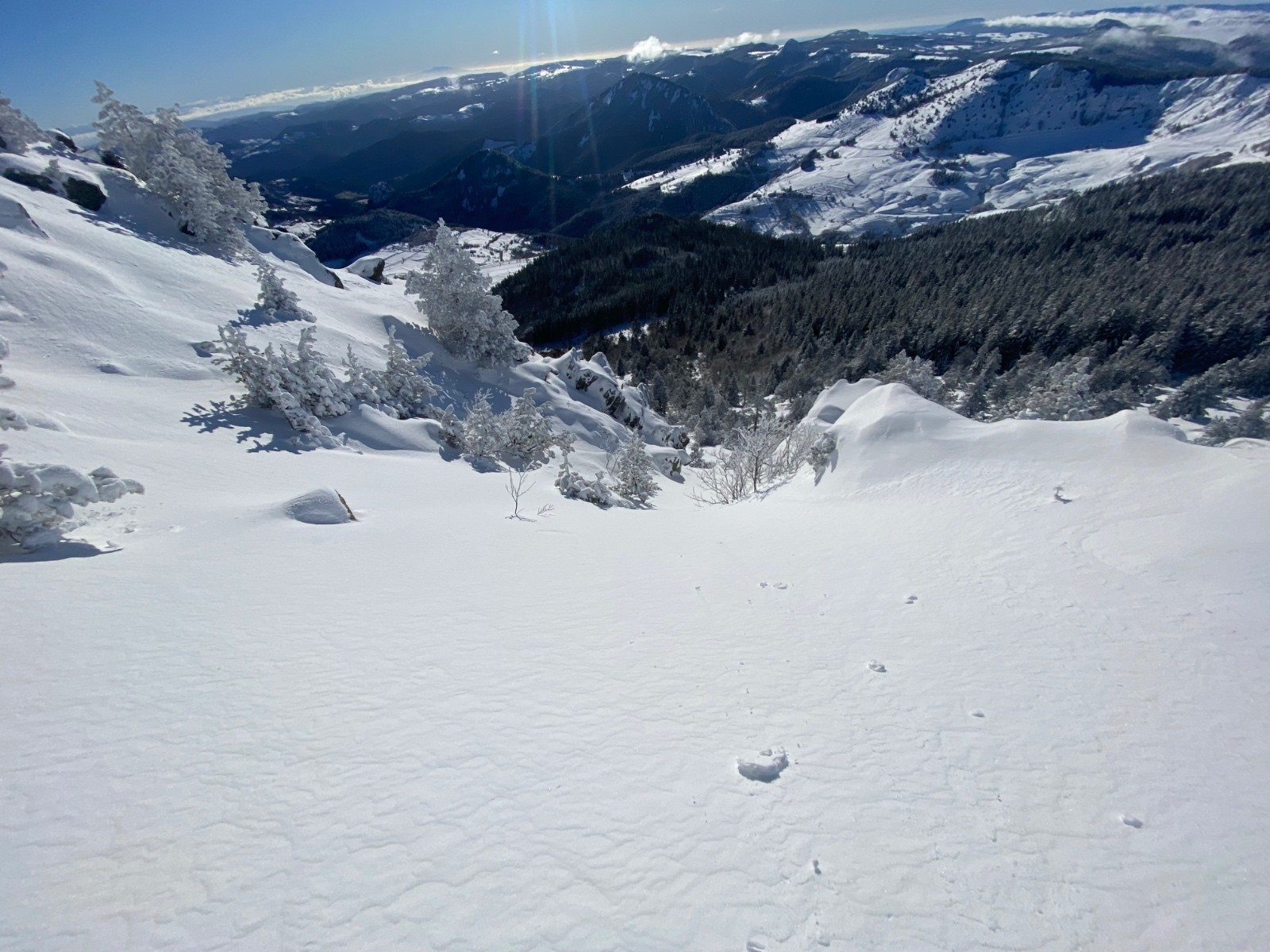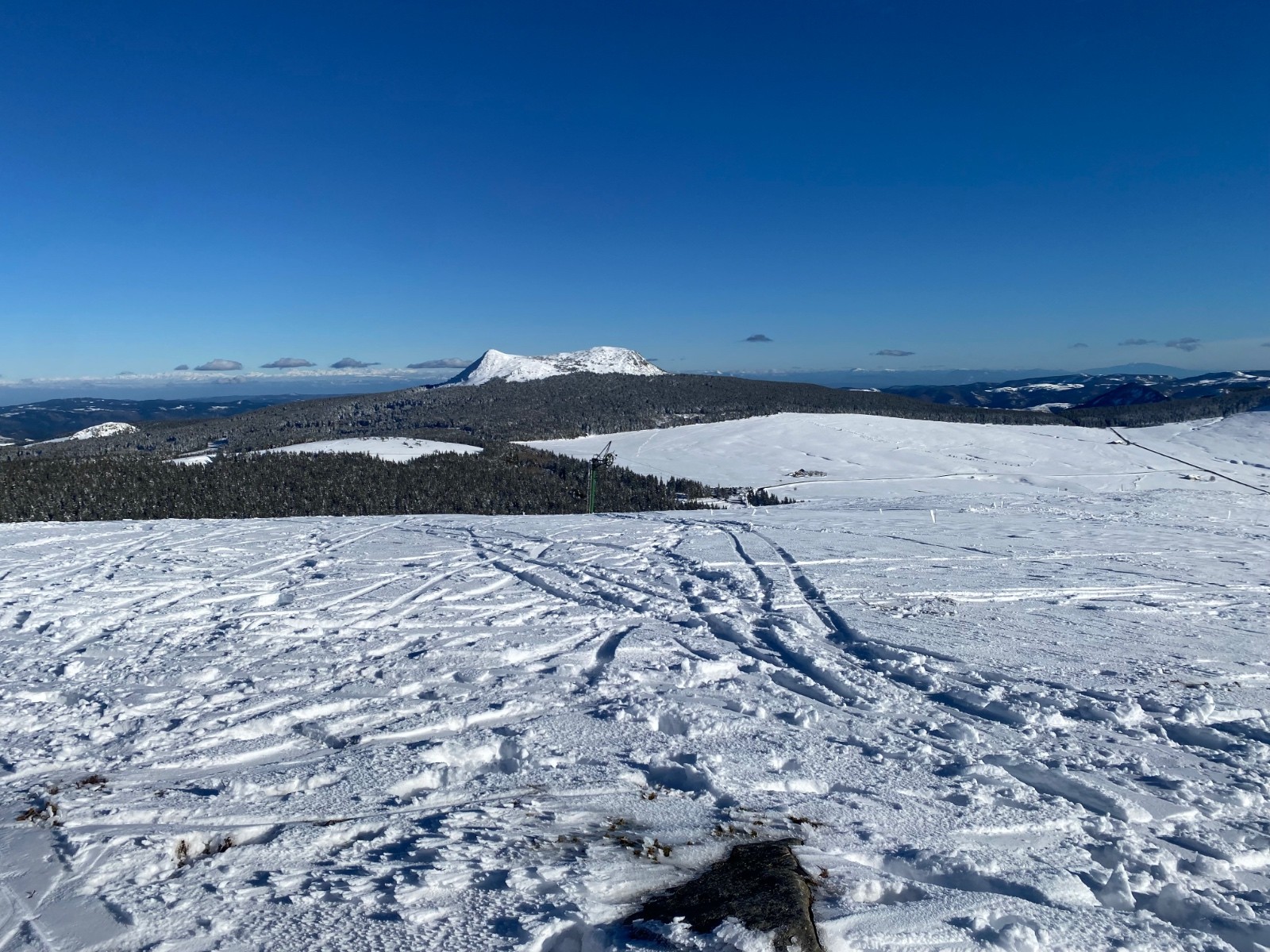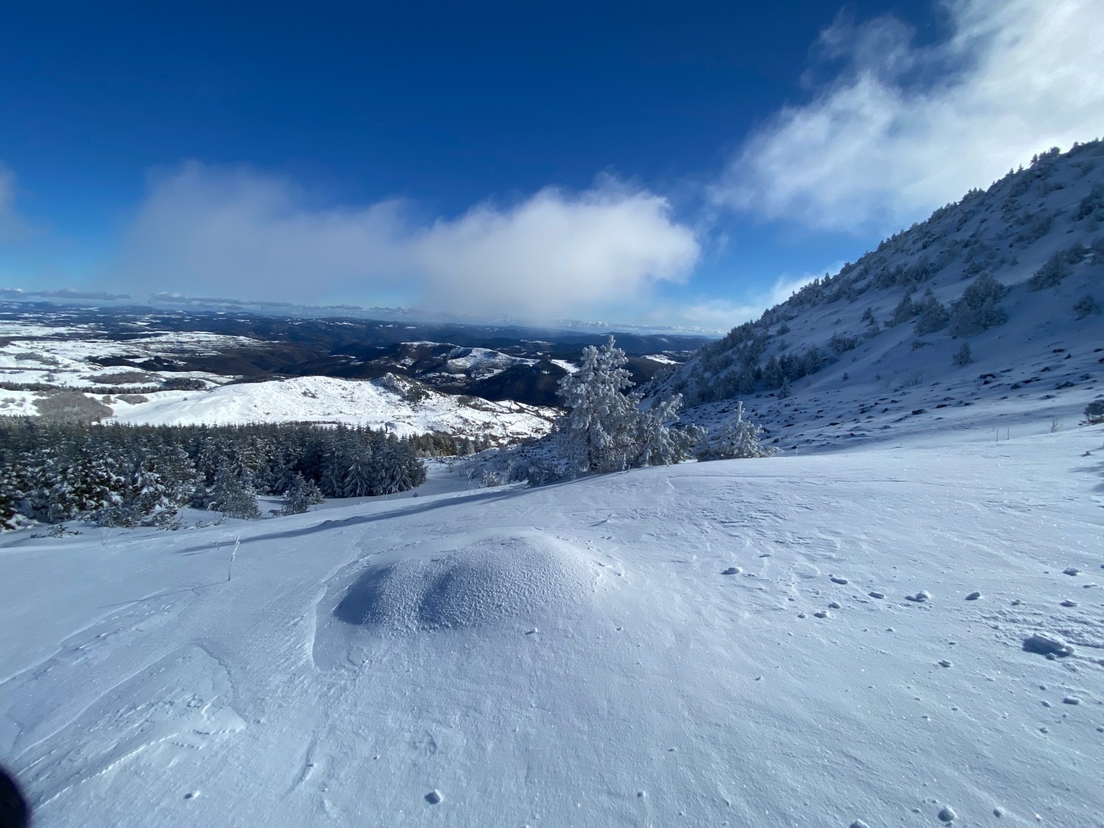 Départ 9h30 du parking direction le Mezenc pour tenter ces couloirs Sud qui sont d’excellentes descentes! Bonne nouvelles, il sont pleins! Ça passe sans touchettes! La mauvaise est que les clapas un peu plus bas ne le sont pas (ne suivez pas ma trace sur le bas). Donc c’était un peu « l’empeite » pour se sortir de la, car en plus des clapas peu recouvert, ça chauffait sévère! Quelle suée!! Arrivé en haut, on tente un petit tour sur l’itinéraire qui va vers la charra.. et c’est parti pour d’excellents virages plein poudre! Mais malheureusement ici aussi, les clapas ne sont pas recouverts donc la descente a été vite stoppée.. mais ces quelques virages etaient tellement bon que je suis retourné une deuxième fois! La descente ouest était très bonne également avec encore de la poudre au milieu de l’après midi.. puis direction l’Alambre histoire de voir autre chose … mais là c’était massacre à la dameuse.. tout a été retourné mais pas damé.. bref c’était vraiment pas ouf.. la tentative sous les téléski, n’était pas dingue.. ce n’était pas retourné mais c’était de la neige trempée, réchauffée et qui commençait à regeler, bref on a vu mieux! Mais il y avait encore quelque bons virages en haut de l’Alambre dans les coins qui n’avaient pas vu le soleil!