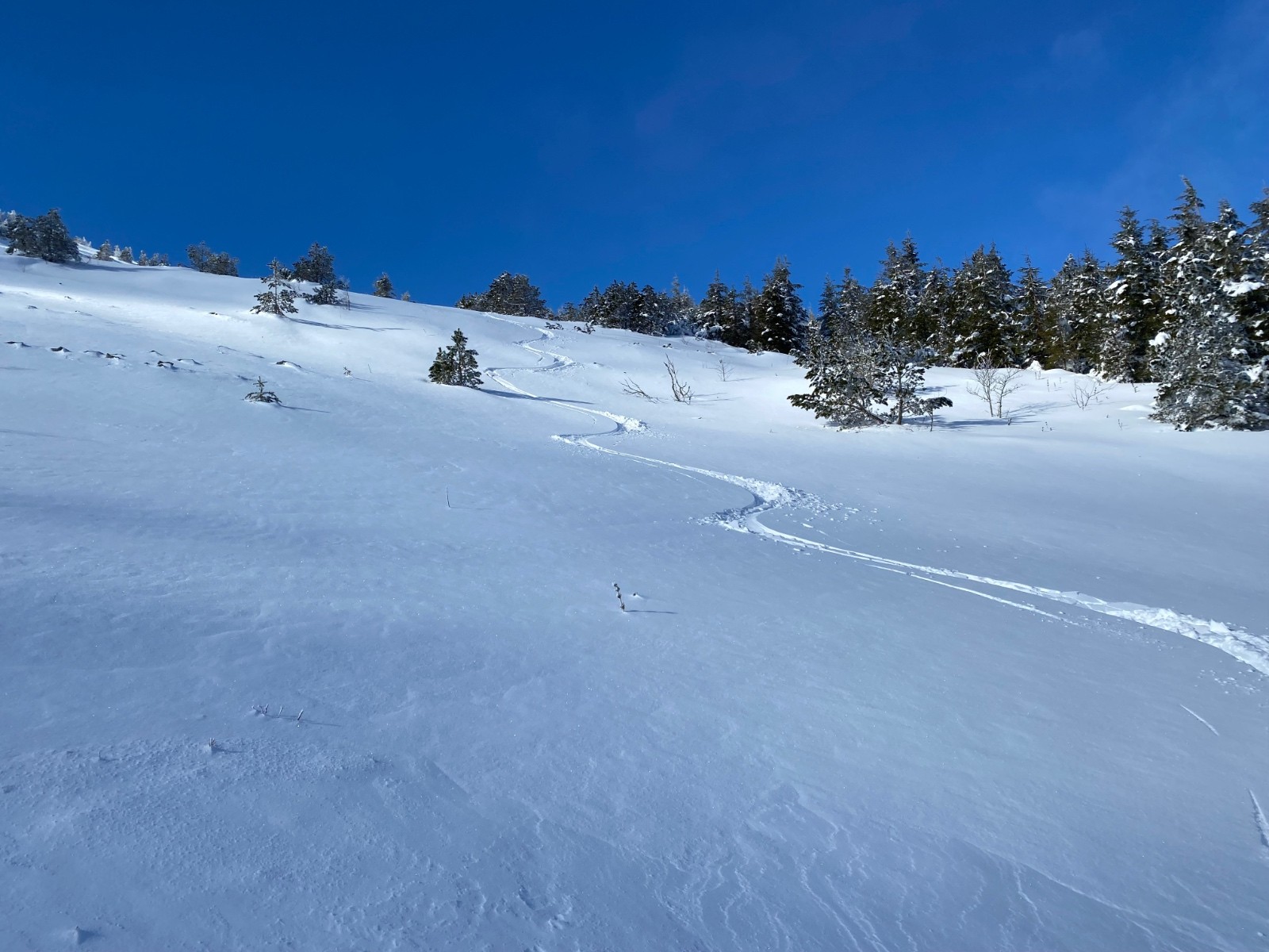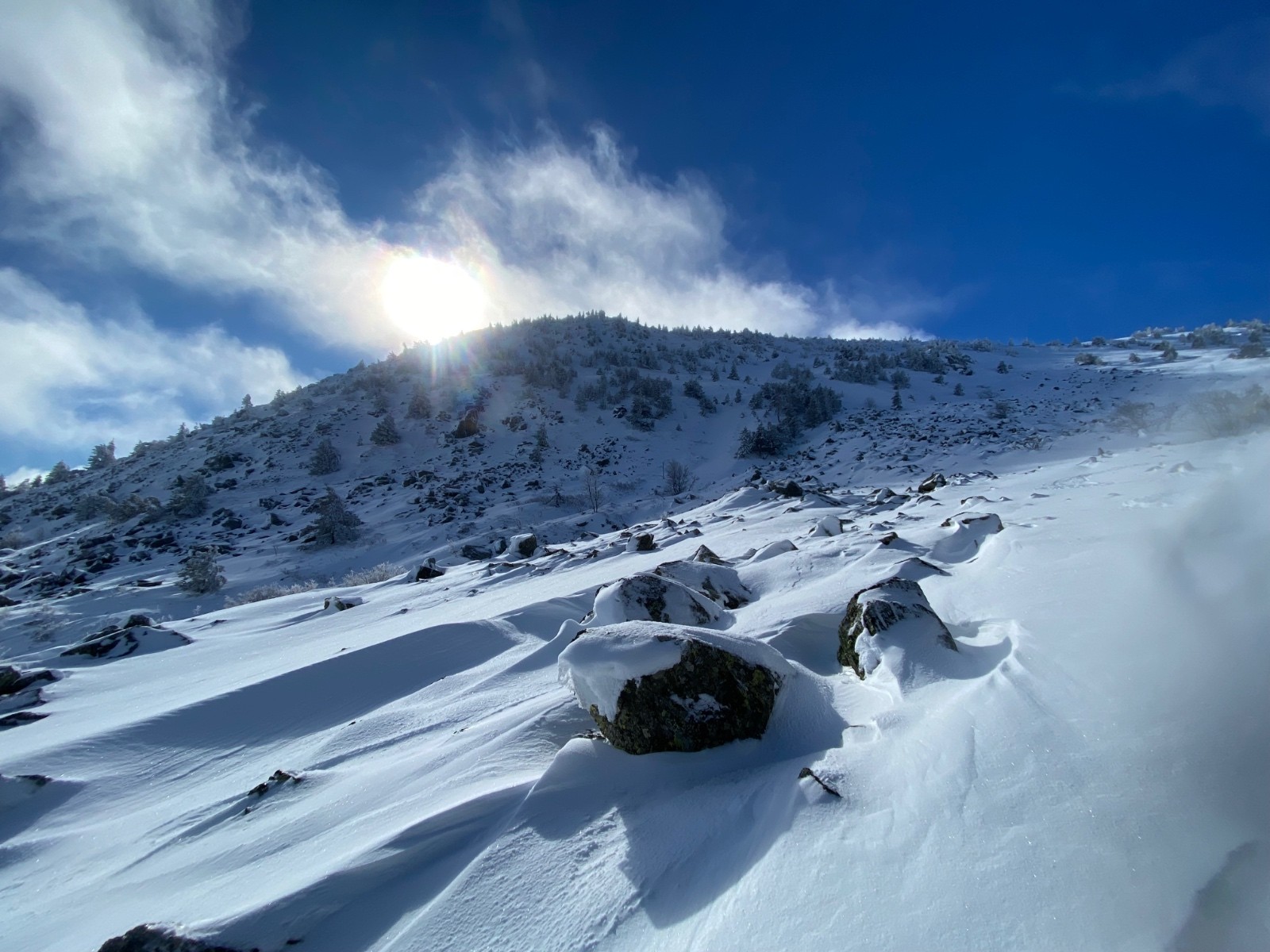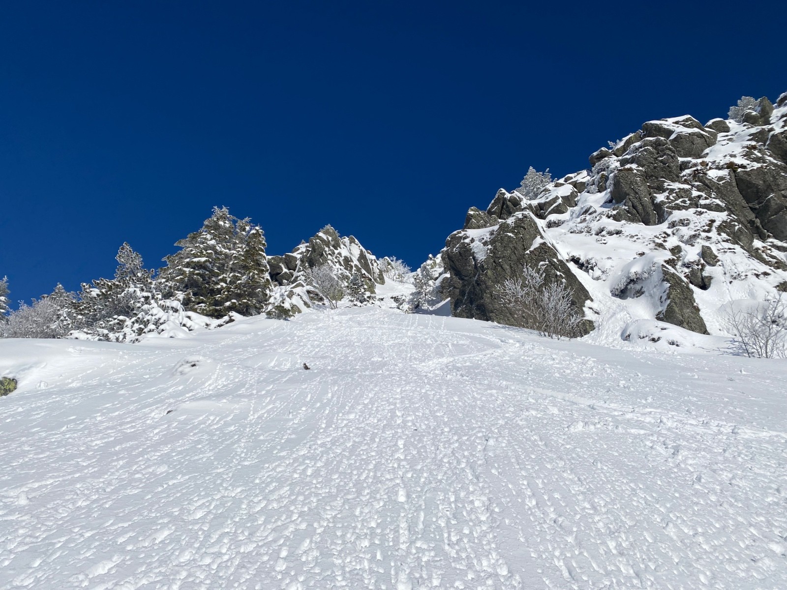 Départ 9h30 du parking direction le Mezenc pour tenter ces couloirs Sud qui sont d’excellentes descentes! Bonne nouvelles, il sont pleins! Ça passe sans touchettes! La mauvaise est que les clapas un peu plus bas ne le sont pas (ne suivez pas ma trace sur le bas). Donc c’était un peu « l’empeite » pour se sortir de la, car en plus des clapas peu recouvert, ça chauffait sévère! Quelle suée!! Arrivé en haut, on tente un petit tour sur l’itinéraire qui va vers la charra.. et c’est parti pour d’excellents virages plein poudre! Mais malheureusement ici aussi, les clapas ne sont pas recouverts donc la descente a été vite stoppée.. mais ces quelques virages etaient tellement bon que je suis retourné une deuxième fois! La descente ouest était très bonne également avec encore de la poudre au milieu de l’après midi.. puis direction l’Alambre histoire de voir autre chose … mais là c’était massacre à la dameuse.. tout a été retourné mais pas damé.. bref c’était vraiment pas ouf.. la tentative sous les téléski, n’était pas dingue.. ce n’était pas retourné mais c’était de la neige trempée, réchauffée et qui commençait à regeler, bref on a vu mieux! Mais il y avait encore quelque bons virages en haut de l’Alambre dans les coins qui n’avaient pas vu le soleil!