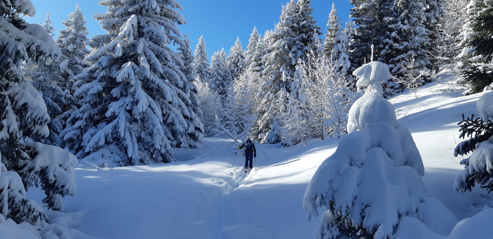 Deux traces matinales nous ont précédé, mais il y a encore un peu de place pour se faire plaisir et ça commence fort avec une prairie sommitale sublime en poudreuse légère, profonde avec fond dur, mais c'est court et on rentre très vite dans une forêt dense, et en mode sanglier. Malgré les traces on a recherché les meilleurs passages ( parfois bien raides) dans les parties aérées, puis on arrive enfin dans la dernière partie basse, où un court déchaussage est même nécessaire, pour trouver un bon chemin à découvert, bien enneigé, nous ramenant sur la route de Perquelin.