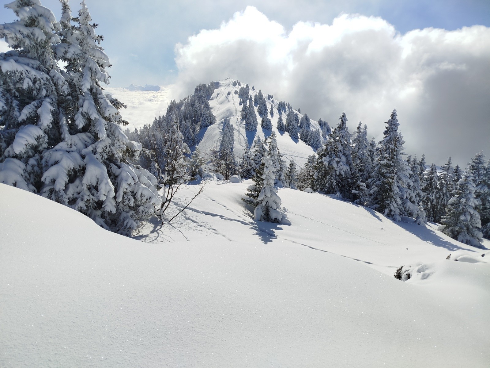 Conditions pour le ski : Neige fraiche, poudreuse sur fond dur pour une grande partie de l'itinéraire, encore déficitaire sous 1200m environ, surtout dans les parties abritées.