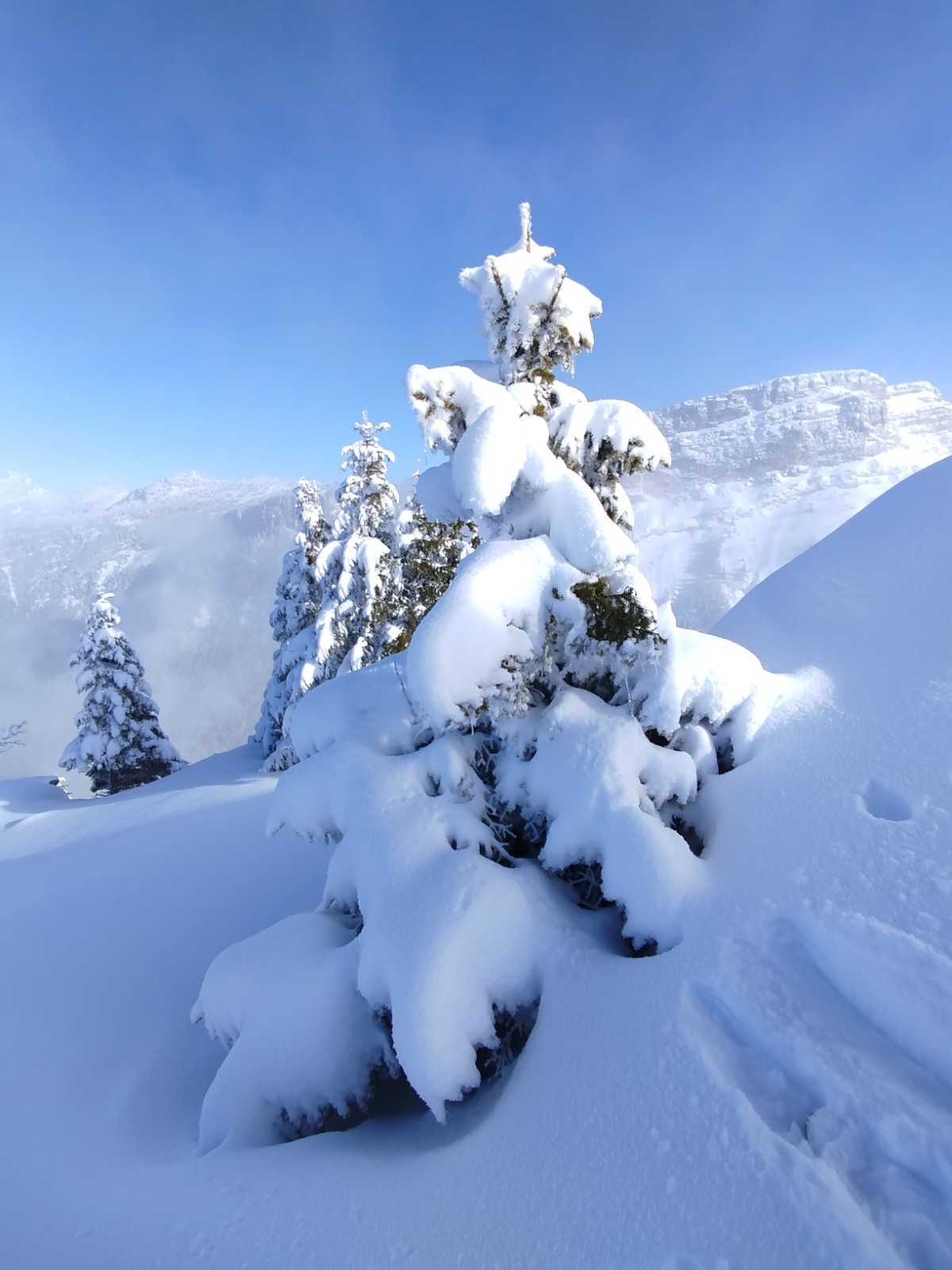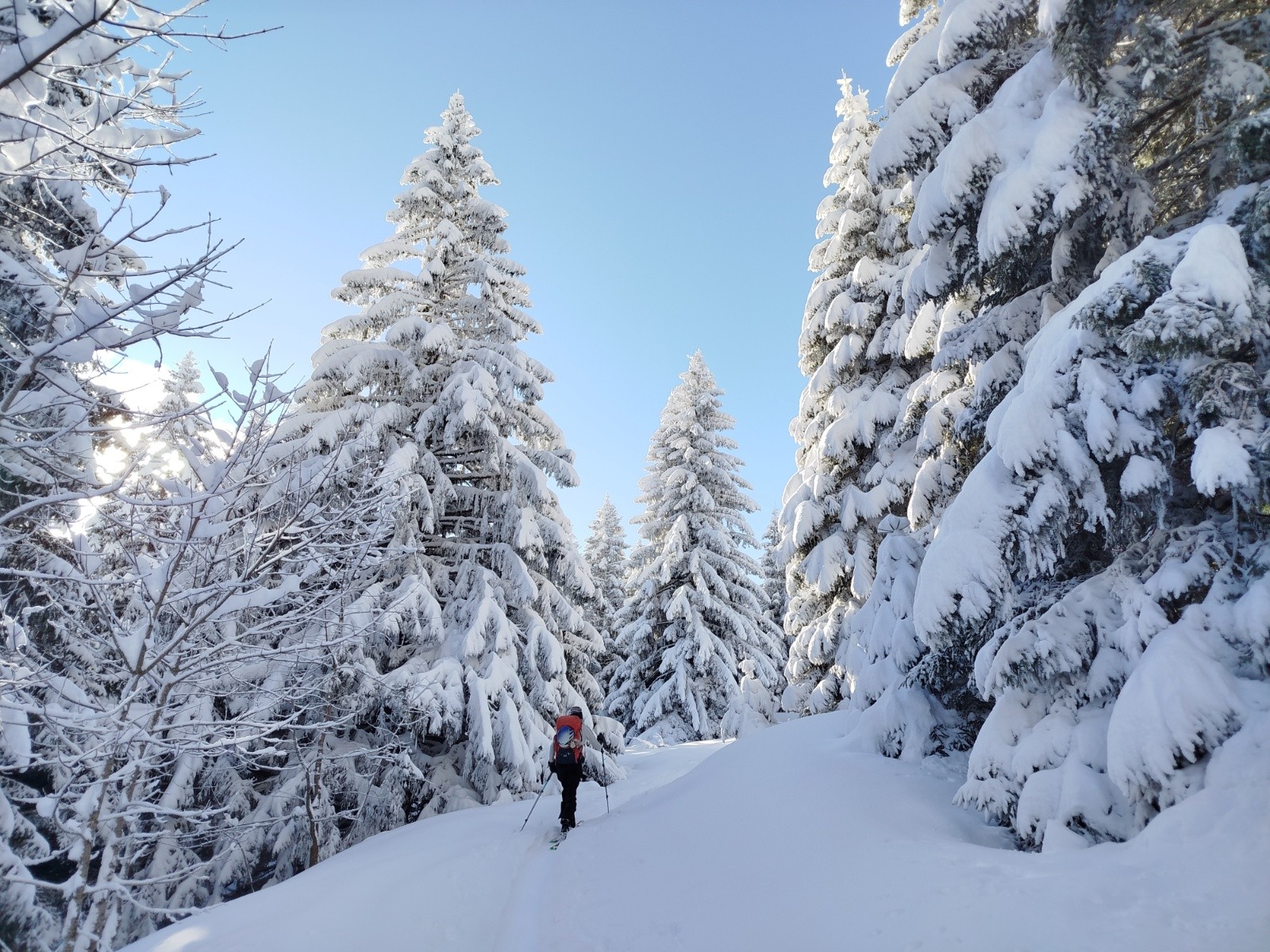 Combe du Giclard, poudreuse profonde sur fond dur sur une première partie, aucune touchette sinon quelques troncs, branches, puis ça se complique dans la dernière partie, 1300m environ, dans une forêt très dense où il faut chercher les parties découvertes, chemins...