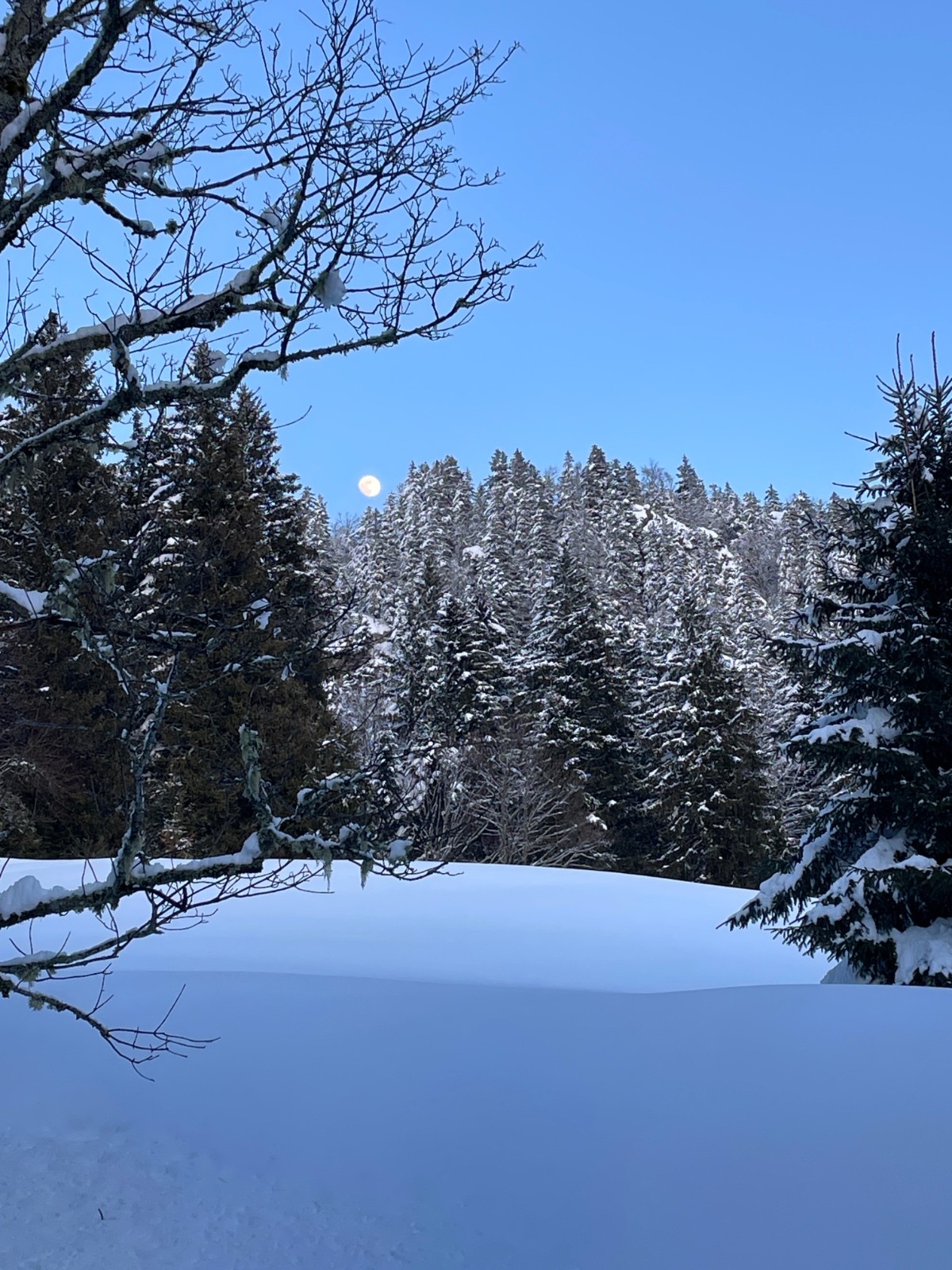 Je me dis que vu la pluie en plaine toute la matinée sa a du en remettre une bonne couche… rate la pluie a du être plus haute que prévu c’est trempé quasi jusqu’en haut des requin partout sur la piste j’ai hésité à continué en arrivant au habert de chartrousette par les traces de raquette. L’épaisseur de neige augmente donc je continue en espérant une neige meilleure en vain, j’avance mais aucune amélioration de la neige c’est très lourd mais aucuns bottage. Je récupère des trace de descente de ski que je me sers pour monté qui m’a bien aidé faire la trace dans cette patchioque aurait été encore pire. La vue depuis le habert des roches est superbe en distingue bien la combe de l’if autre couloir que j’aimerais faire mais pas encore l’expérience et la technique suffisante pour s’y engager. Arriver dans la prairie juste 2 trace sur le haut autrement entièrement vierge c’est magnifique avec le couché de soleil sur le charmant som et le levé de lune derrière le rocher de cambise. Petit coup d’œil sur l’entrée du couloir pas évident pas mal d’arbre manque encore de la neige pour le faire jusqu’en bas je pense une prochaine fois. Je remonte un peu la prairie et en avant pour la descente, la prairie porte bien mais je sens que ça va pas être une partie de plaisir, c’est lourd très lourd sur la piste peu large compliqué de faire des virages, chasse neige pareil très physique, sa s’améliore à mesure que la quantité de neige diminue mais les requin sont pas loins. Arrive à chartrousette hors de question de descendre par le chemin de montée je prend la route en direction du monastère, a part la partie plate et le passage du tunnel se fut le meilleur ski pente suffisante peu de neige juste dame par le passage des raquette jusqu’à la voiture déchaussage au niveau du monastère aussi.
