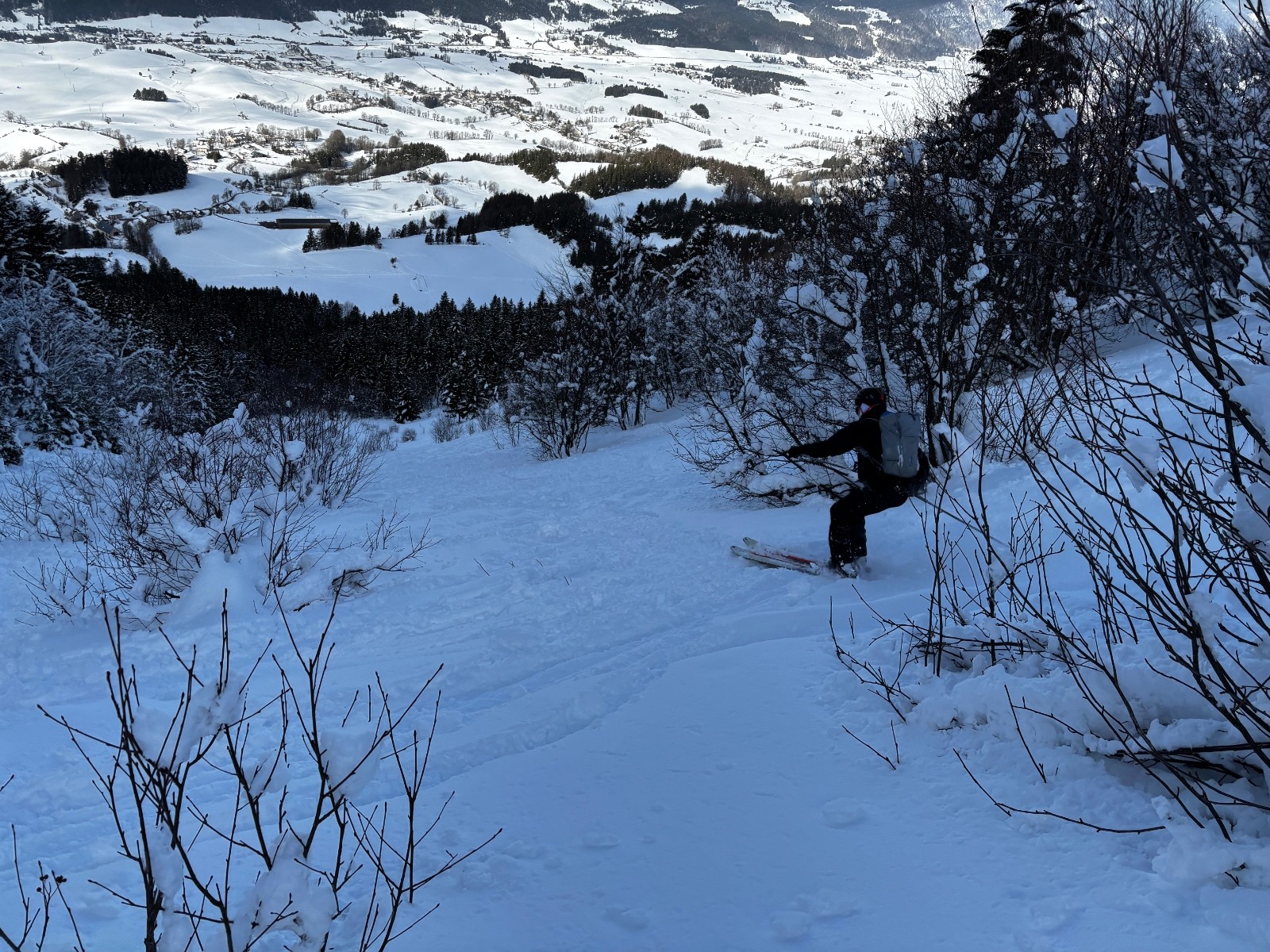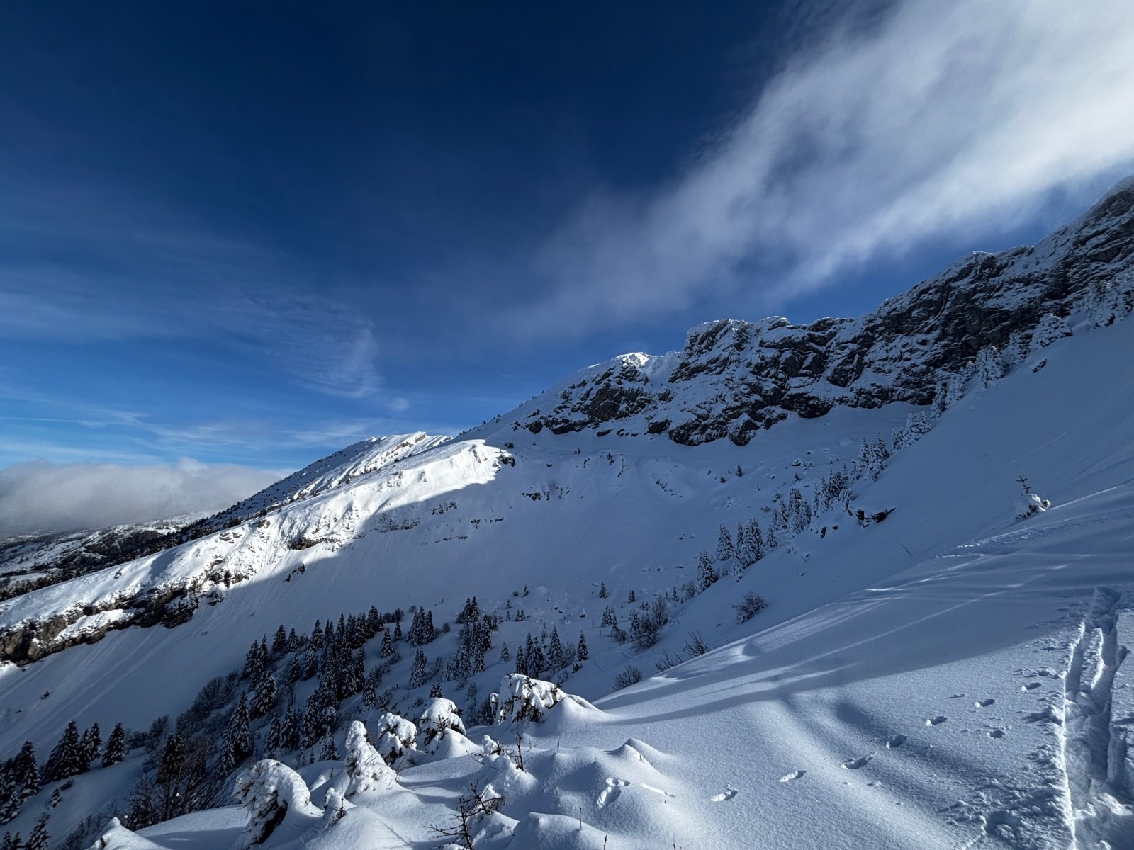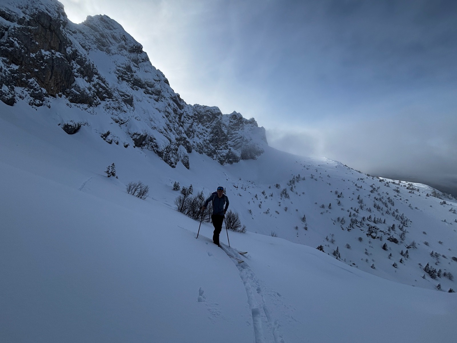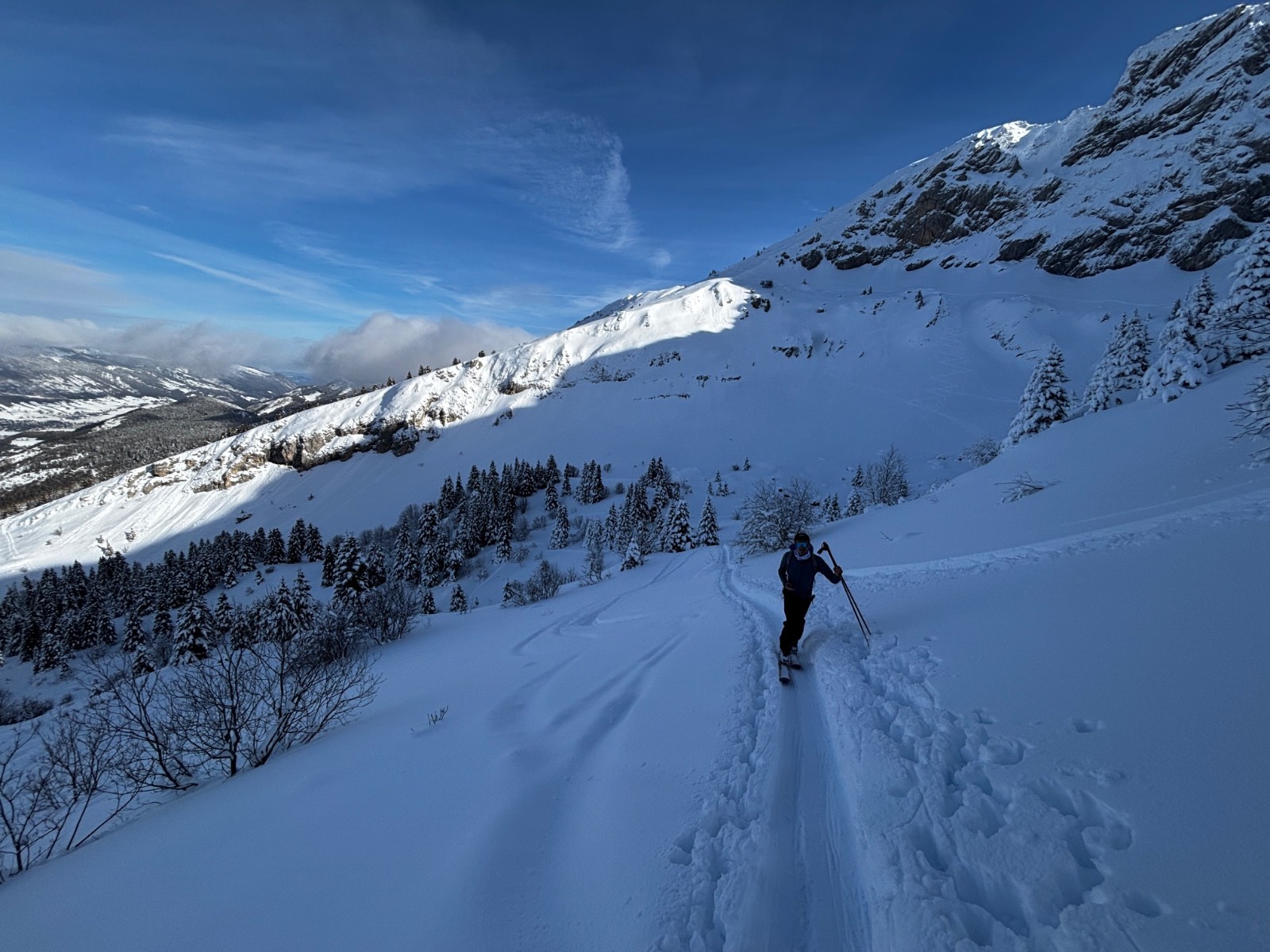 Météo/températures : meilleur qu'annoncé, finalement le plafond est haut et les visibilités sont bonnes. Pas de vent, il fait chaud dans la combe, avec cette trace trop raide... Le ciel bleu arrive ensuite en mi-matinée.