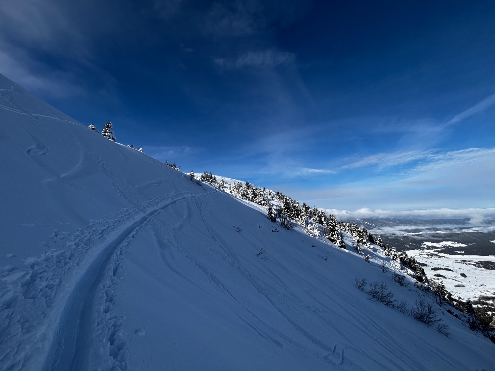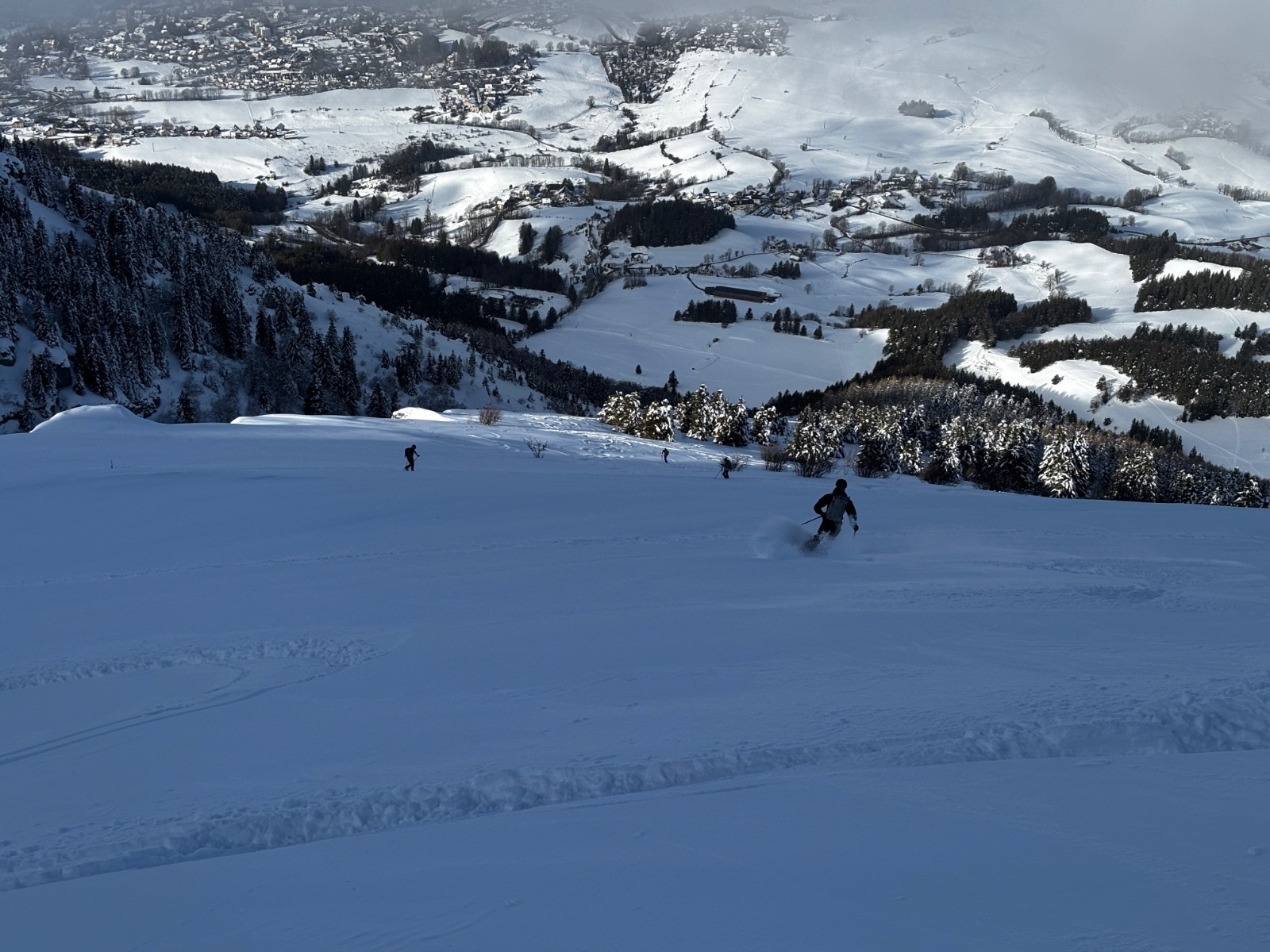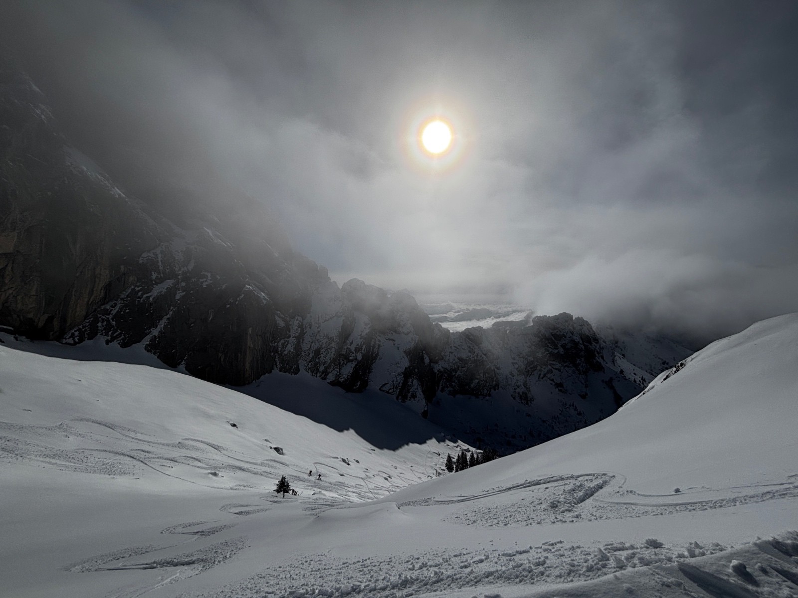 Météo/températures : meilleur qu'annoncé, finalement le plafond est haut et les visibilités sont bonnes. Pas de vent, il fait chaud dans la combe, avec cette trace trop raide... Le ciel bleu arrive ensuite en mi-matinée.