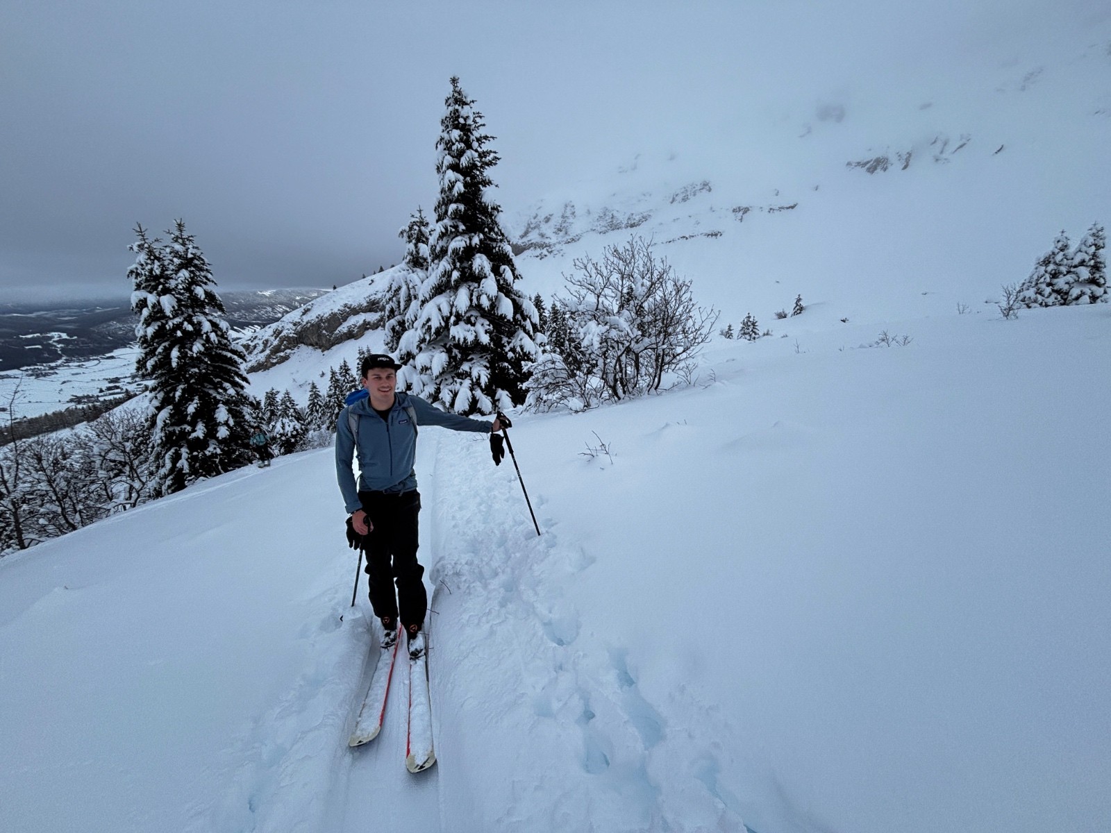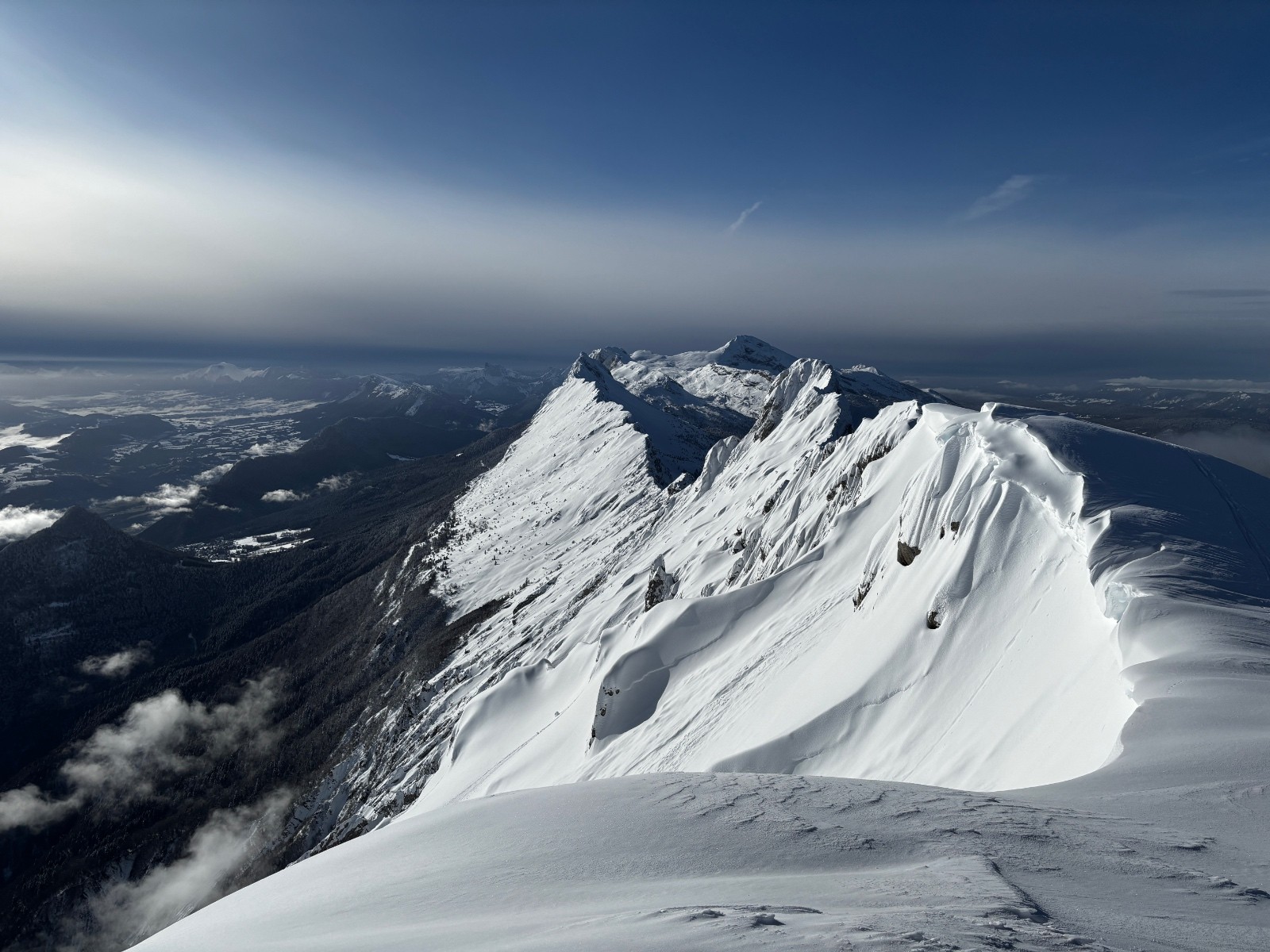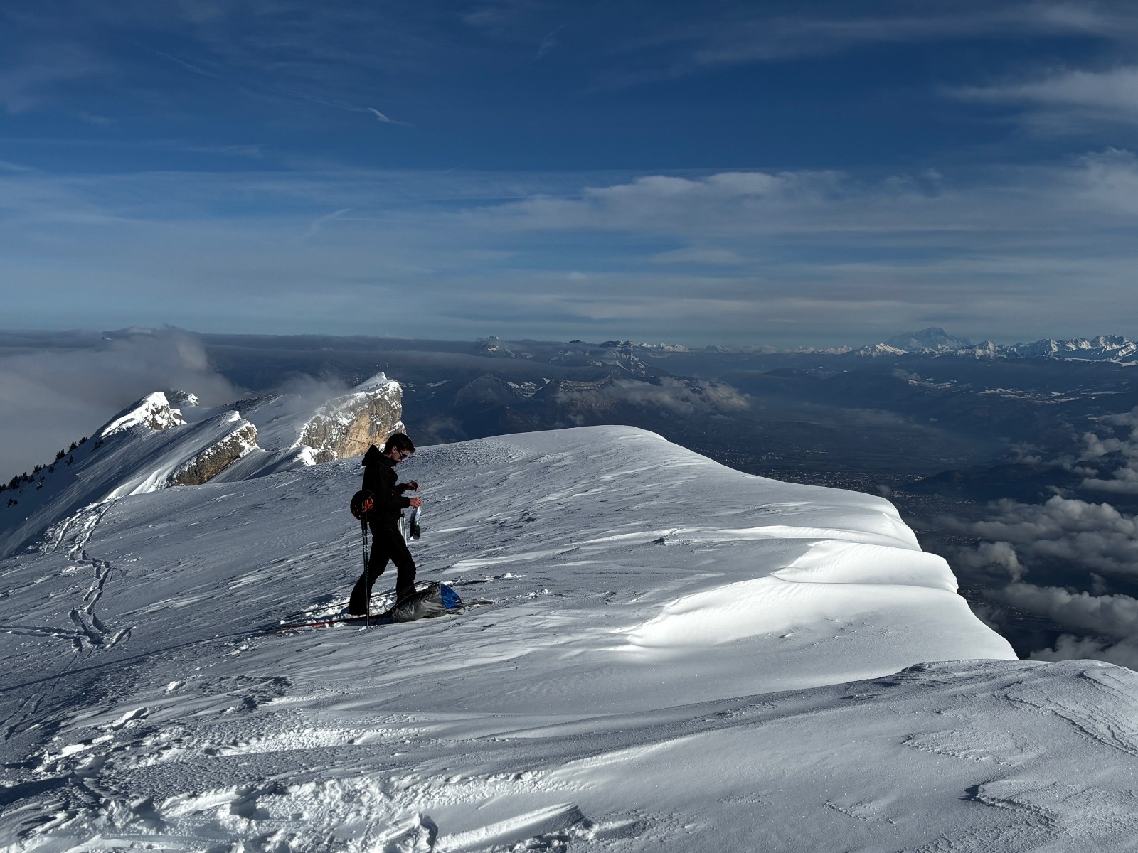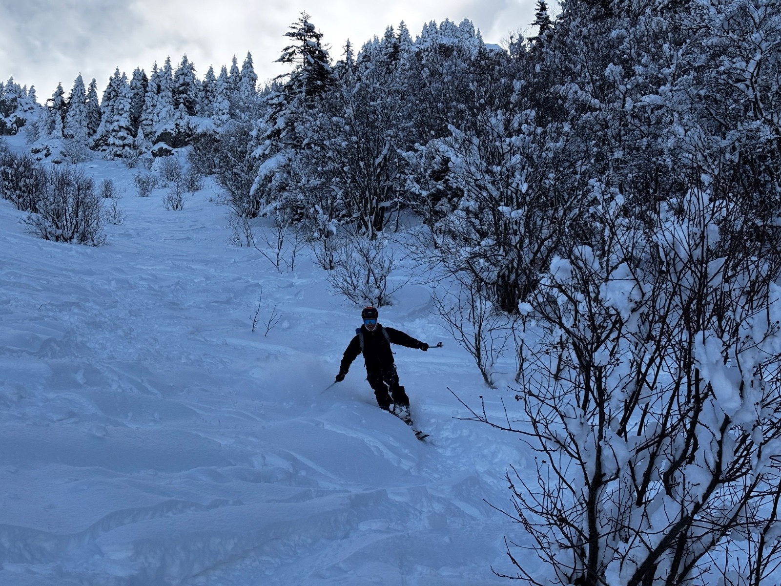 Météo/températures : meilleur qu'annoncé, finalement le plafond est haut et les visibilités sont bonnes. Pas de vent, il fait chaud dans la combe, avec cette trace trop raide... Le ciel bleu arrive ensuite en mi-matinée.