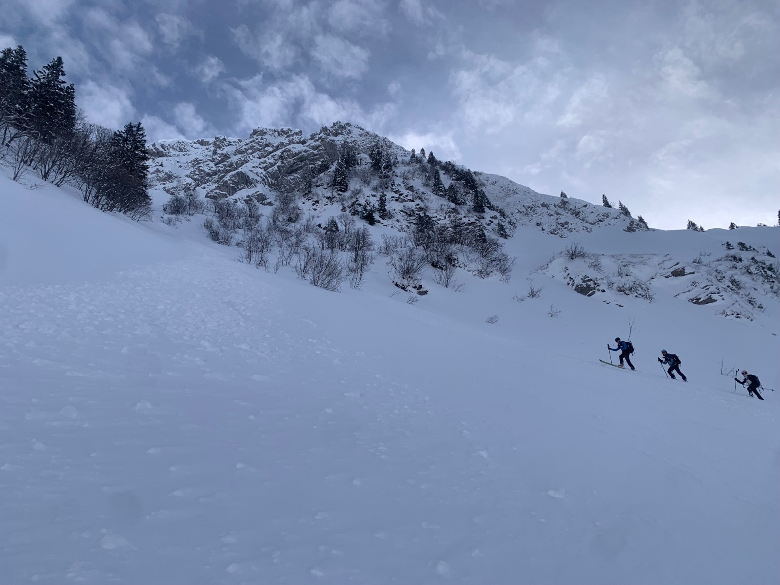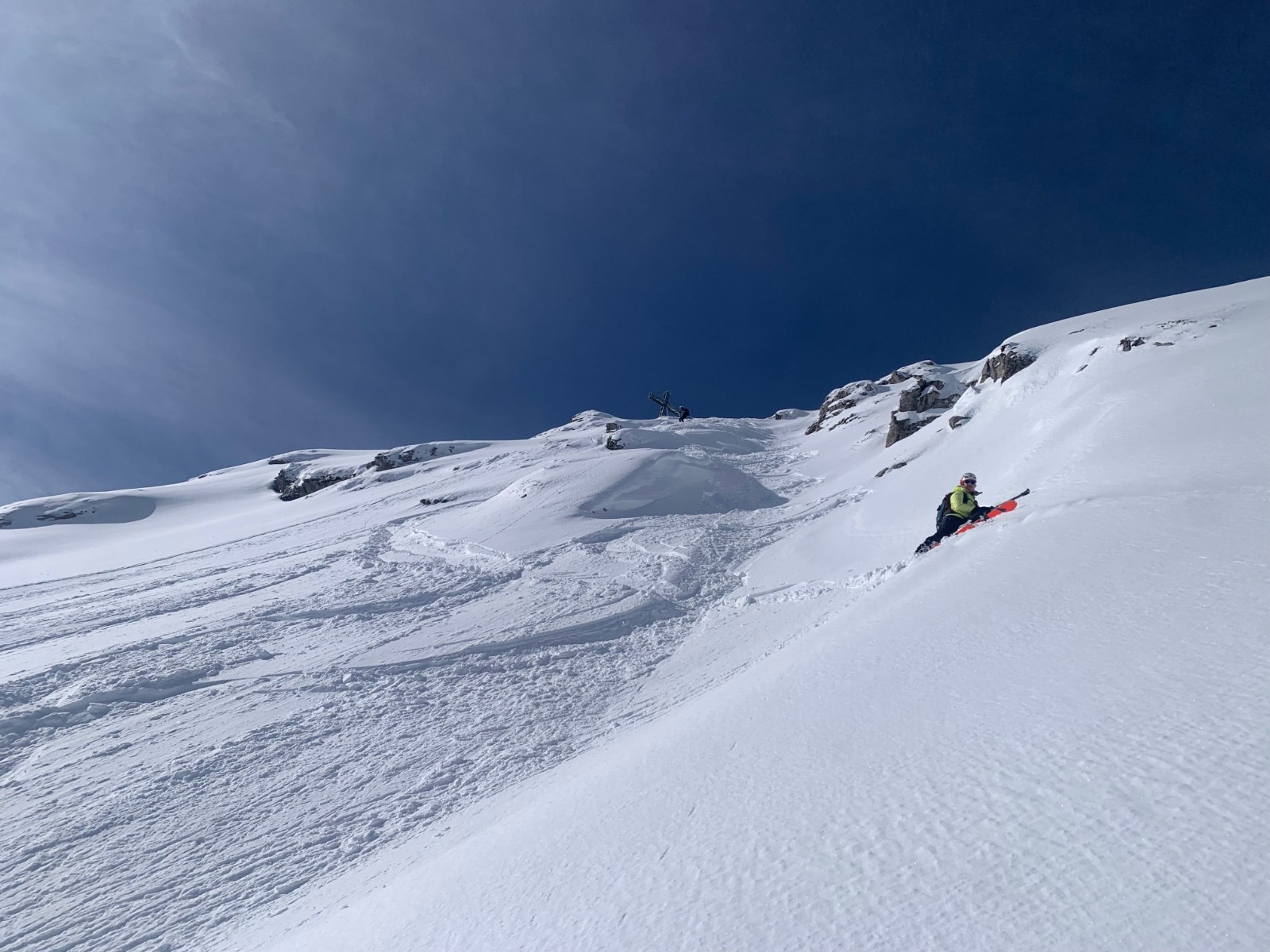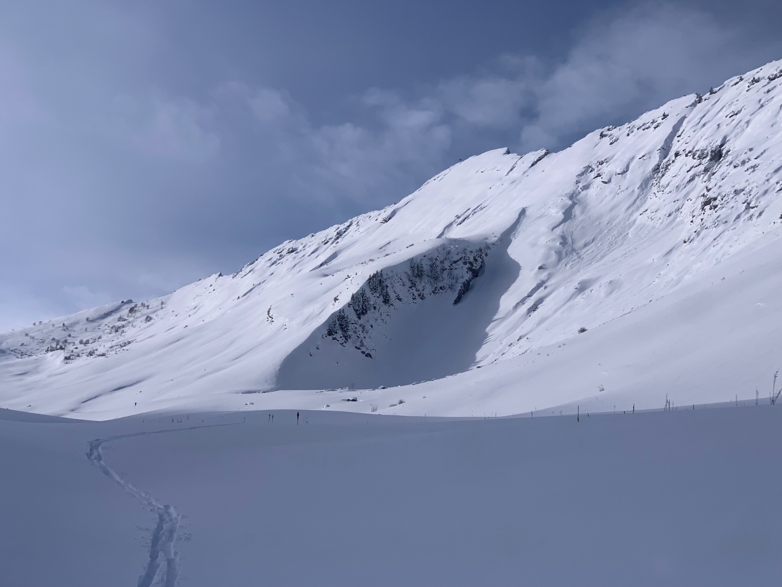 Ensuite on monte jusqu’au dérobé à ski dans la combe nord tout poudre. Grosse accumulation au pied du couloir, on abandonne de le remonter qui plus es avec une tel épaisseur de fraîche!