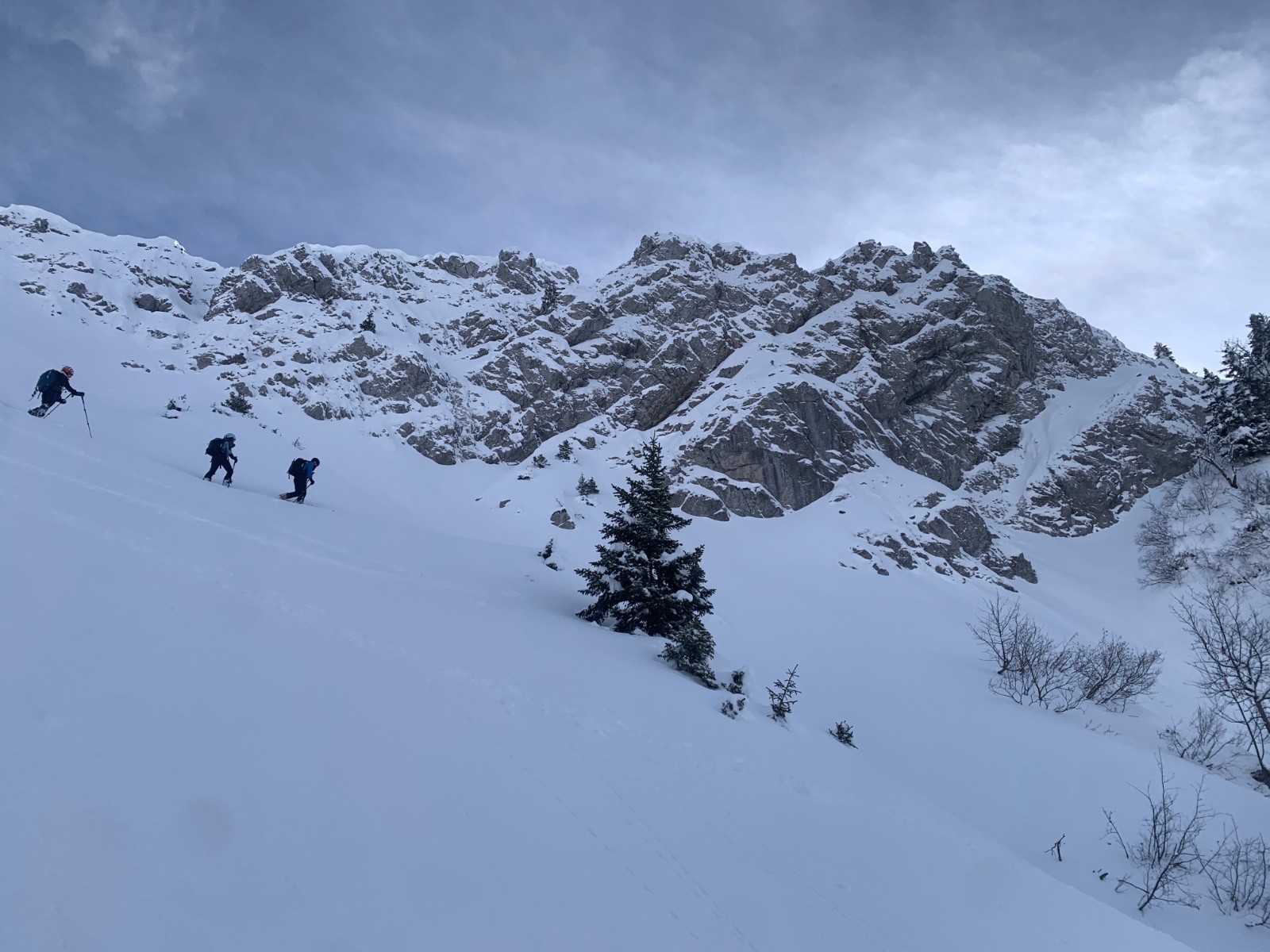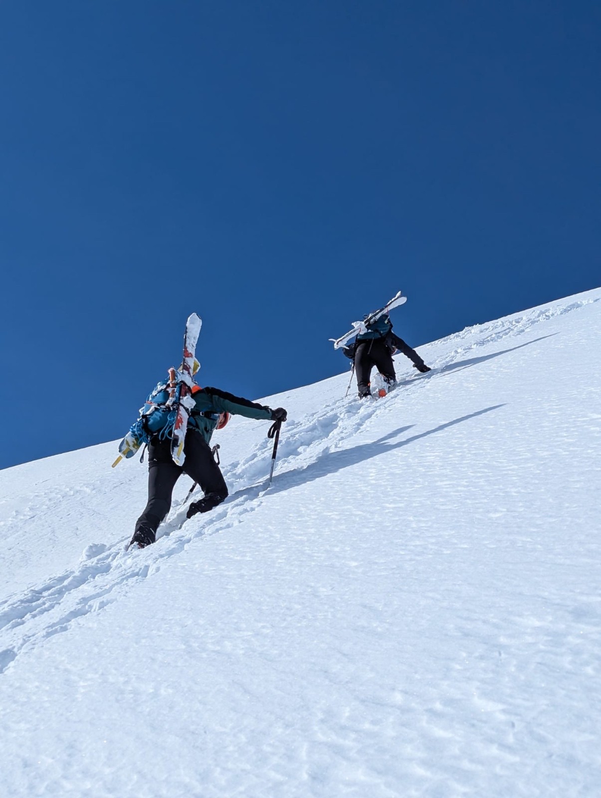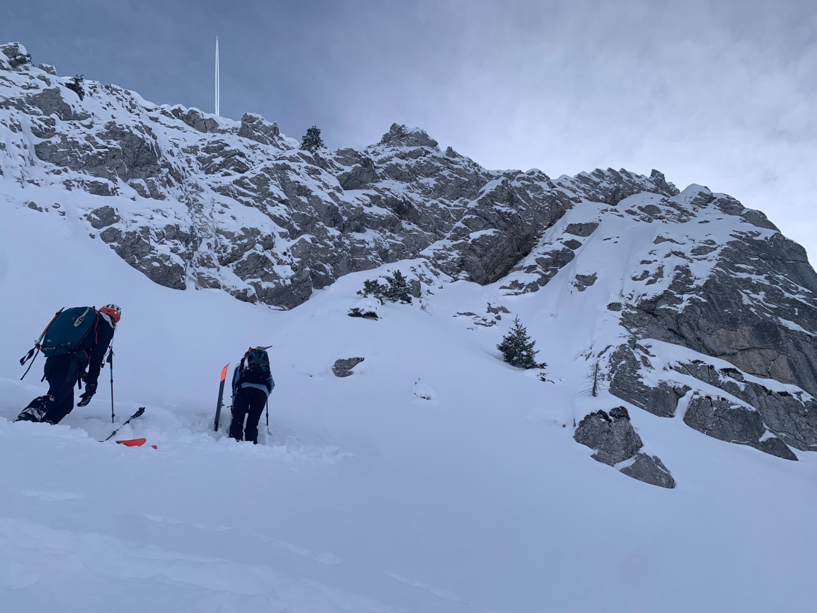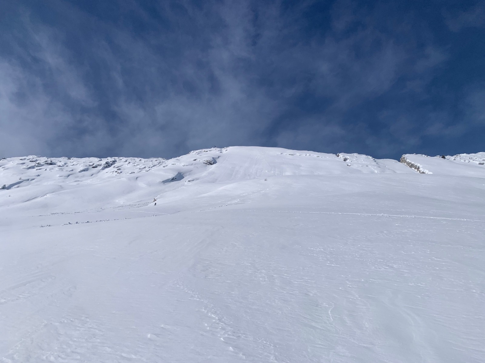 Ensuite on monte jusqu’au dérobé à ski dans la combe nord tout poudre. Grosse accumulation au pied du couloir, on abandonne de le remonter qui plus es avec une tel épaisseur de fraîche!