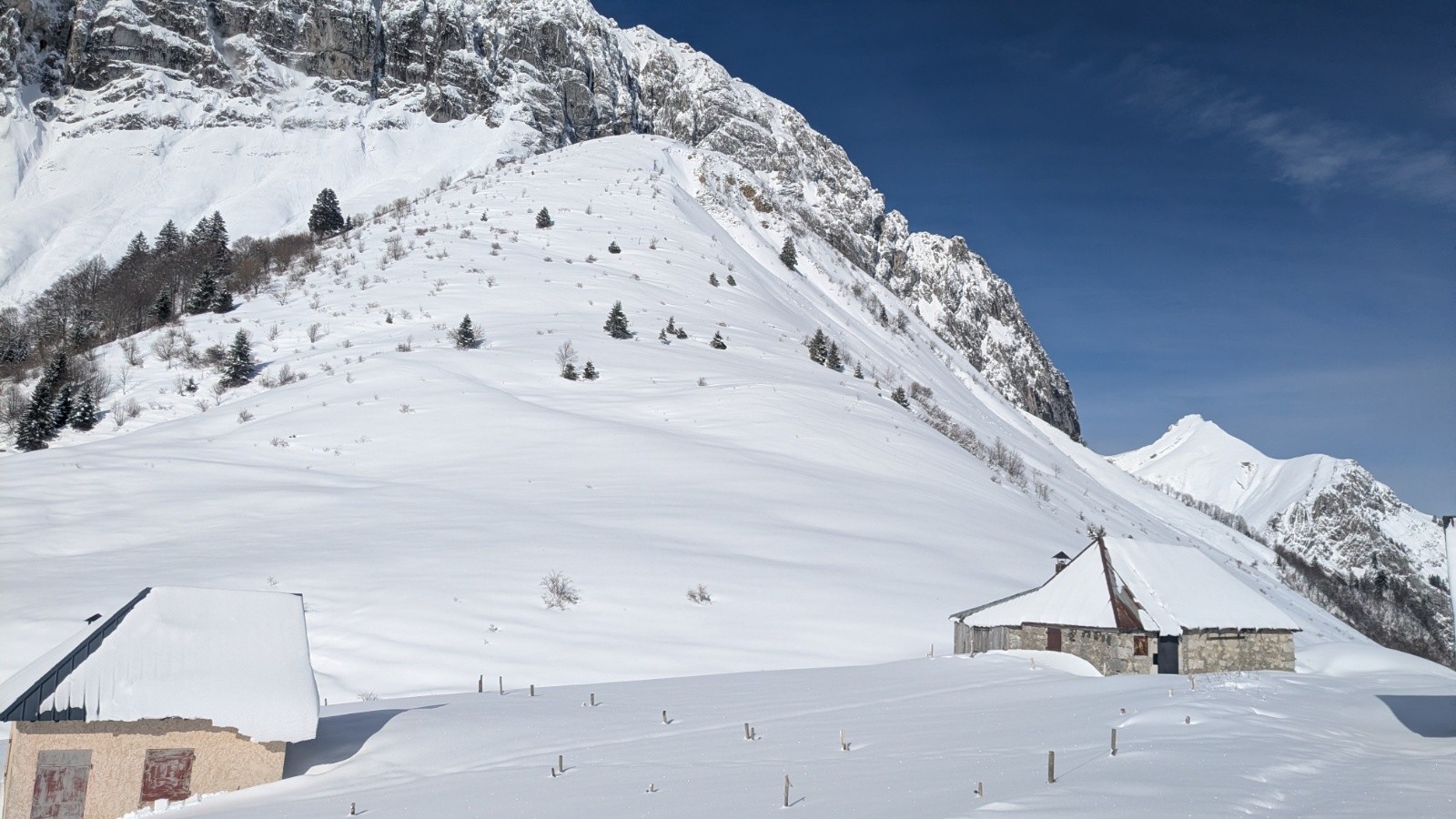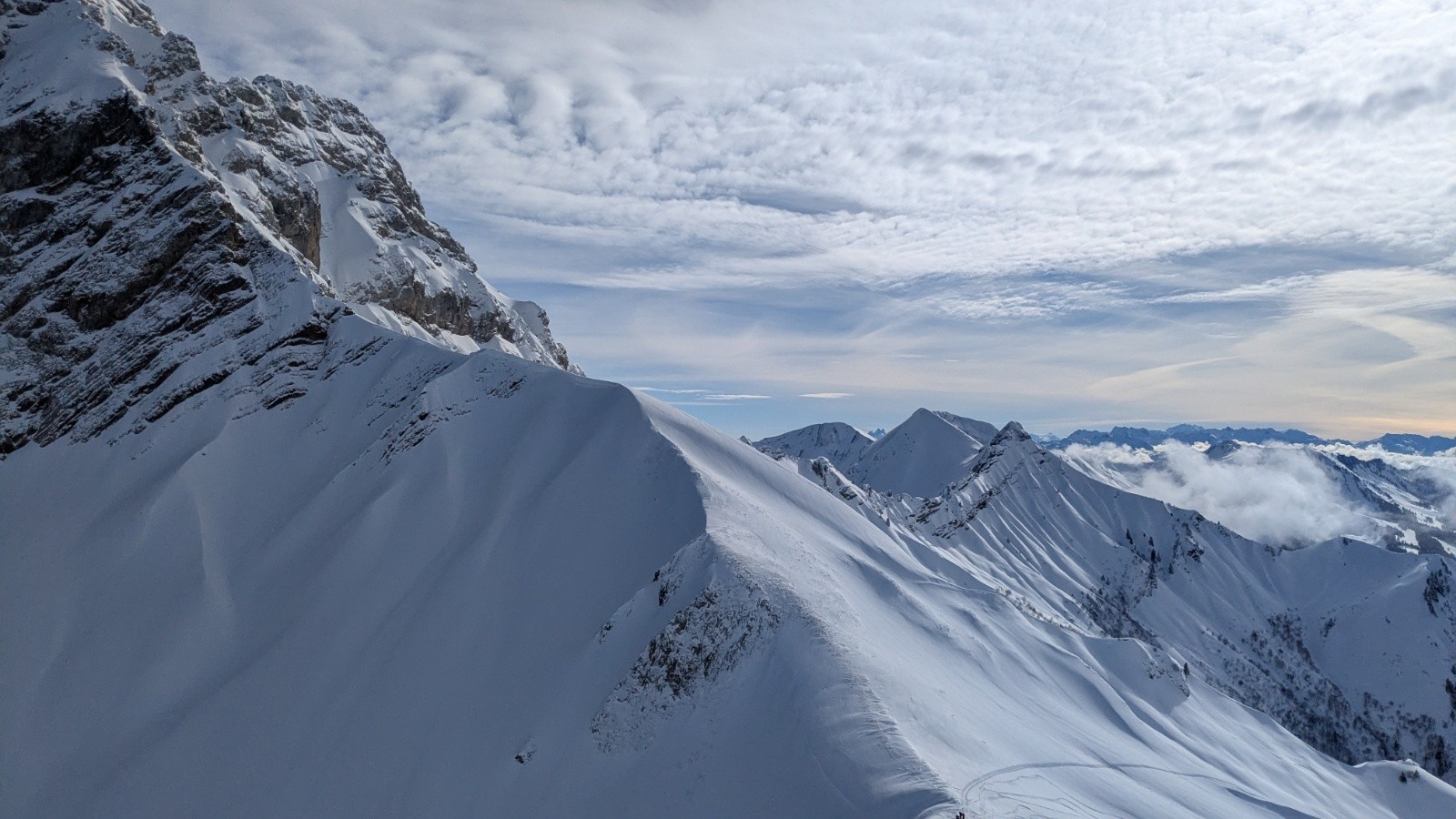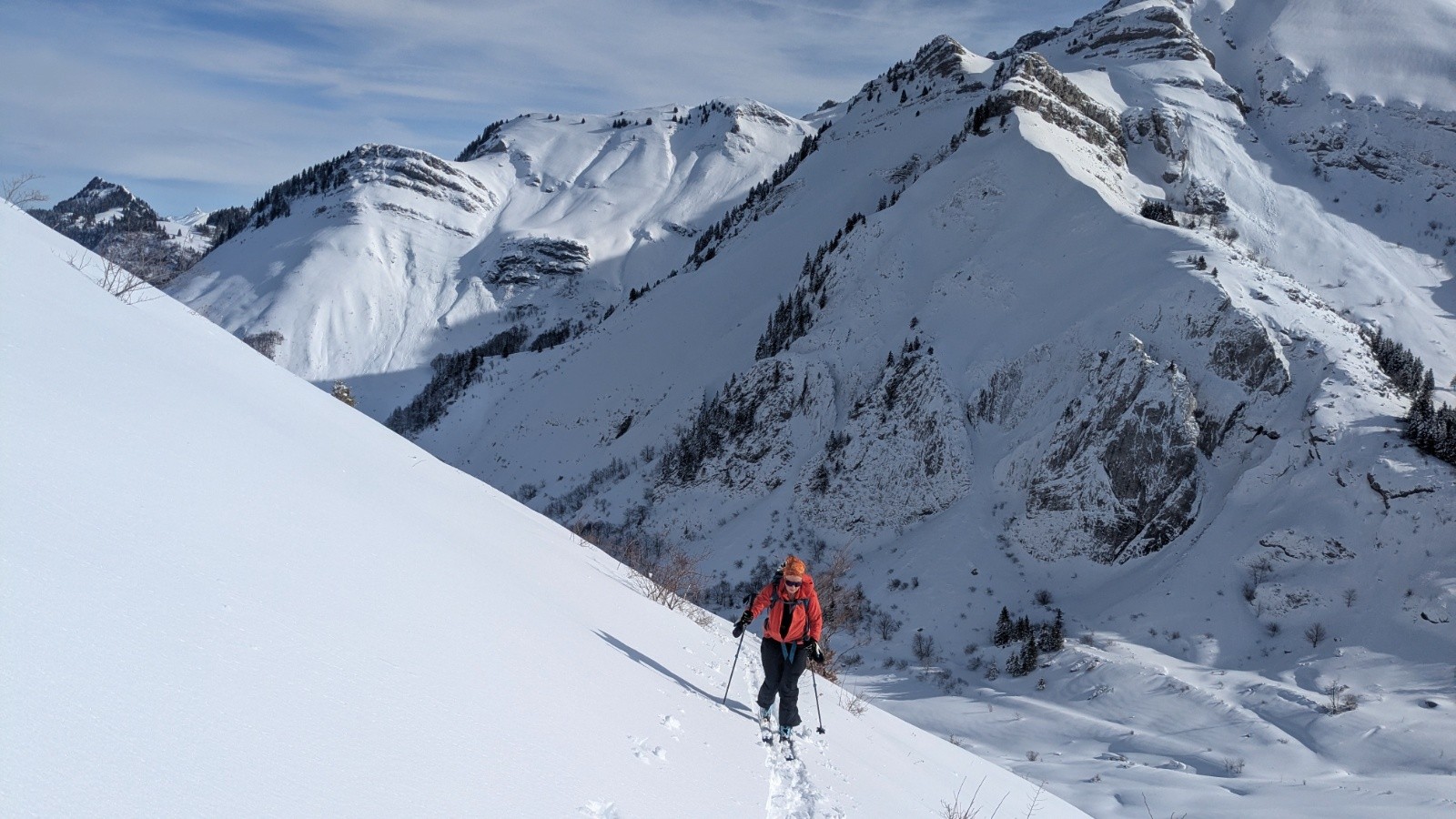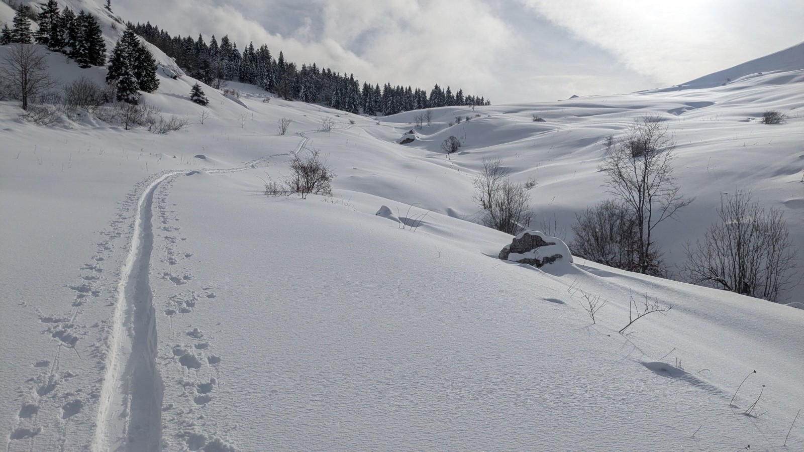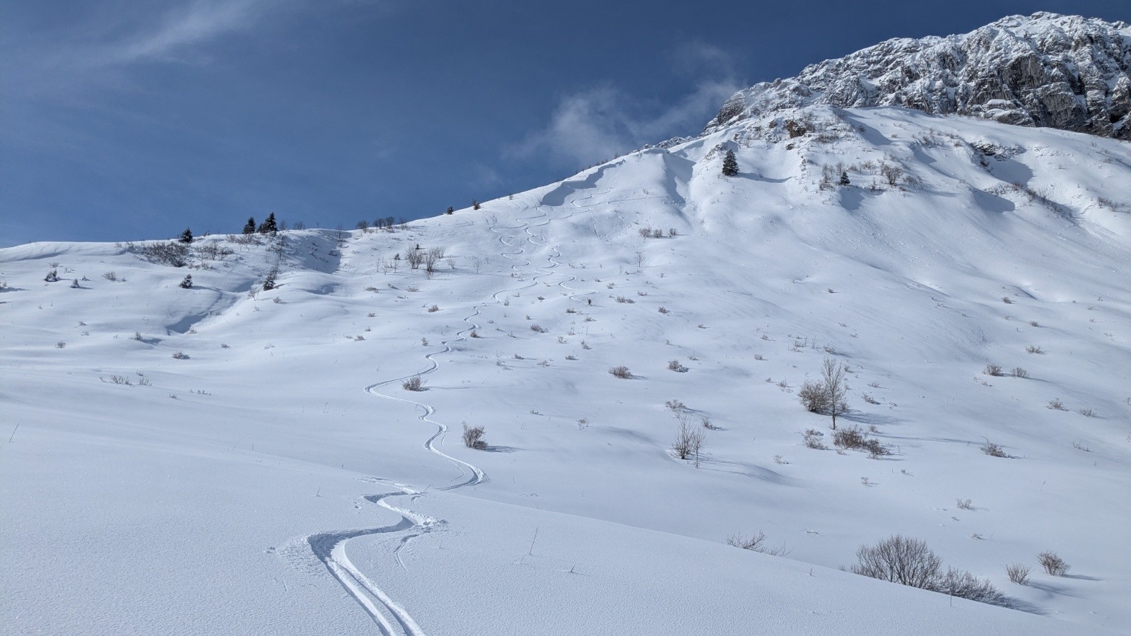 Conditions pour le ski : Juste ce qu'il faut au parking. Peu de neige sous 1300 pusi ça augmente! En gros de 20cm à 40cm de poudreuse un peu dense posé sur un fond humide bien ferme. Sous les croupes , y a pas grand chose. En S ça chauffe, quelques purges. Du bon ski en W, N et même en E ce matin.