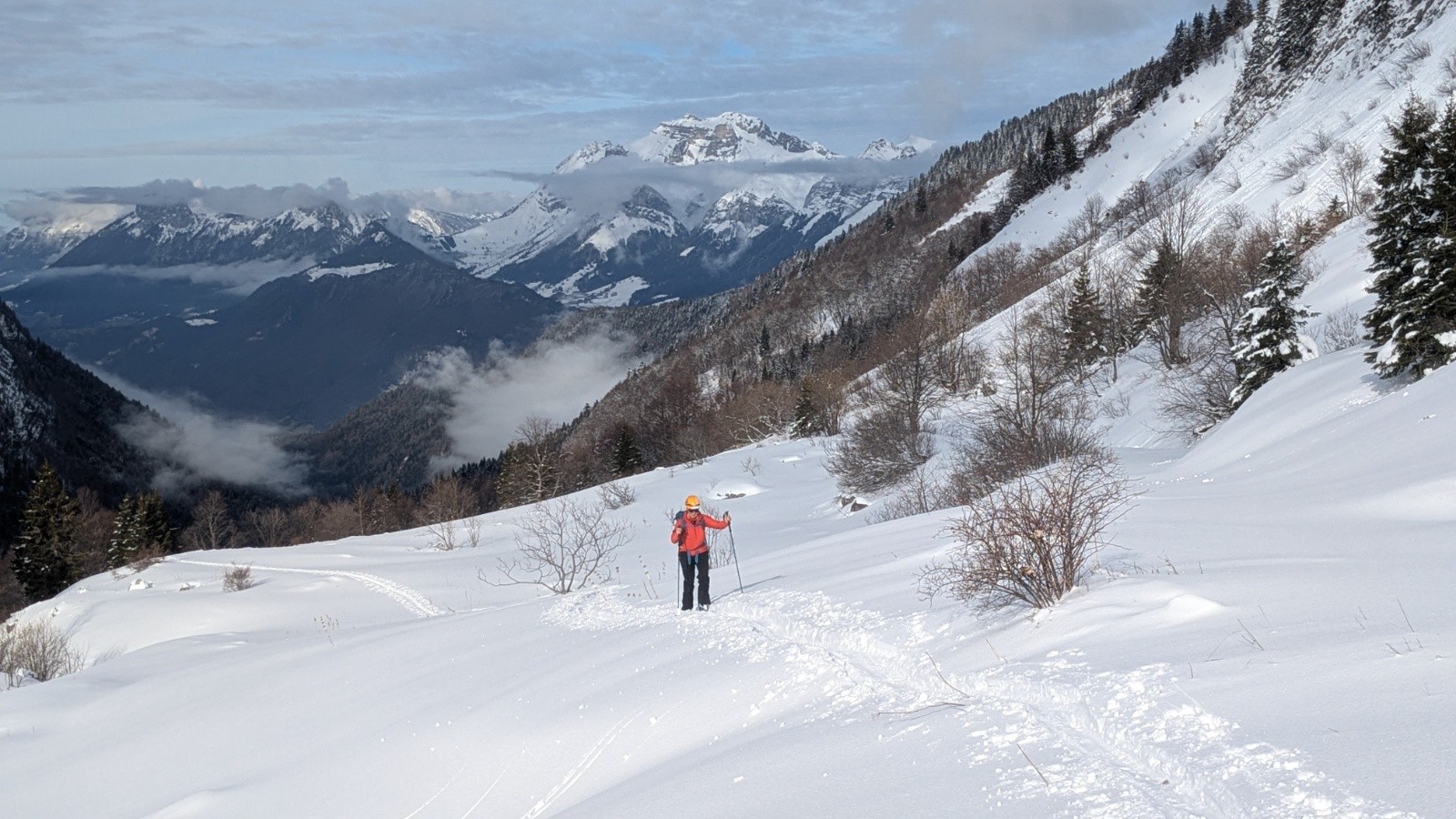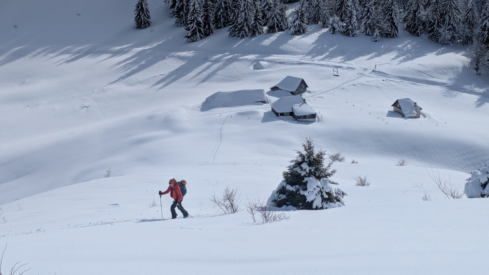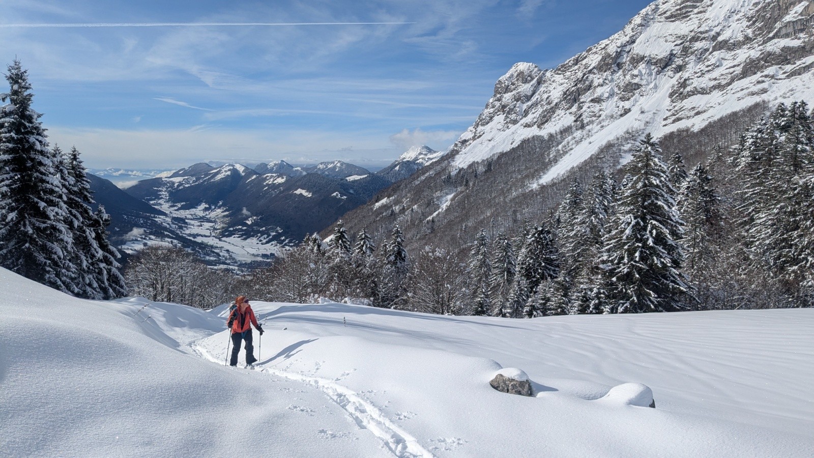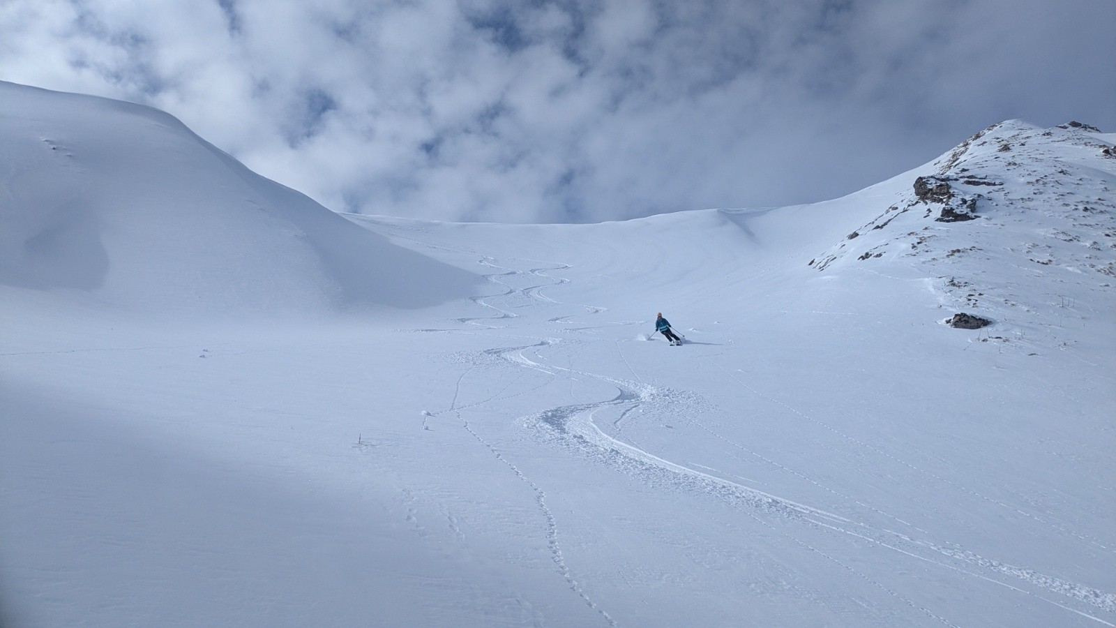Conditions pour le ski : Juste ce qu'il faut au parking. Peu de neige sous 1300 pusi ça augmente! En gros de 20cm à 40cm de poudreuse un peu dense posé sur un fond humide bien ferme. Sous les croupes , y a pas grand chose. En S ça chauffe, quelques purges. Du bon ski en W, N et même en E ce matin.