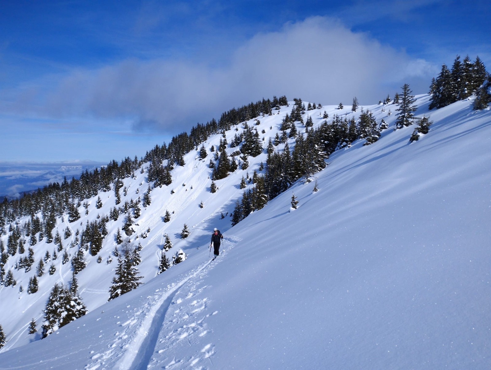 Itinéraire suivi : sommet du grand rocher, descentes un peu après le sommet en ouest, dernière descente en Est (neige croutée au soleil au début de la descente puis poudreuse)